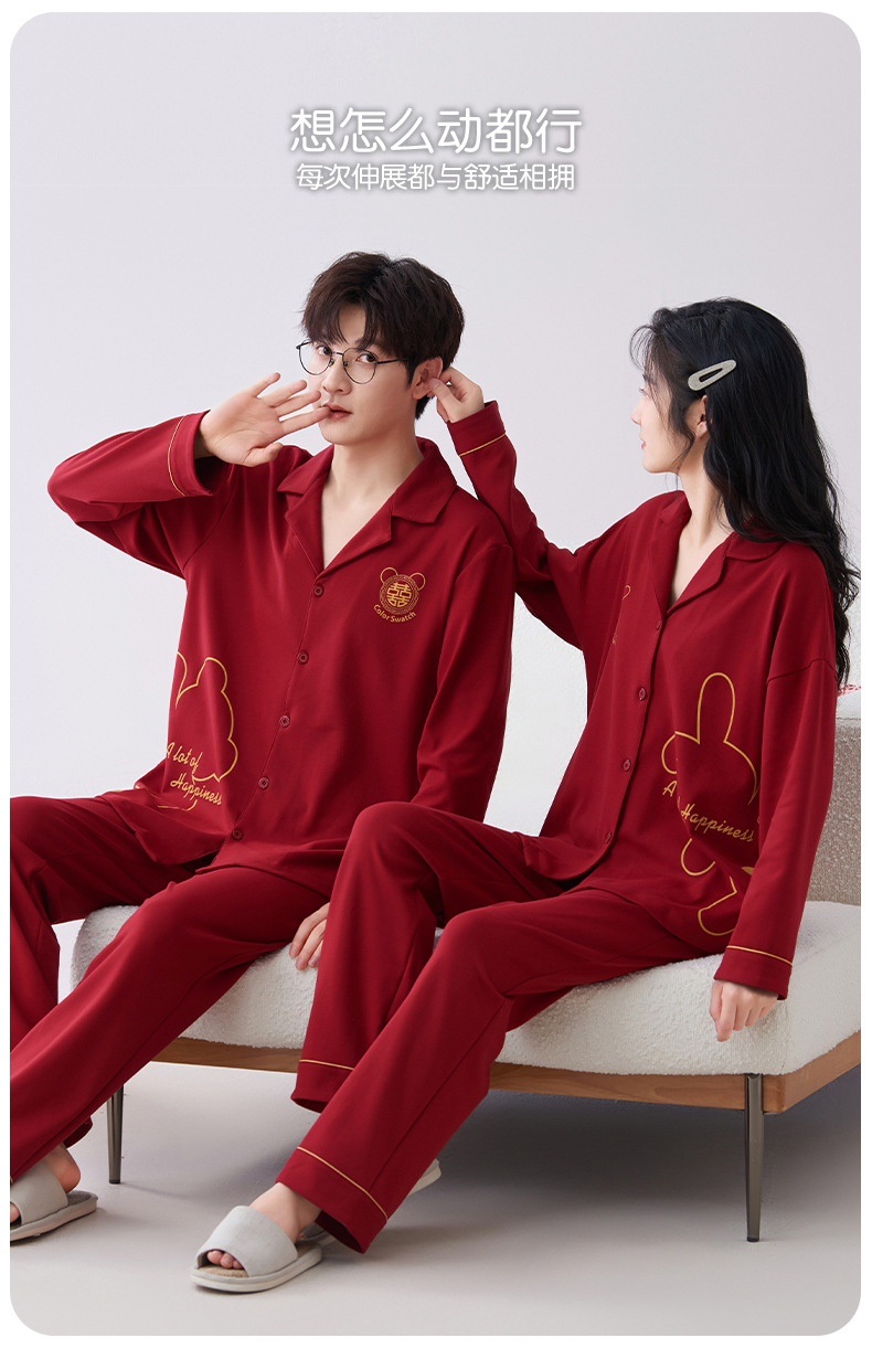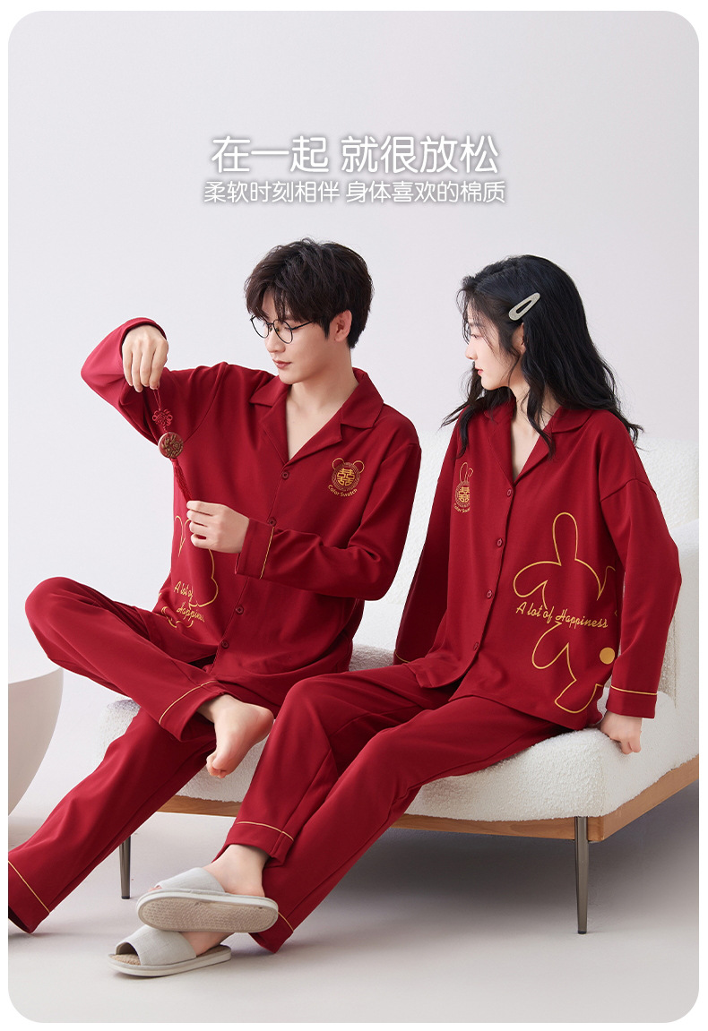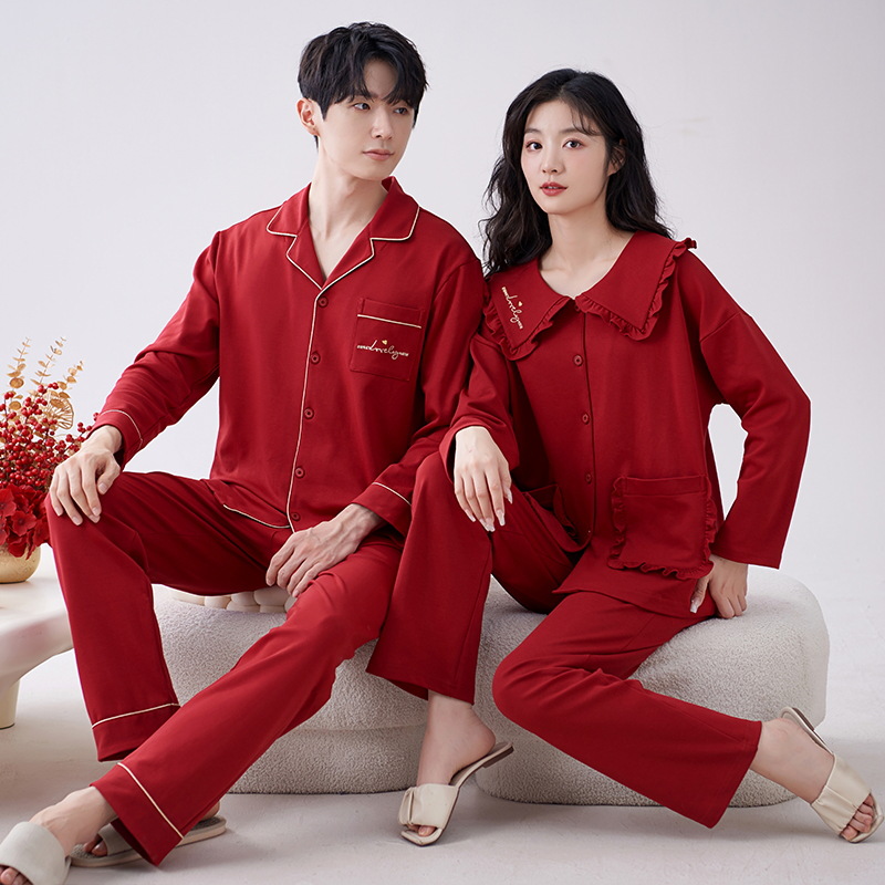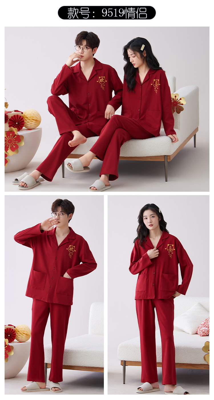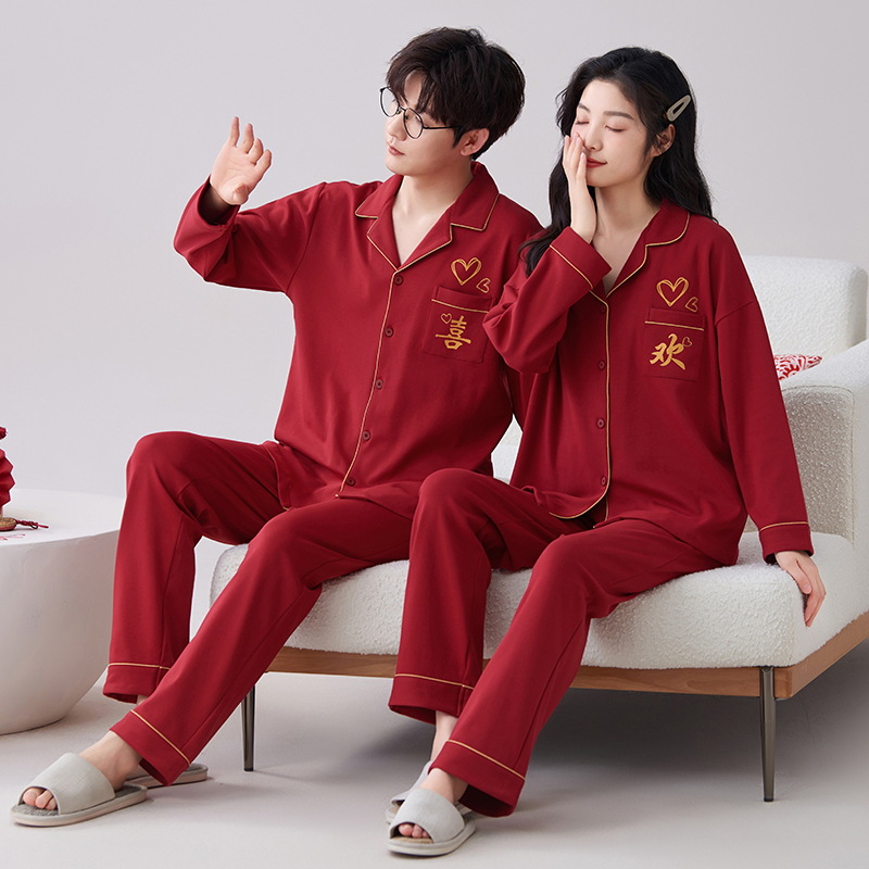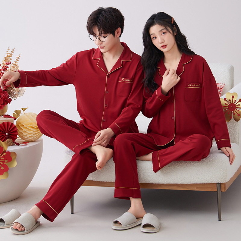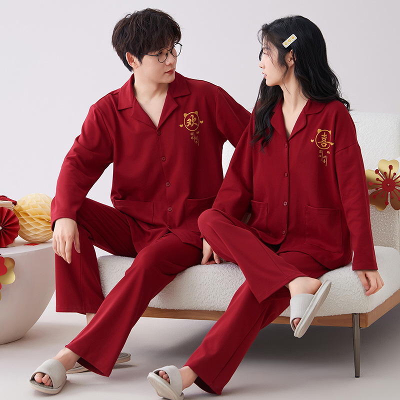 7A 항균 순면 커플 잠옷 결혼식 신혼년 레드 2024 새 세트 봄과 가을 가정 옷스토어 가기