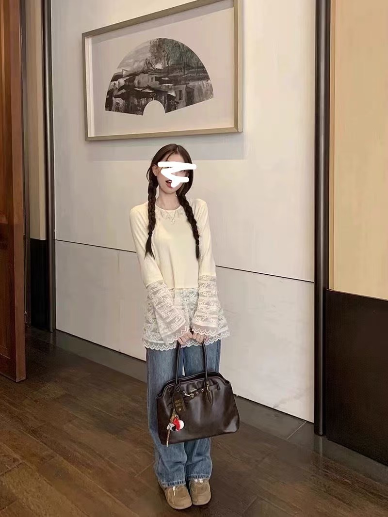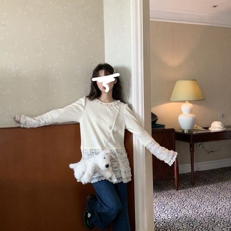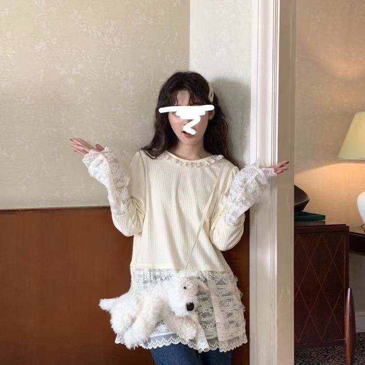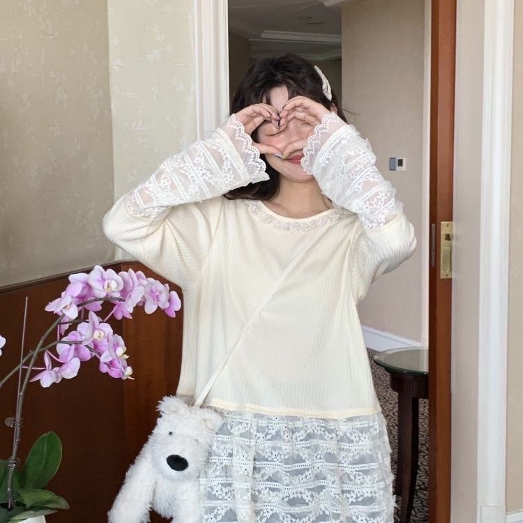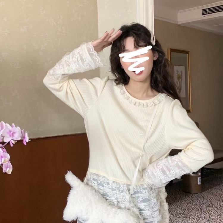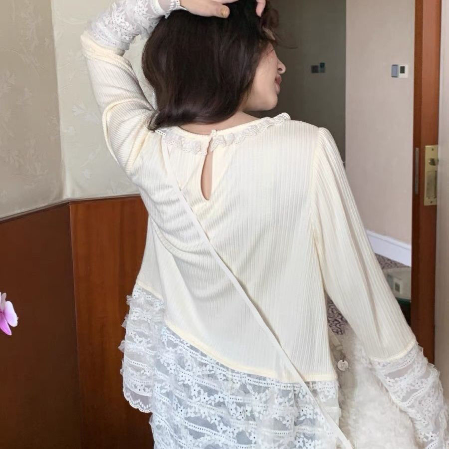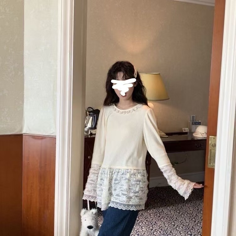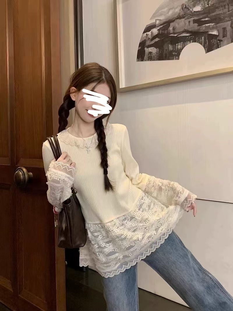 달콤한 소녀 레이스베이스 셔츠 여성의 가을과 겨울 내부 긴 소매 틈새 디자인 바느질 머리 꼭대기 착용