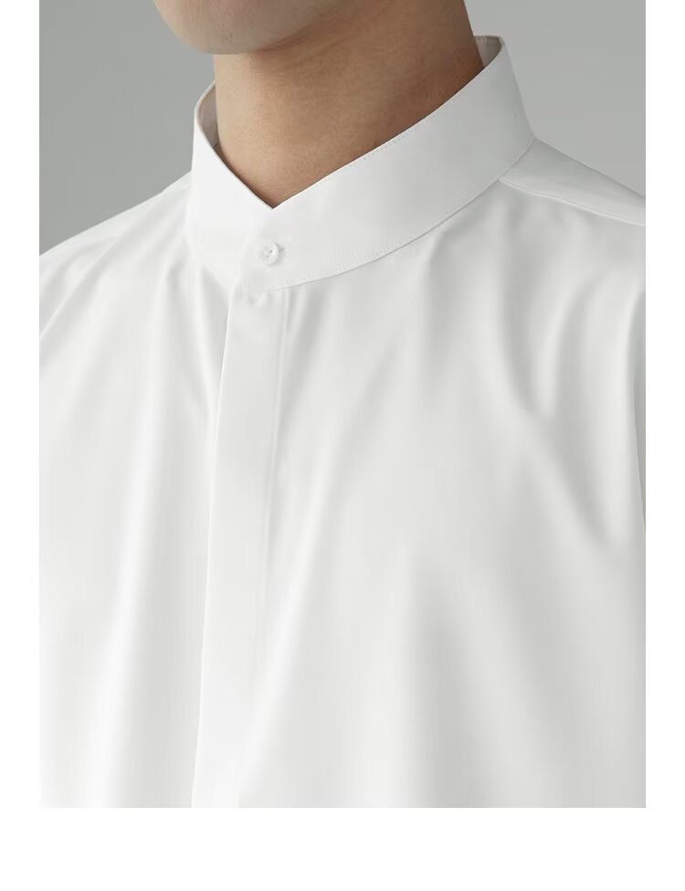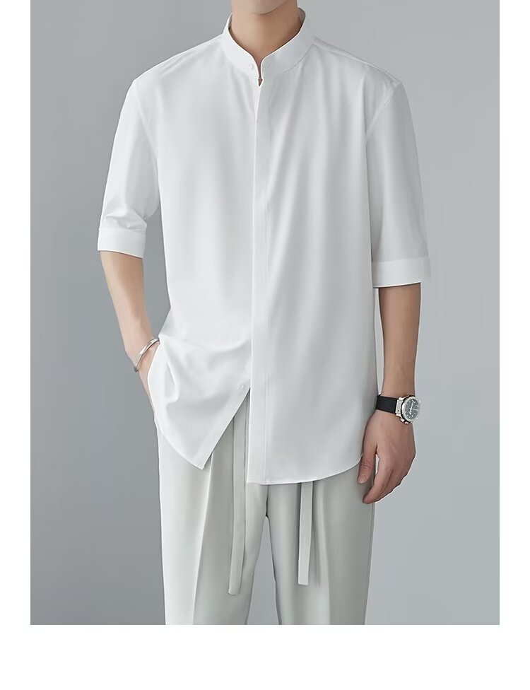 새로운 중국 스타일 수직 칼라 짧은 소매 셔츠 남자의 여름 새로운 틈새 셔츠 고급 아이스 실크 포장 된 중간 소매 셔츠