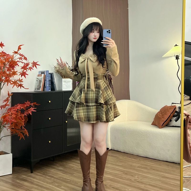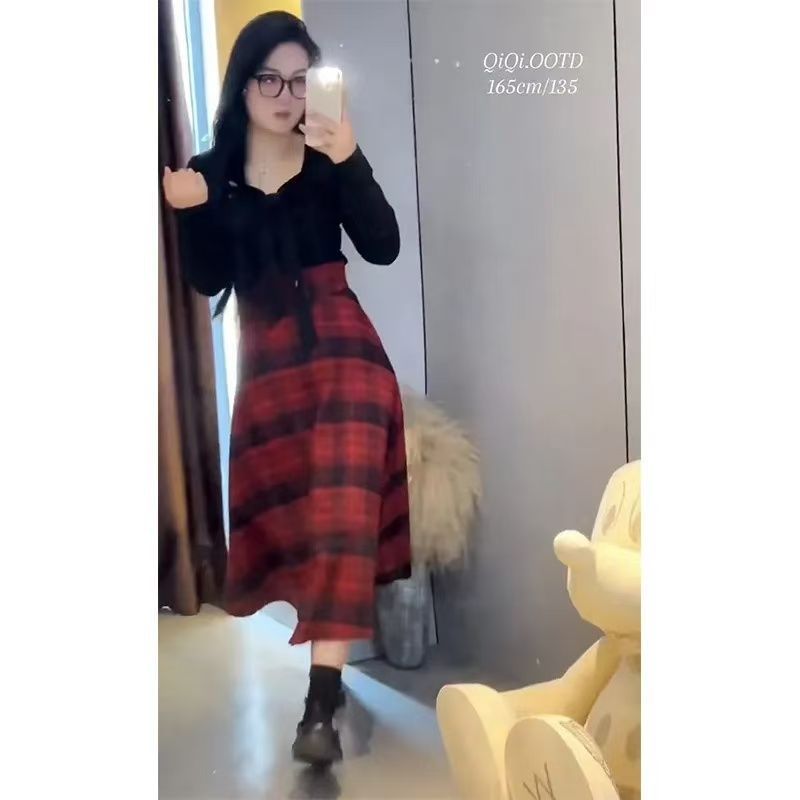 플러스 사이즈 통통녀 한국식 레트로 대학 세트 가을과 겨울 슬리밍 여성용 세련된 격자 무늬 탑 2 피스 세트스토어 가기