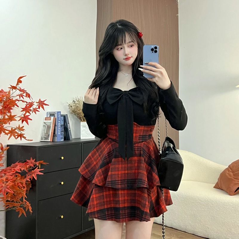 • 검은색 상의 + 빨간색 체크무늬 스커트