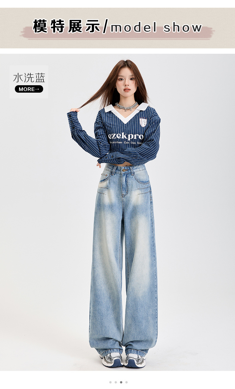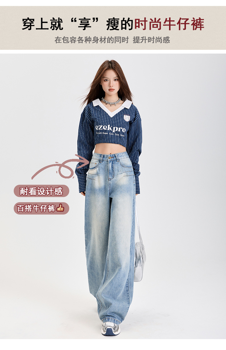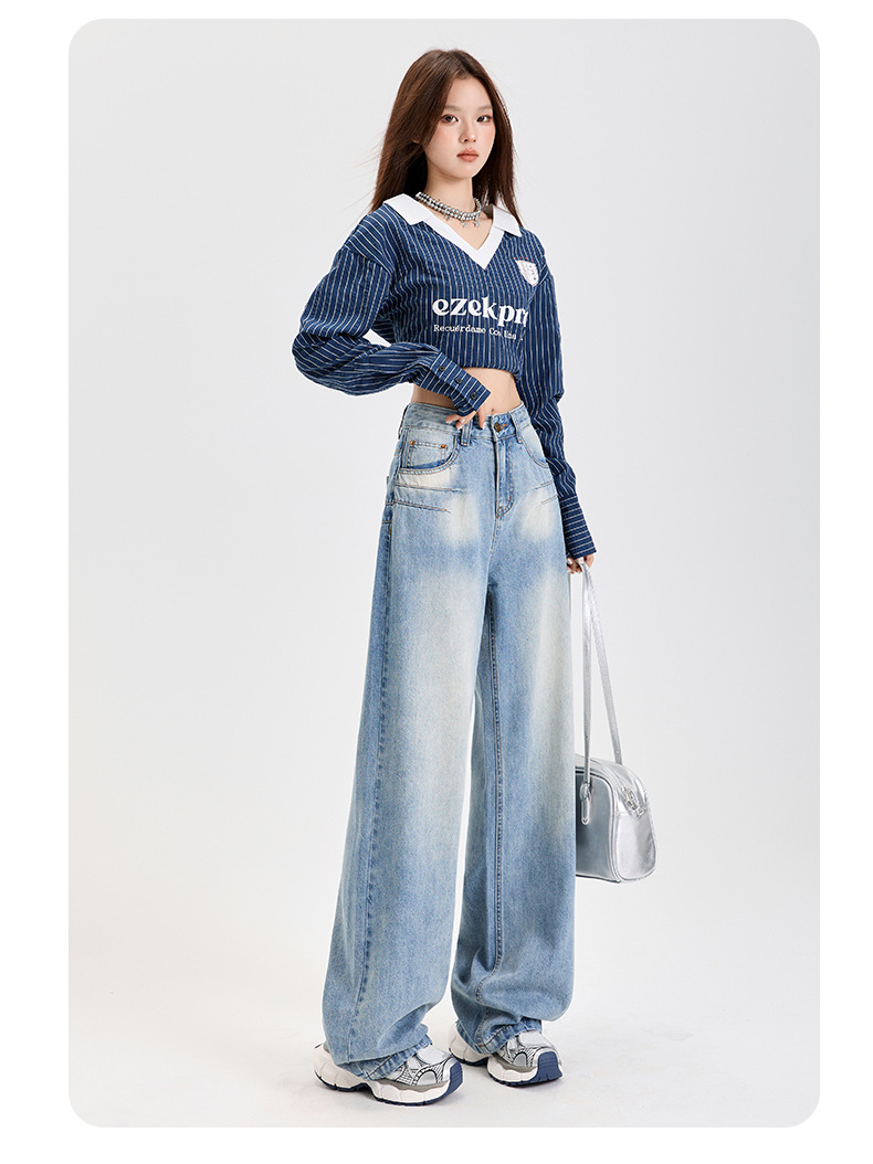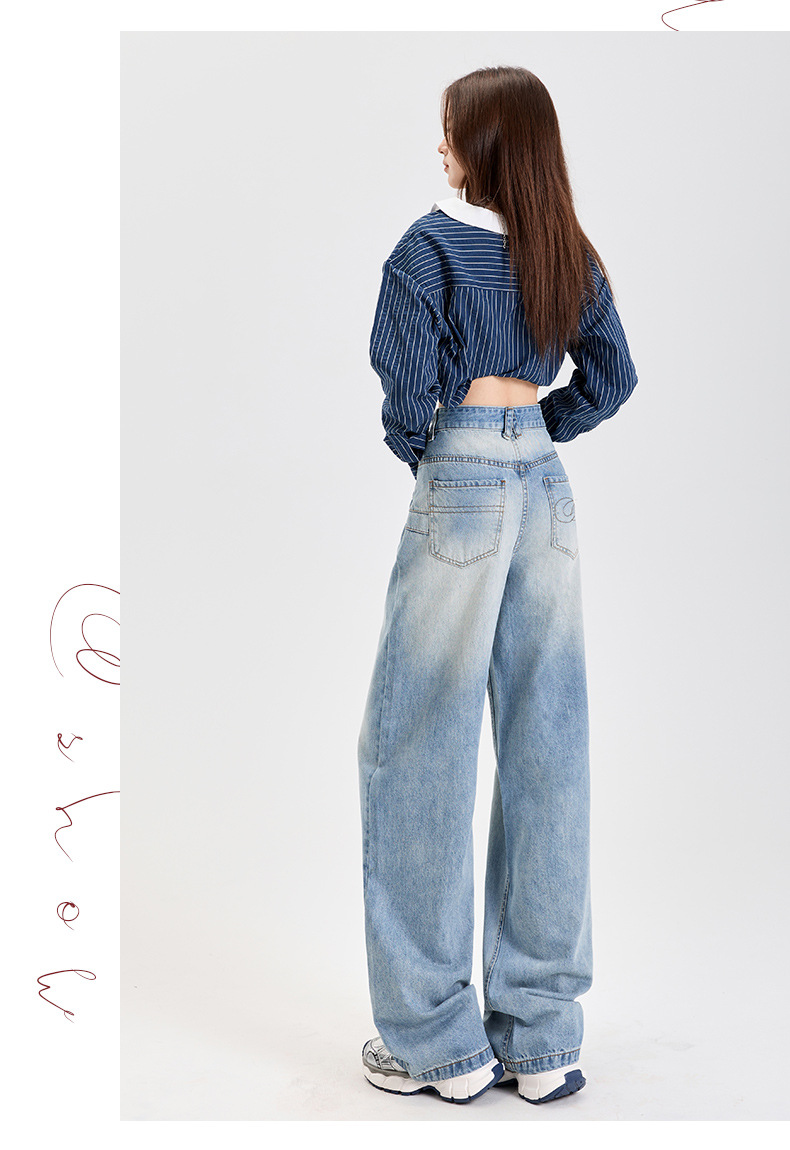 아메리칸 스타일 복고풍 워터 워시 블루 스트레이트 청바지 여성의 2025 봄 새로운 높은 허리 자수 패션 센스 걸레 바지스토어 가기