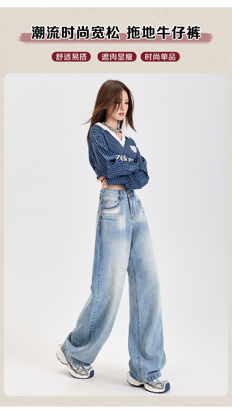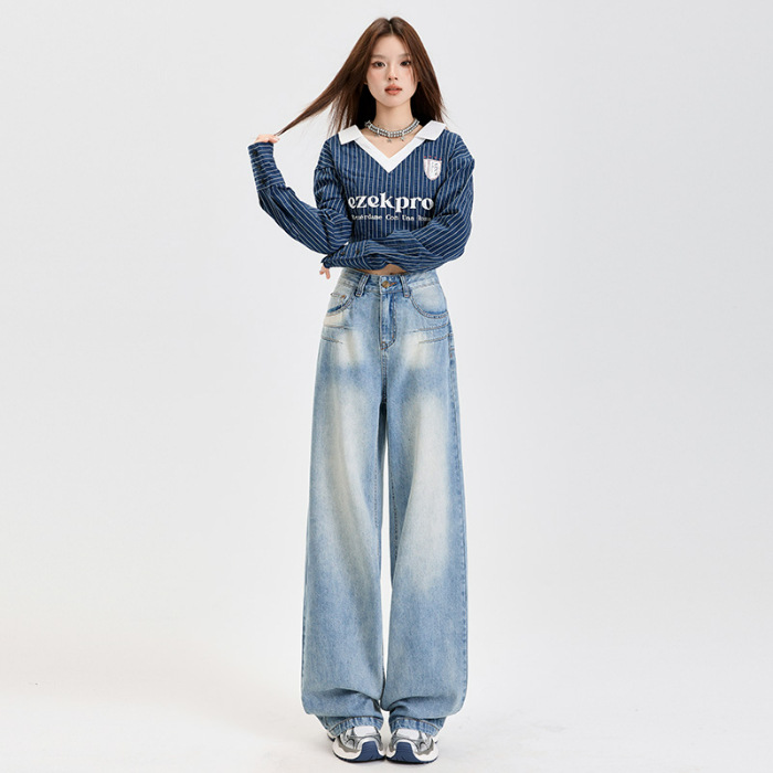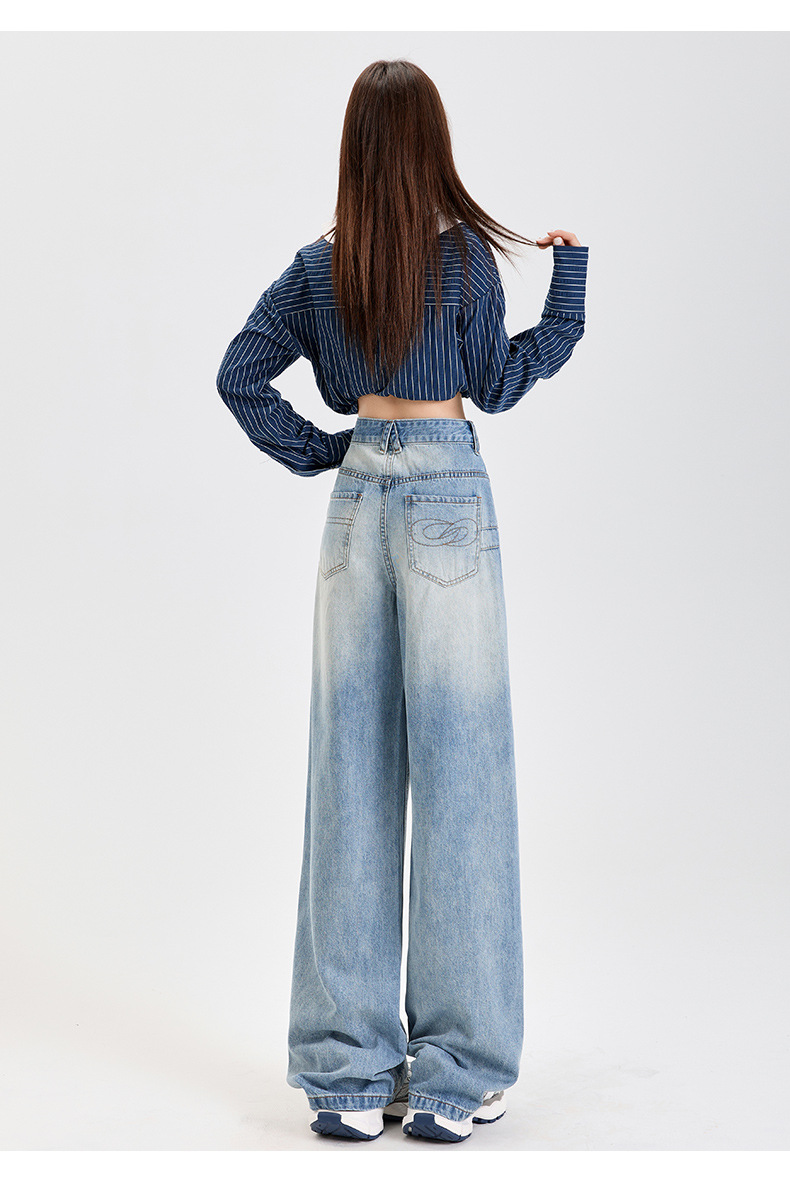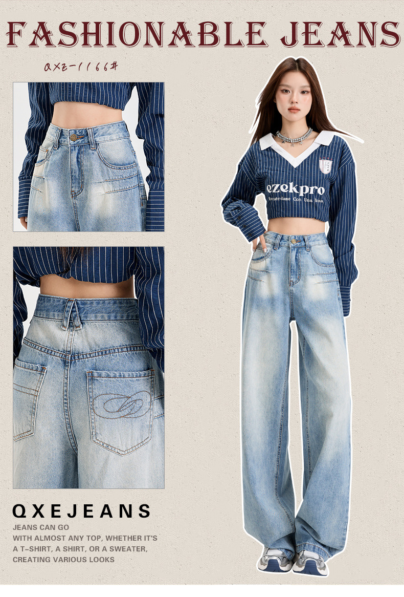 아메리칸 스타일 복고풍 워터 워시 블루 스트레이트 청바지 여성의 2025 봄 새로운 높은 허리 자수 패션 센스 걸레 바지