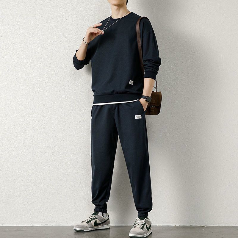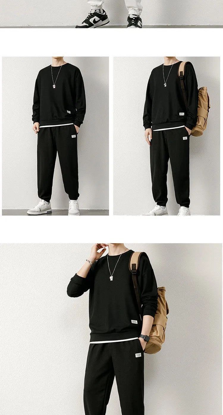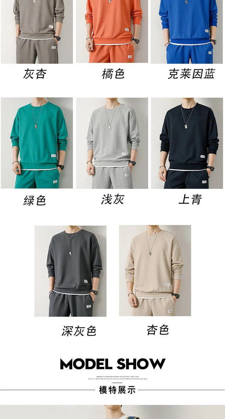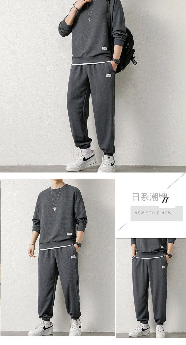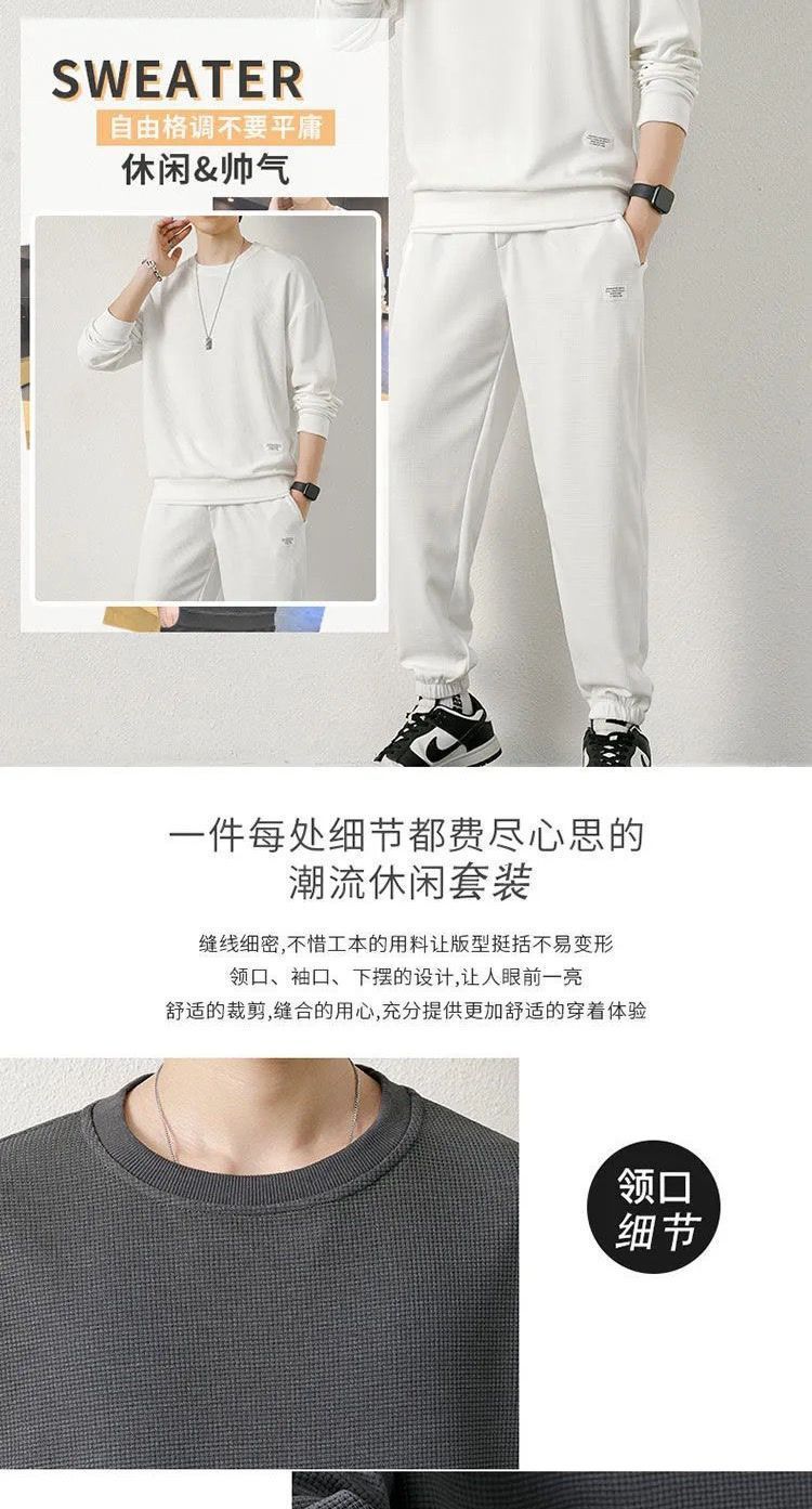 와플 스웨터 세트 남자 가을 겨울 2024 새로운 유행 가짜 투피스 라운드 넥 캐주얼 스포츠 남성 의류 세트스토어 가기
