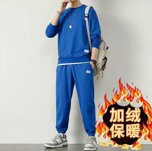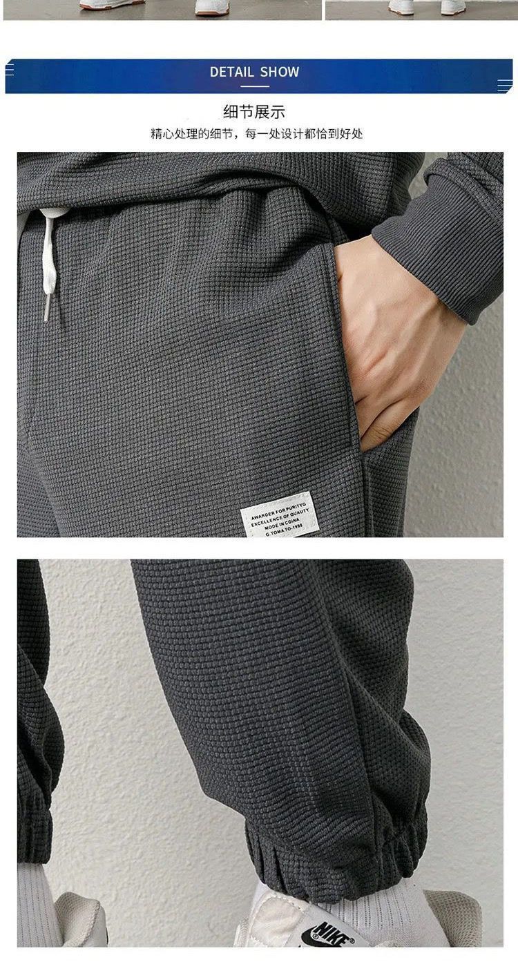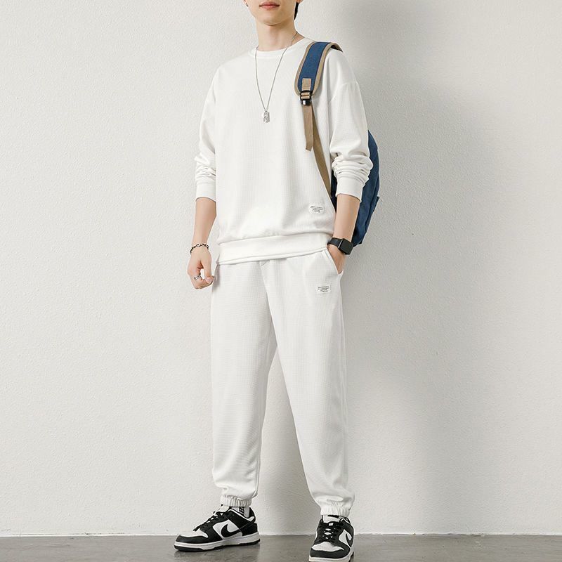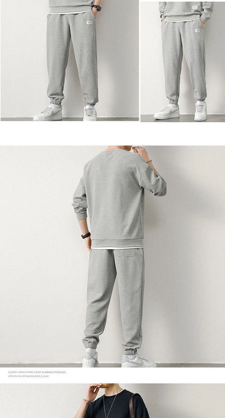 와플 스웨터 세트 남자 가을 겨울 2024 새로운 유행 가짜 투피스 라운드 넥 캐주얼 스포츠 남성 의류 세트