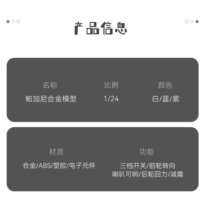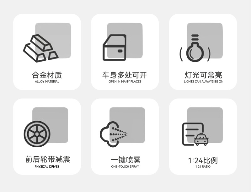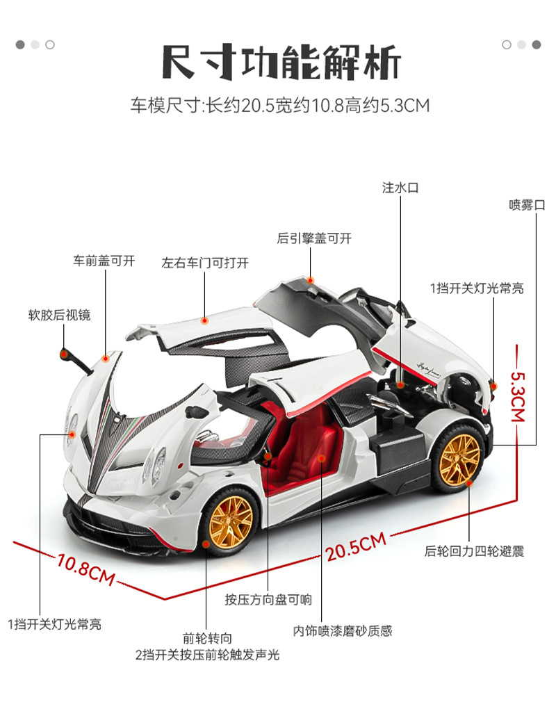 【商品功能】三档开关、声光、回力、开门、全车避震、前轮转向、可喷雾