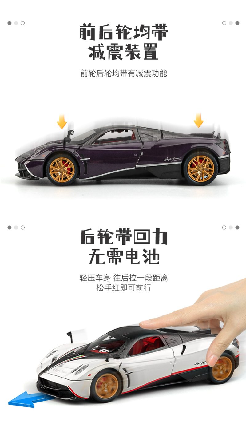 【使用方法】取下车底部绝缘片,轻按压后轮,即有声光,按住车身往回拉,再松手,车子即可向前跑了
