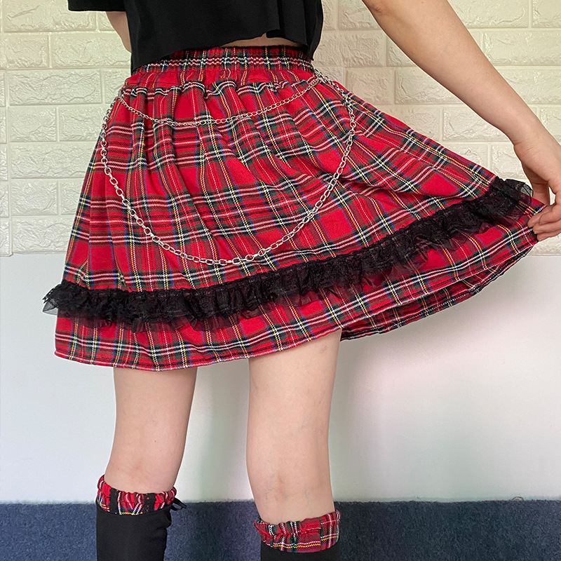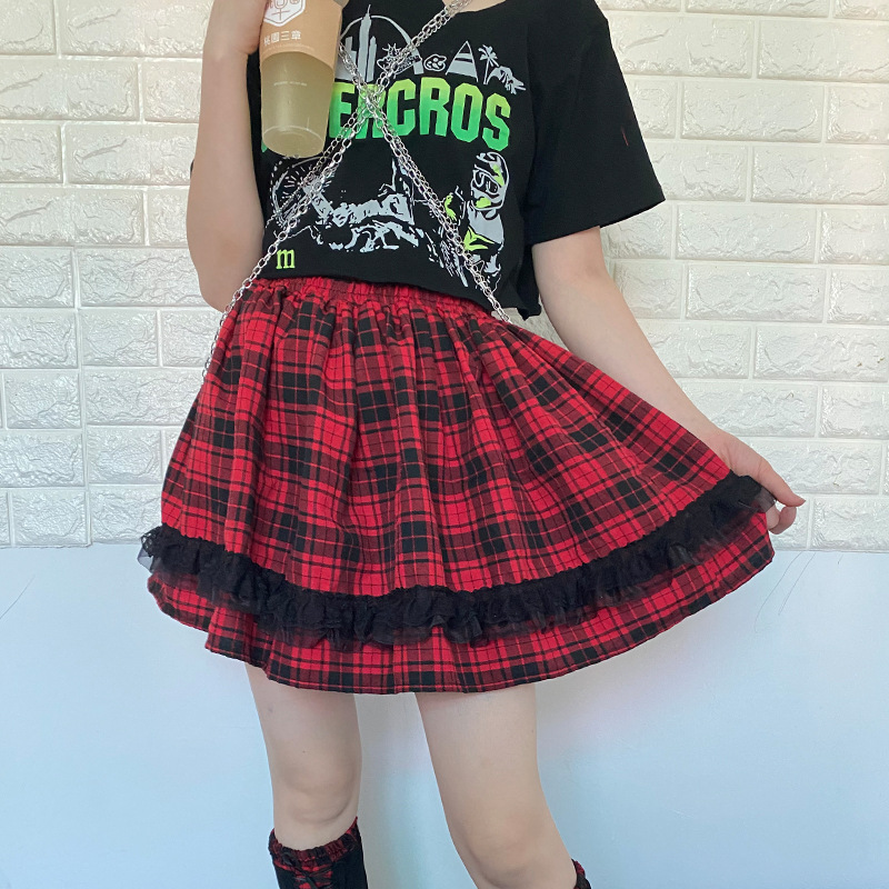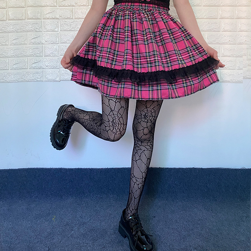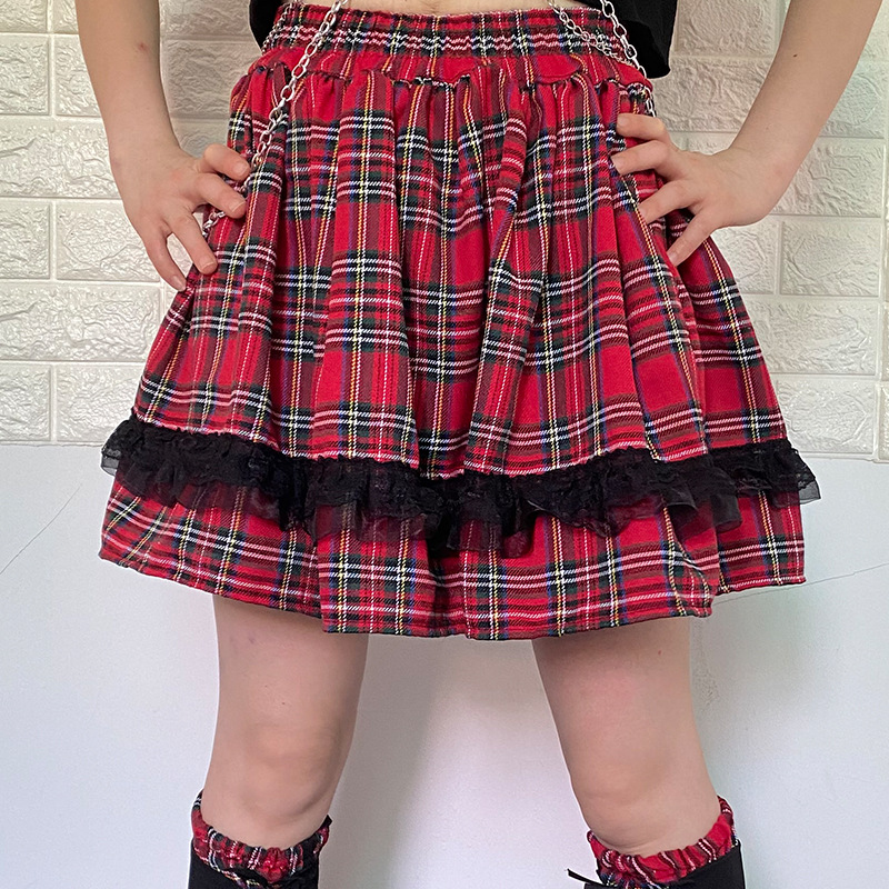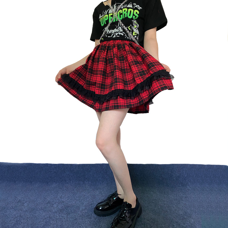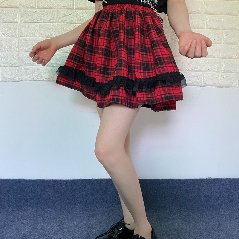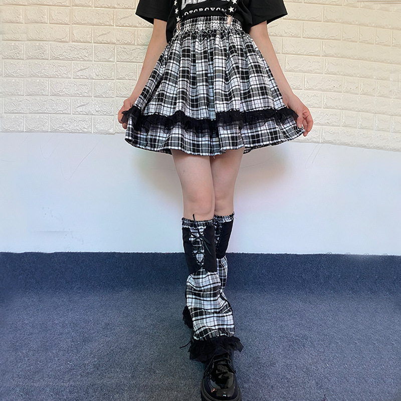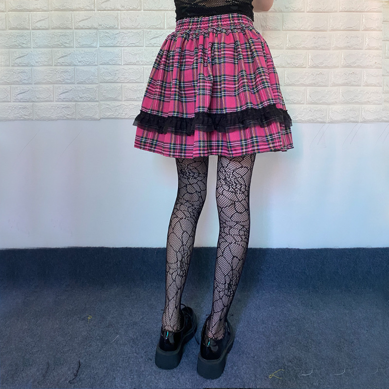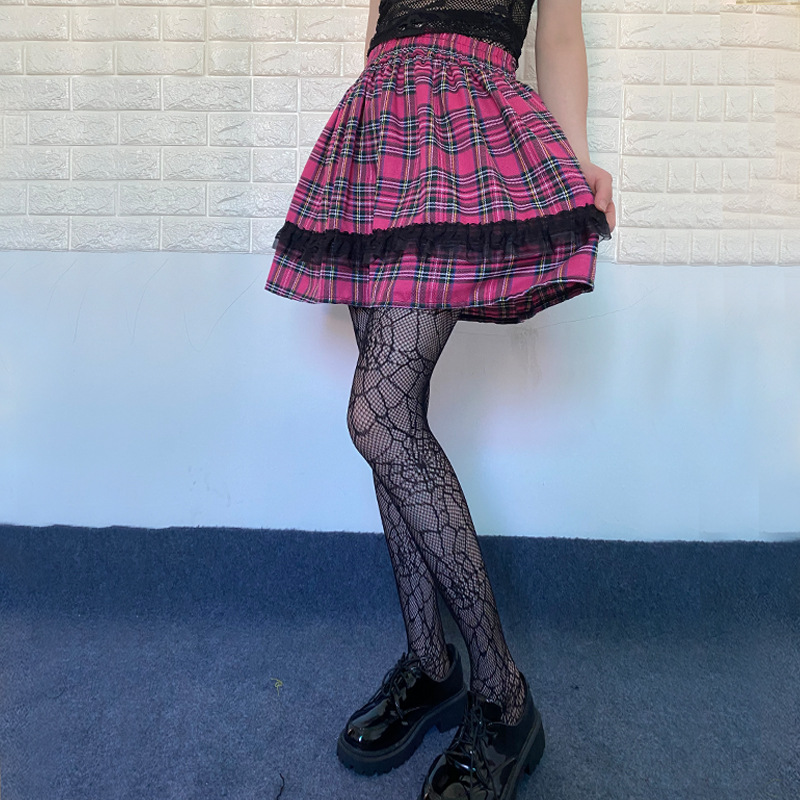 Y2K 하이웨이스트 체크무늬 스커트 레이스 스티치 밴딩 허리 A라인 슬림 플리츠 스커트 JK 시각미학 스타일스토어 가기