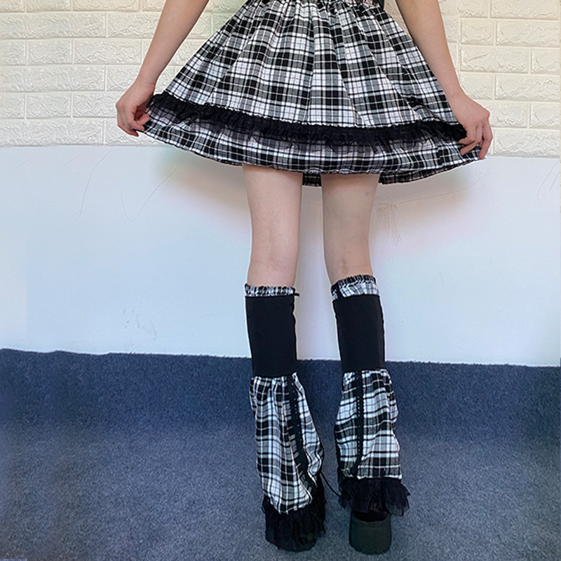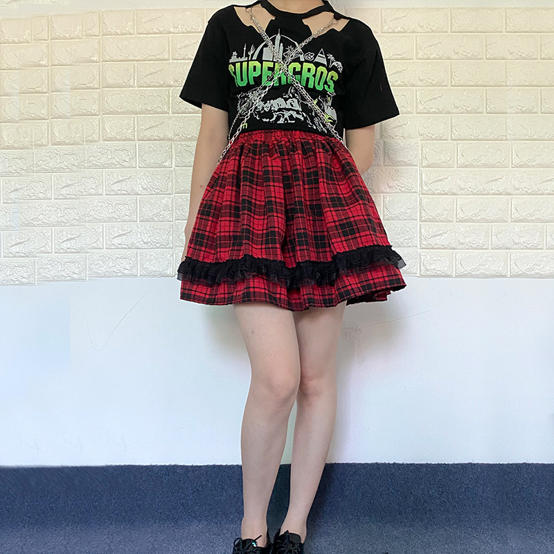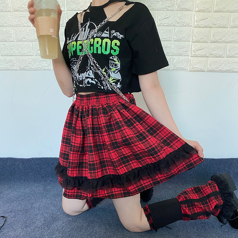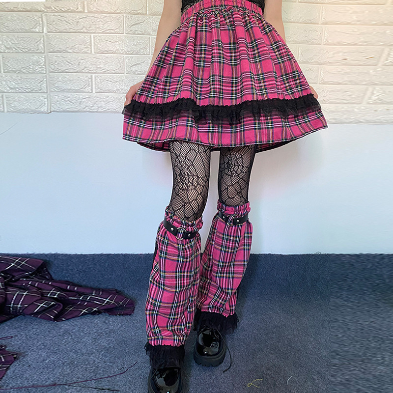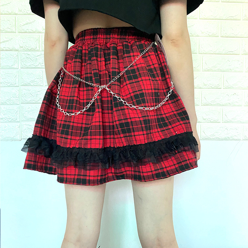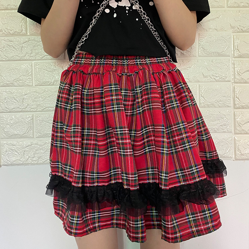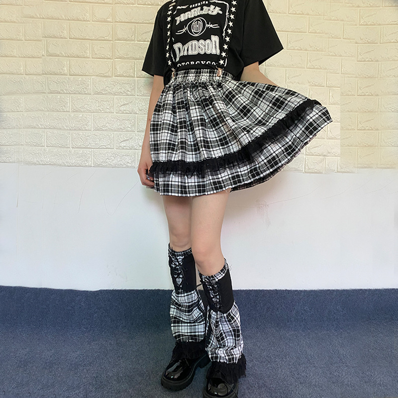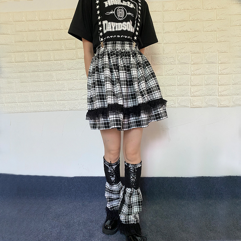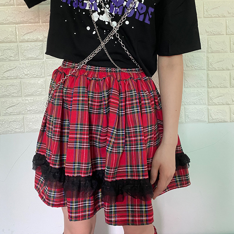 Y2K 하이웨이스트 체크무늬 스커트 레이스 스티치 밴딩 허리 A라인 슬림 플리츠 스커트 JK 시각미학 스타일스토어 가기