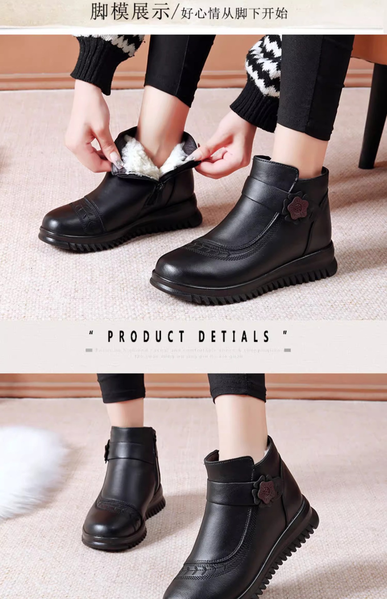 빈티지 꽃 어머니 신발 기모 두꺼운 짧은 부츠 2024 겨울 방수 따뜻한 여성용 가죽 부츠 미끄럼 방지 코튼 신발스토어 가기