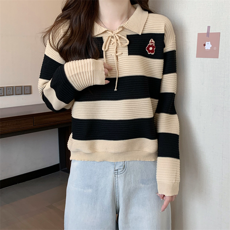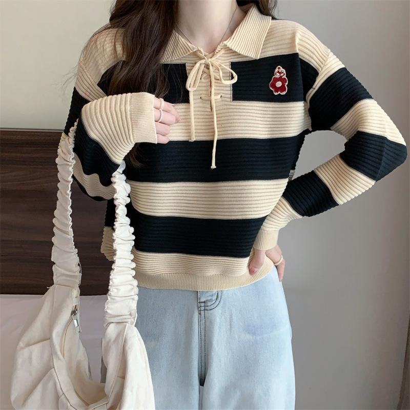 2024 가을 새로운 패션 줄무늬 폴로 칼라 스웨터 여성 디자인 틈새 한국 스타일 달콤한 자수 니트웨어