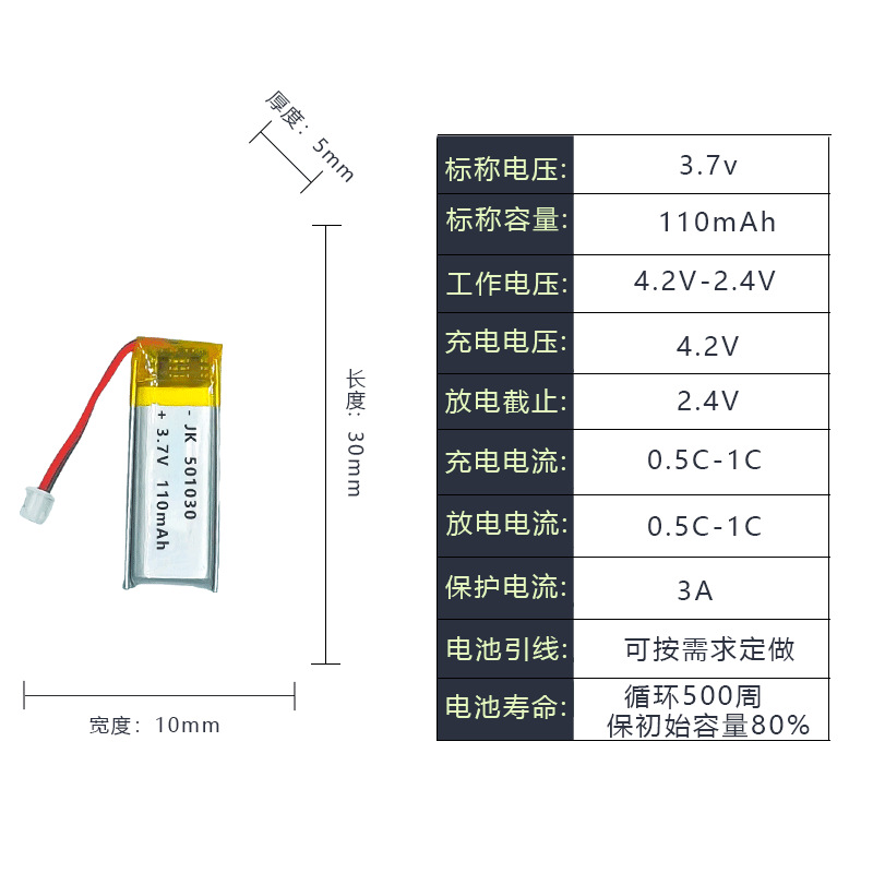 501030 폴리머 리튬 배터리 110mAh 3.7V 뷰티 악기 녹음 펜 스마트 웨어러블 리튬 배터리