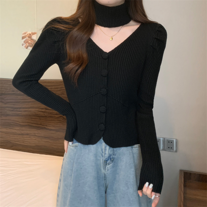 가을과 겨울에 목을 매달린 여성용 긴팔 스웨터 디자인 센스 내부 스웨터 슬림 핏 올 매치 쇼트 탑이있는 새로운베이스 셔츠