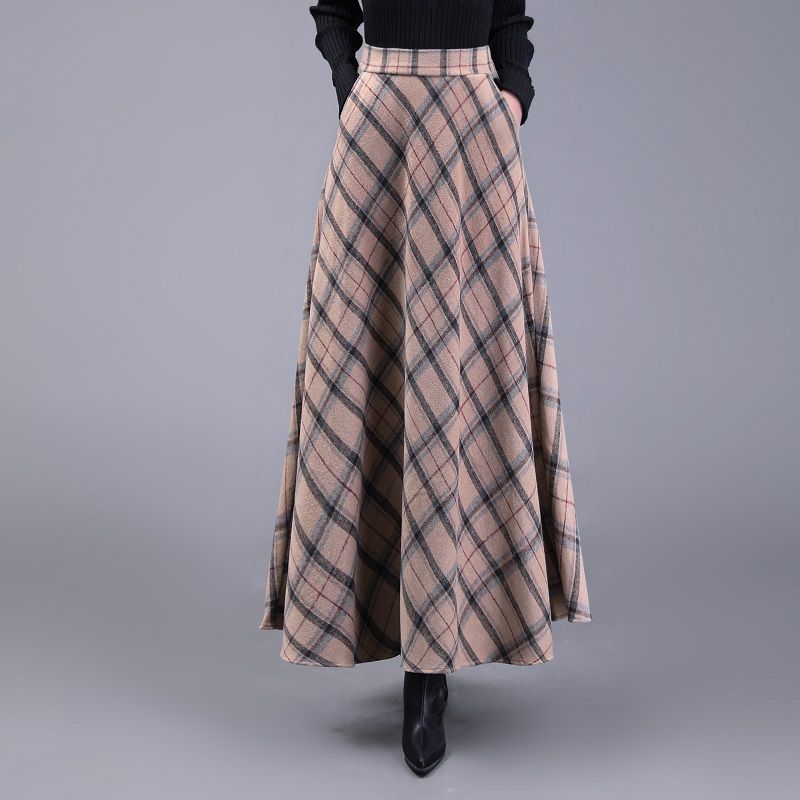가을과 겨울 새로운 양모 체크 스커트 레트로 스타일 긴 스커트 배 모양의 힙합 커버 슬림 A 라인 스커트 대형 스윙 스커트 우산 스커트