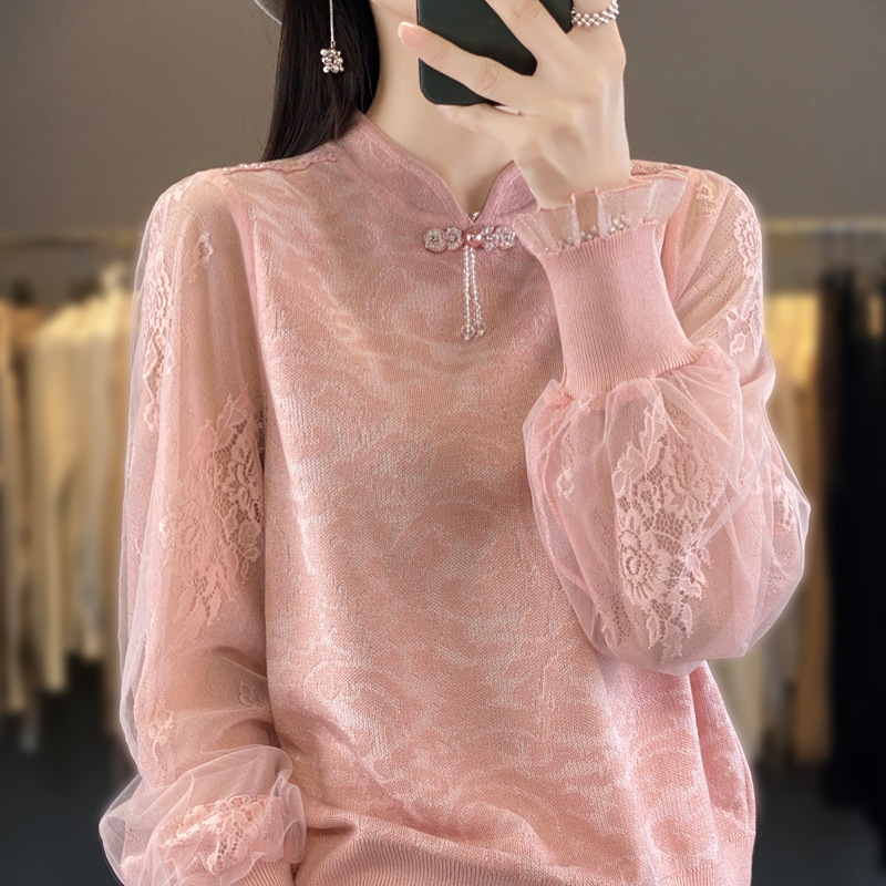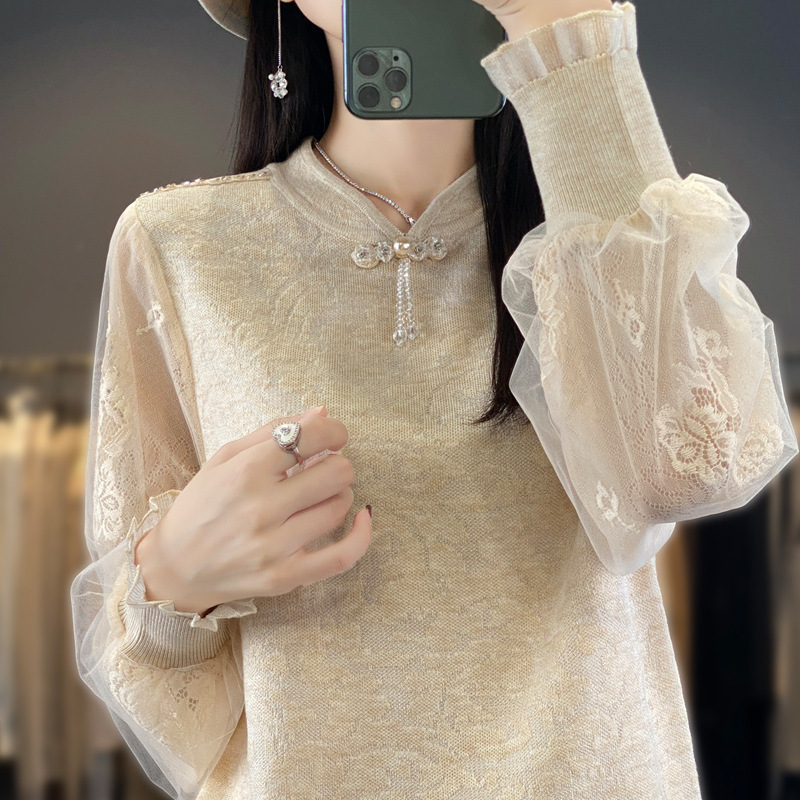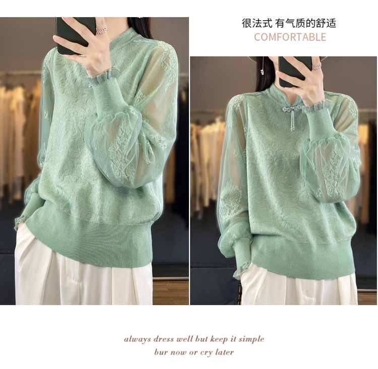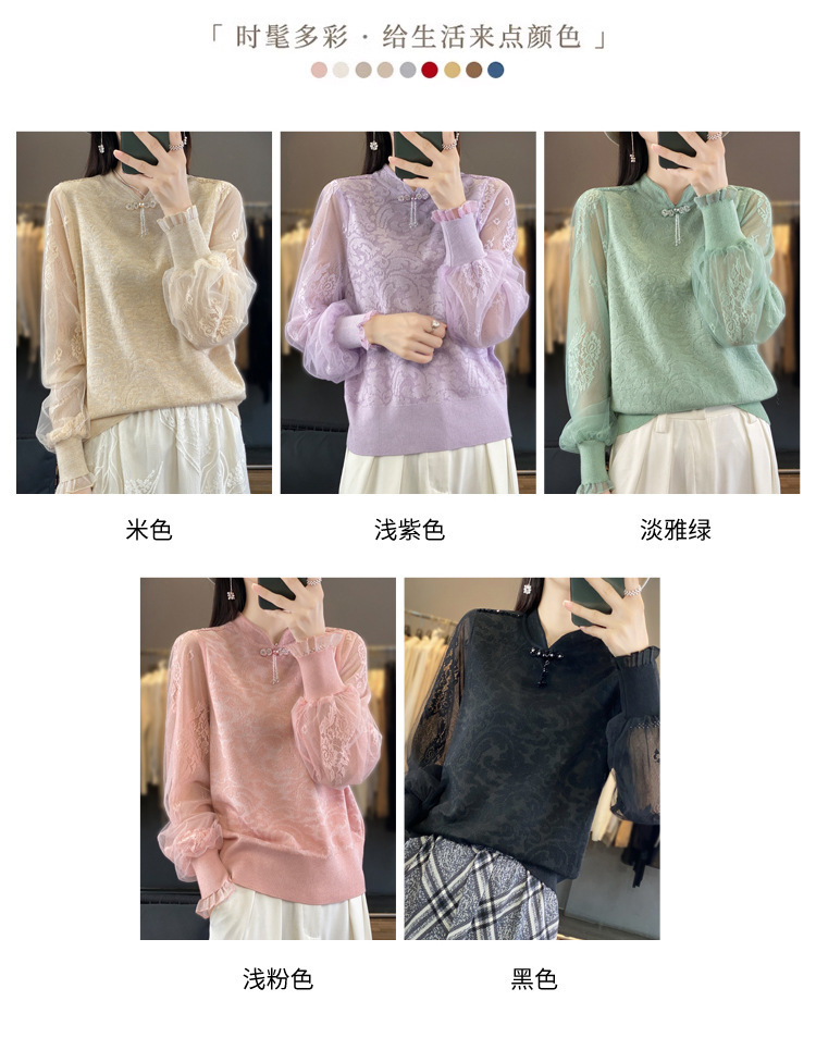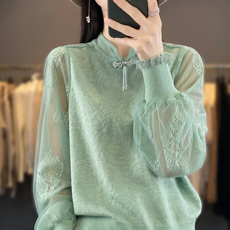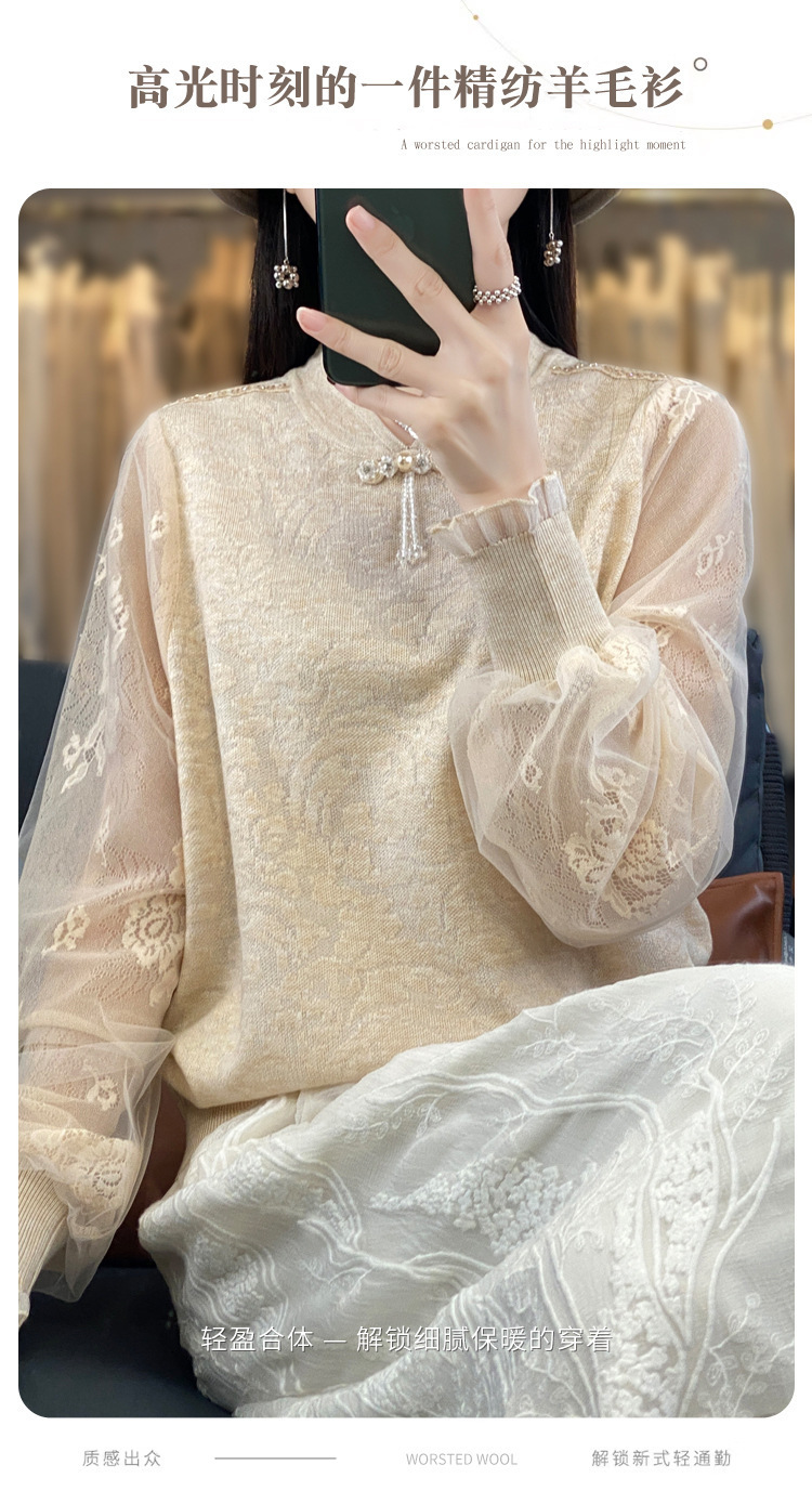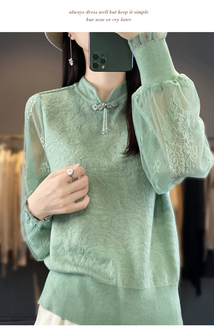 2024 봄과 가을 우아한 우아한 중국 여성의 Worsted 양모베이스 니트 셔츠 세련된 탑 수직 칼라 스웨터