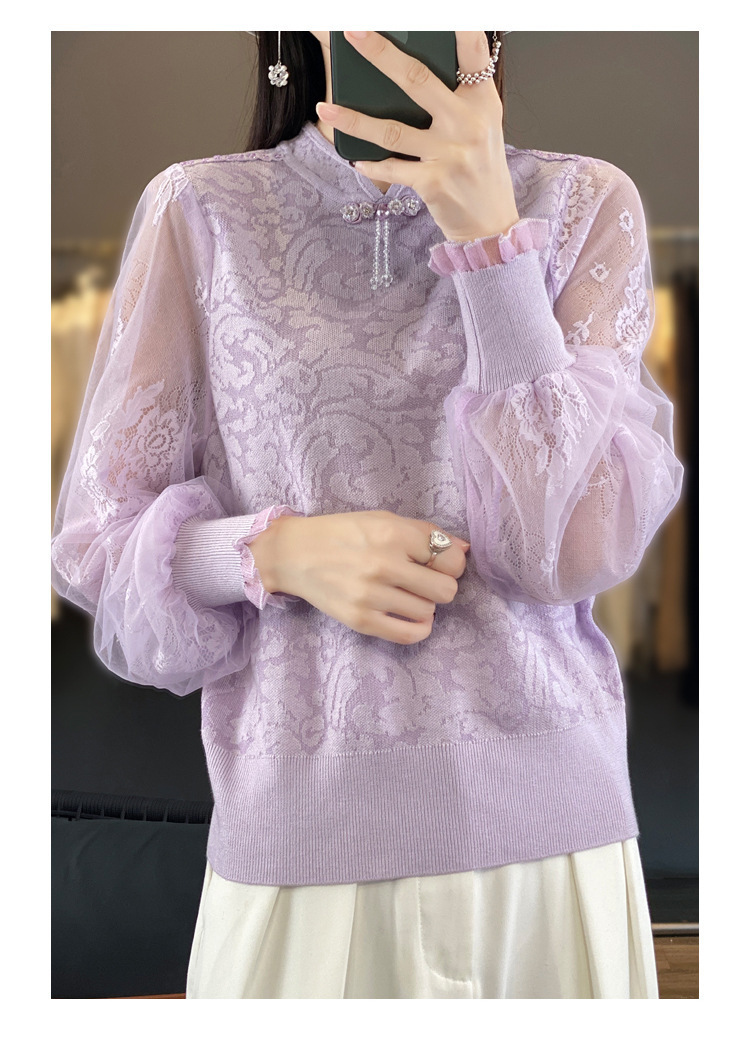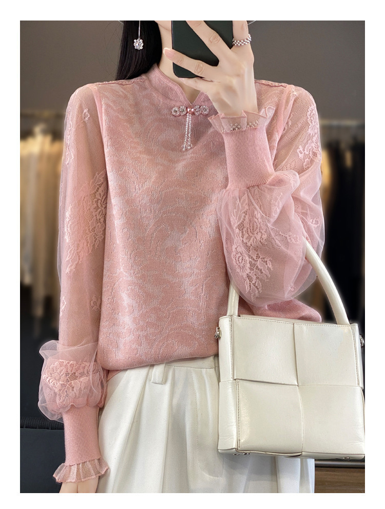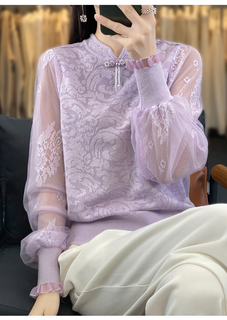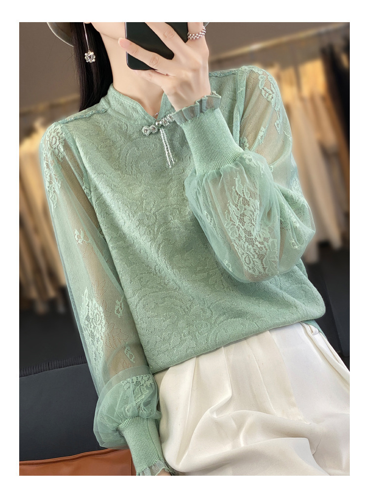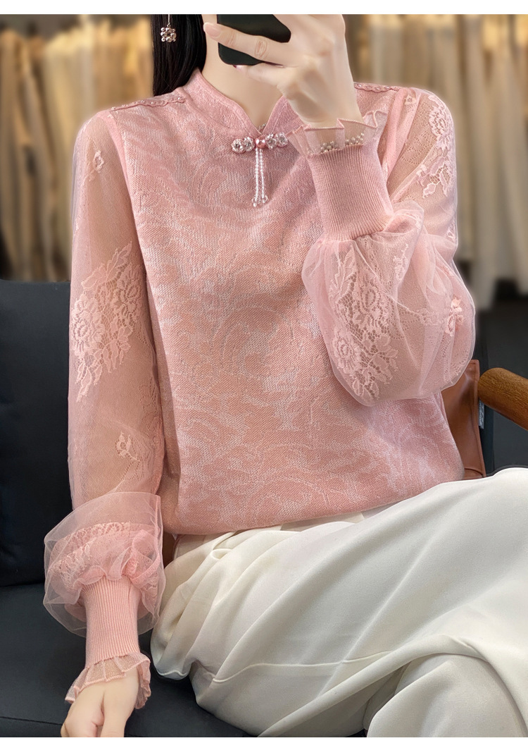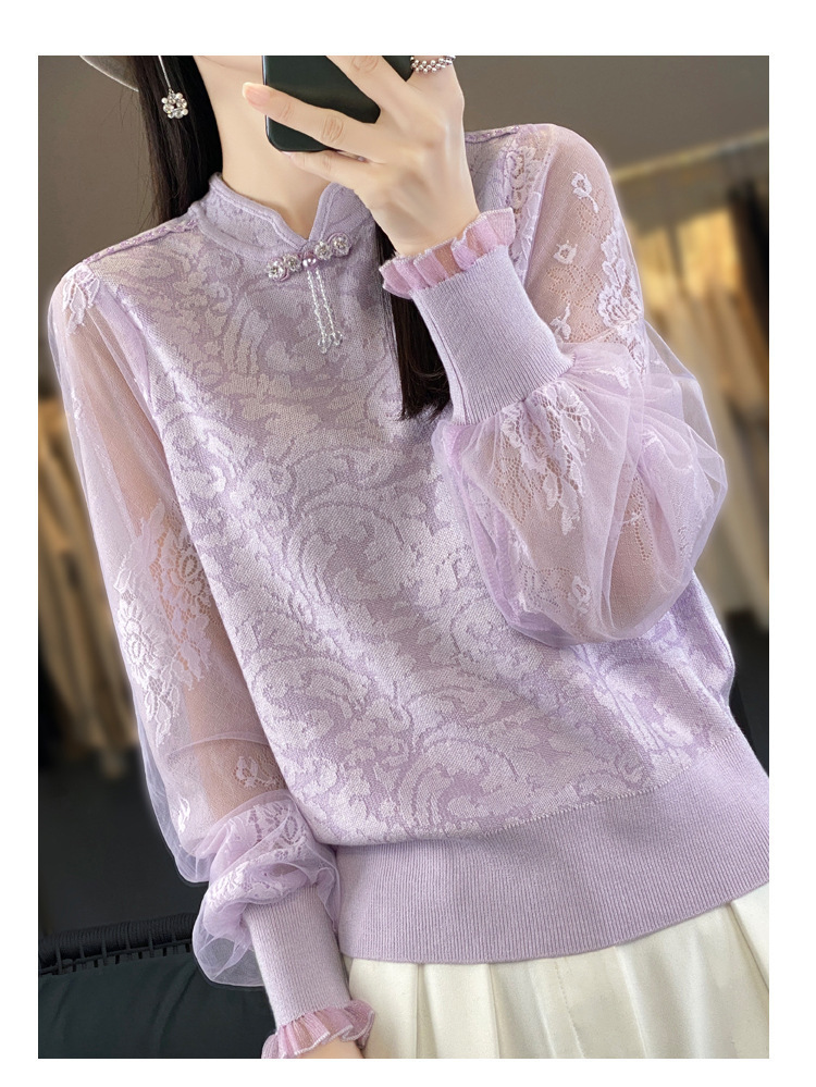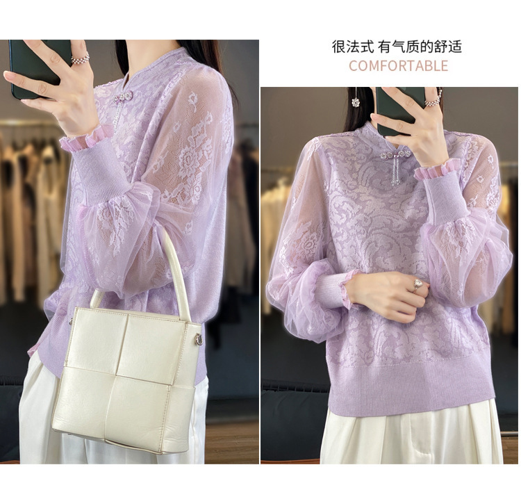 2024 봄과 가을 우아한 우아한 중국 여성의 Worsted 양모베이스 니트 셔츠 세련된 탑 수직 칼라 스웨터