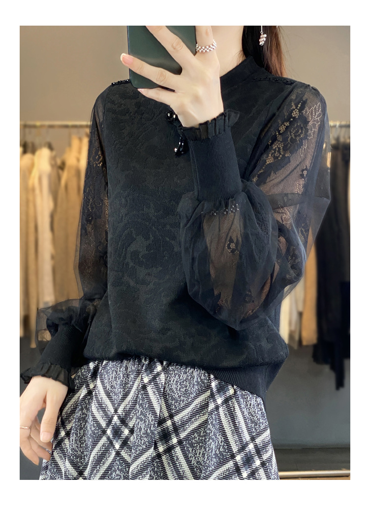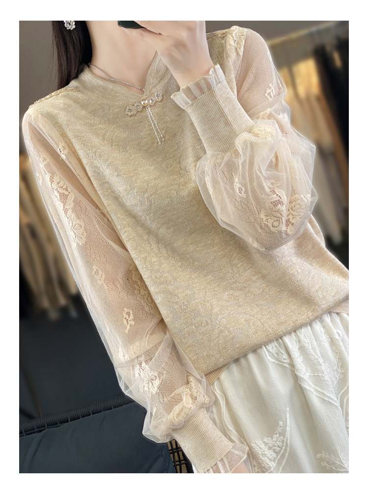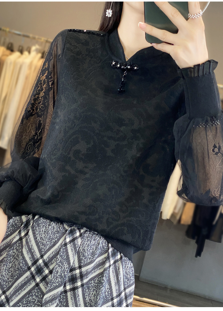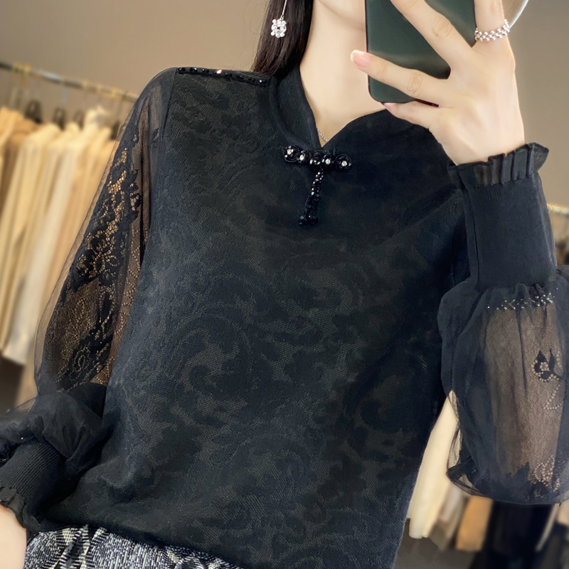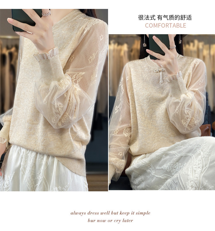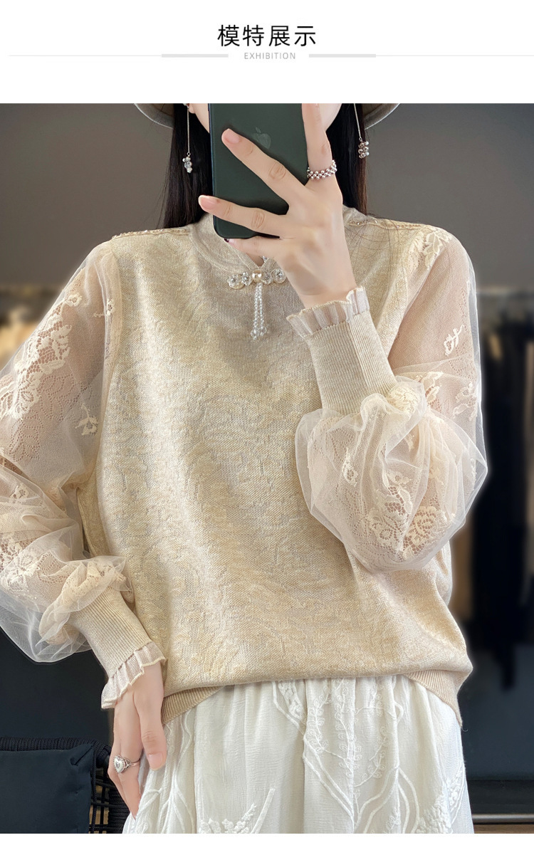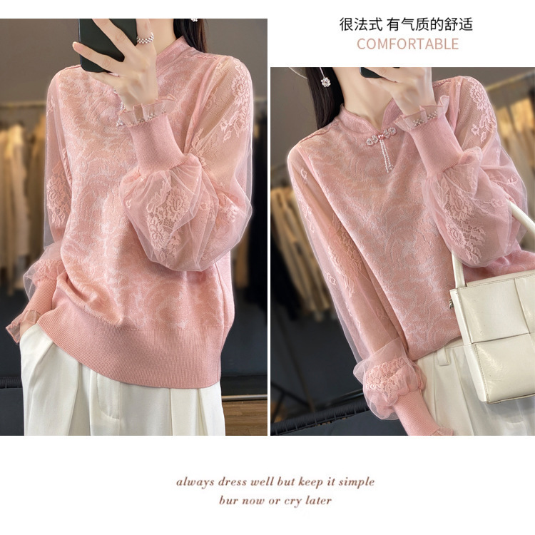 2024 봄과 가을 우아한 우아한 중국 여성의 Worsted 양모베이스 니트 셔츠 세련된 탑 수직 칼라 스웨터