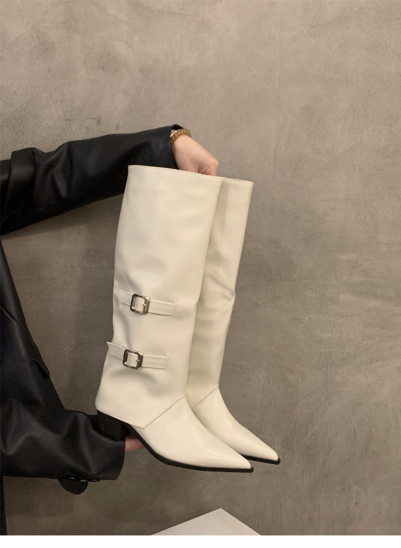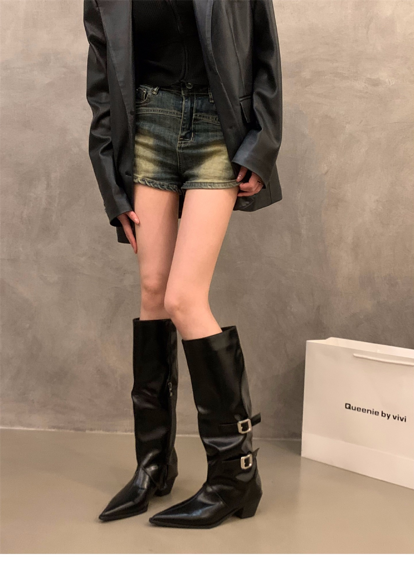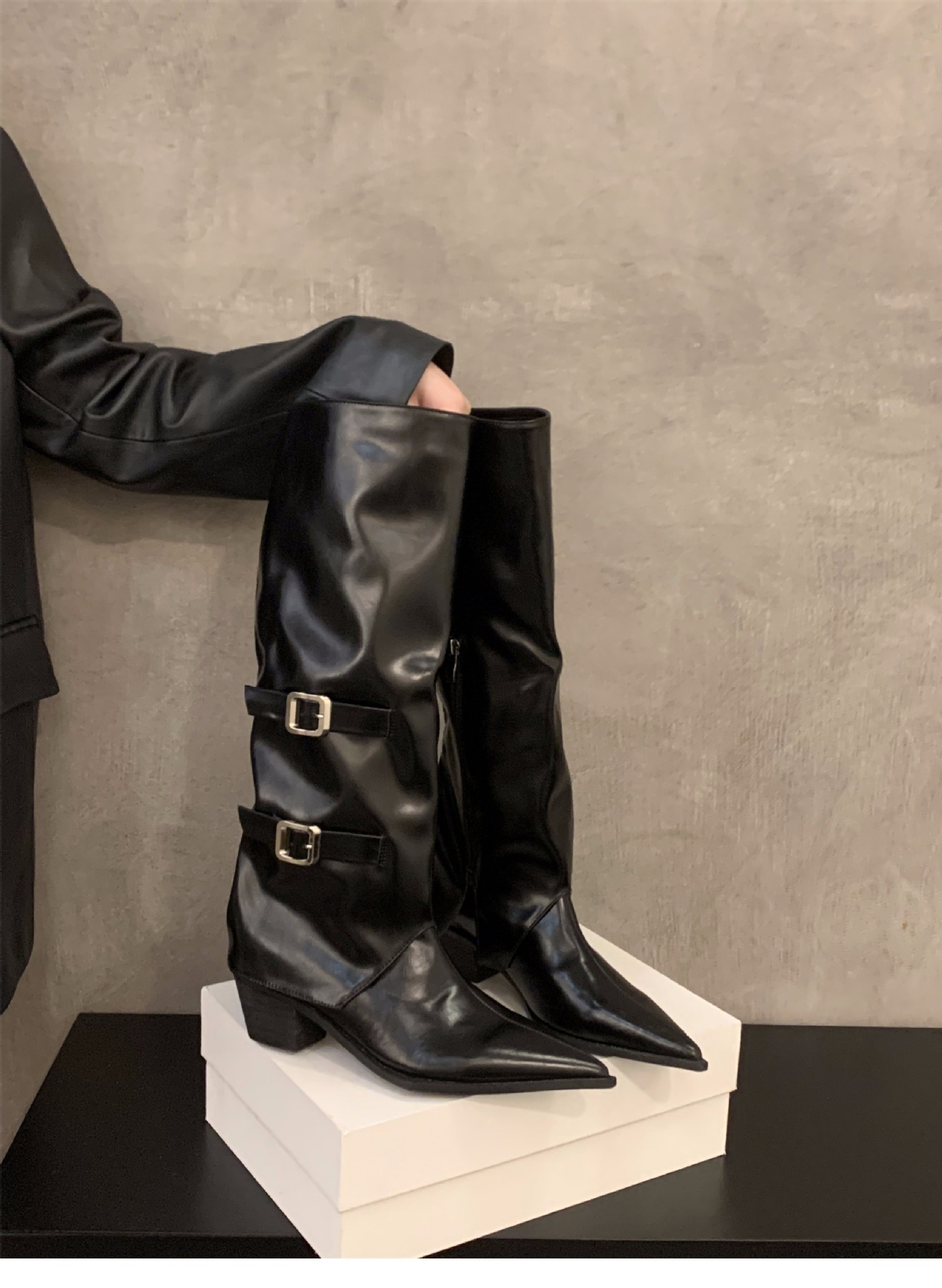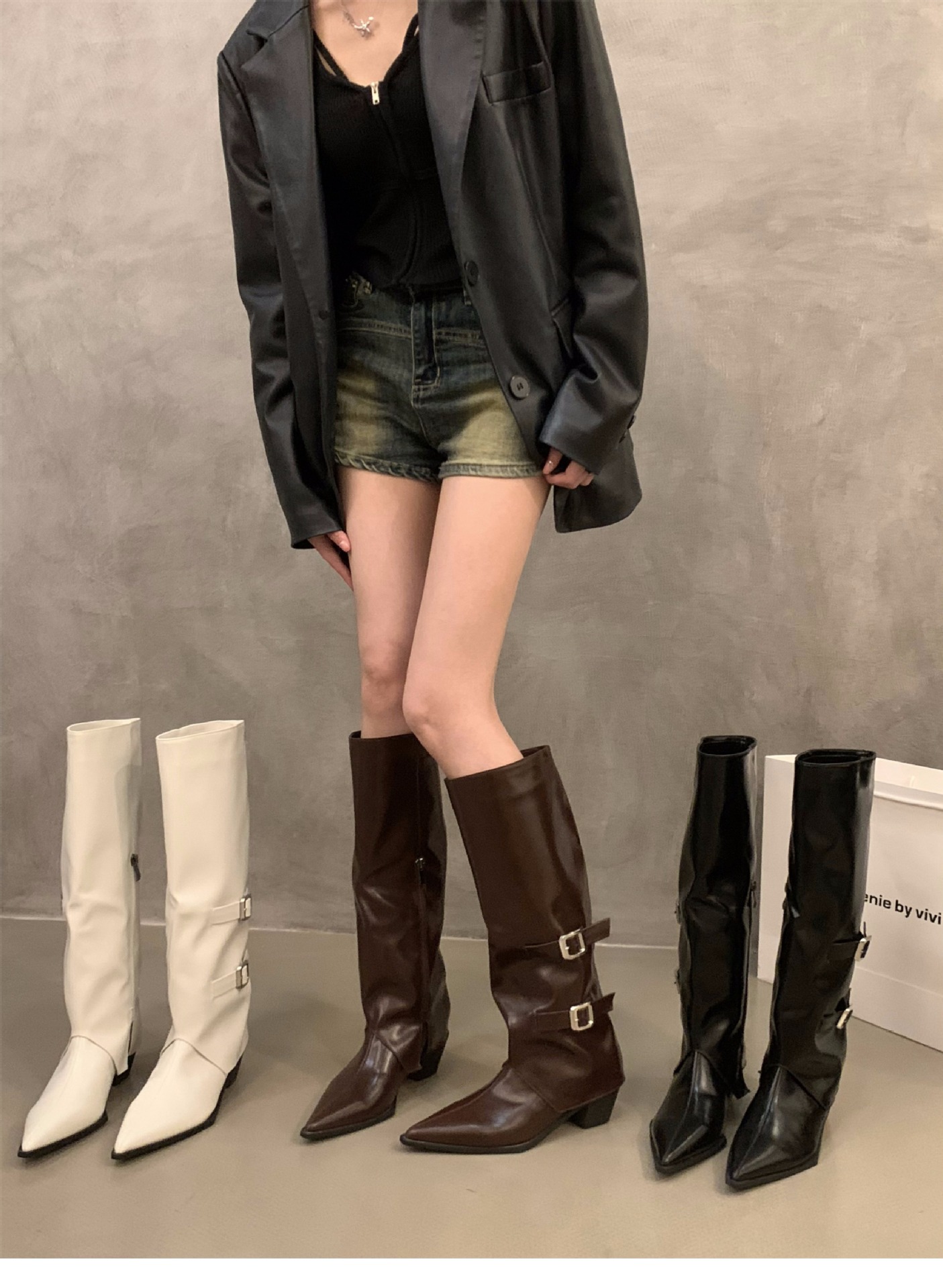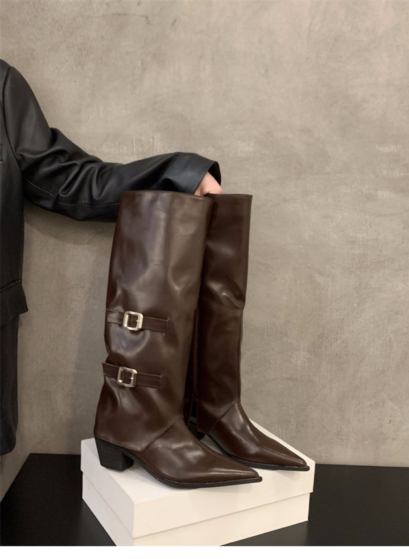 Chunky Heel 뾰족한 발가락 다크 브라운 Maillard 중형 기사 부츠 여성 신발 2024 봄 가을 겨울 바지 부츠 롱 부츠스토어 가기