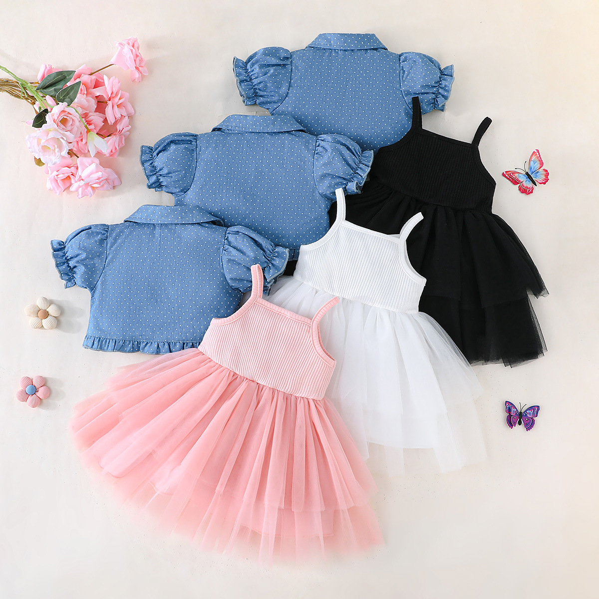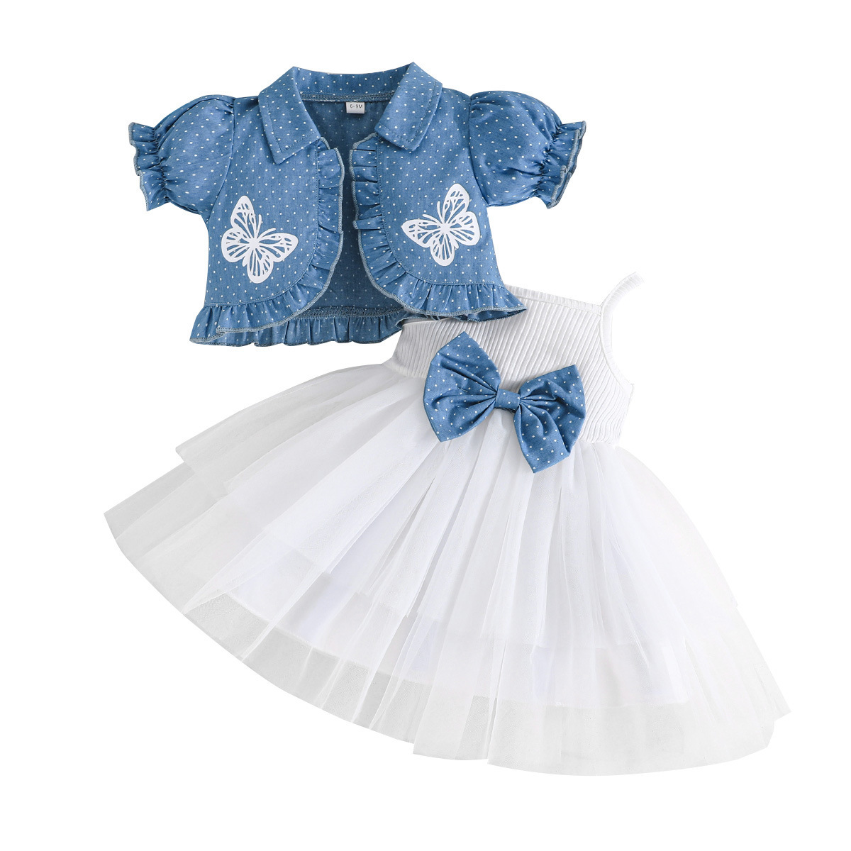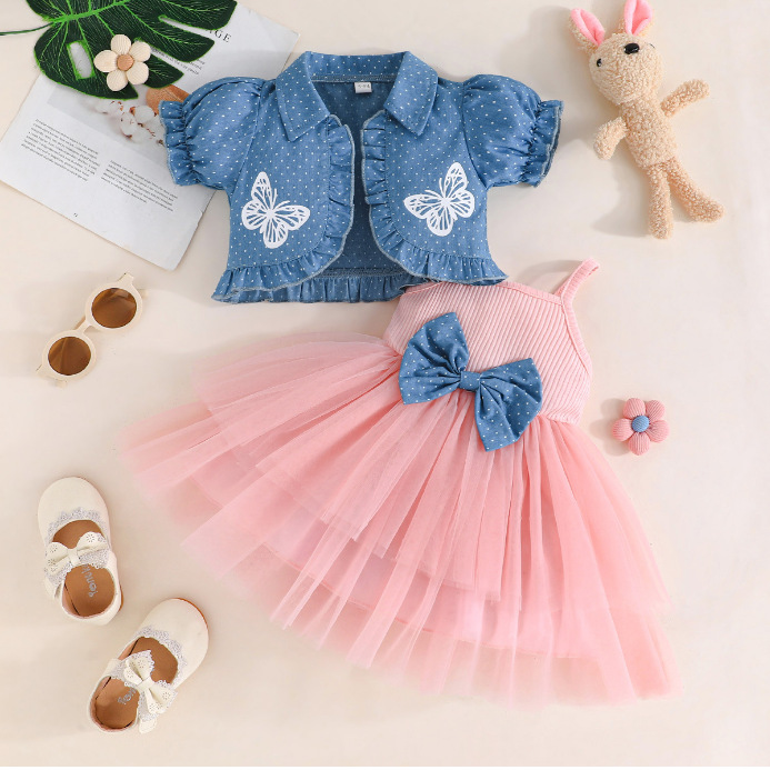 Ins Baby Girl의 봄과 여름 슬링 메쉬 스커트 소녀의 최고 인쇄 포인트 숄 스커트 여름 투피스 세트스토어 가기