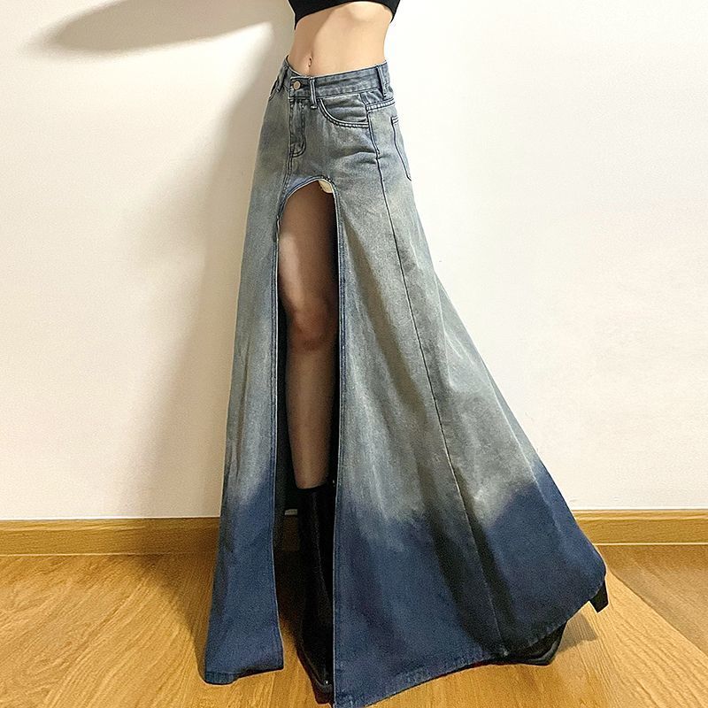 2023 새로운 디자인 감각 틈새 분할 데님 스커트 복고풍 세척 높은 허리 치마 여름 긴 치마스토어 가기