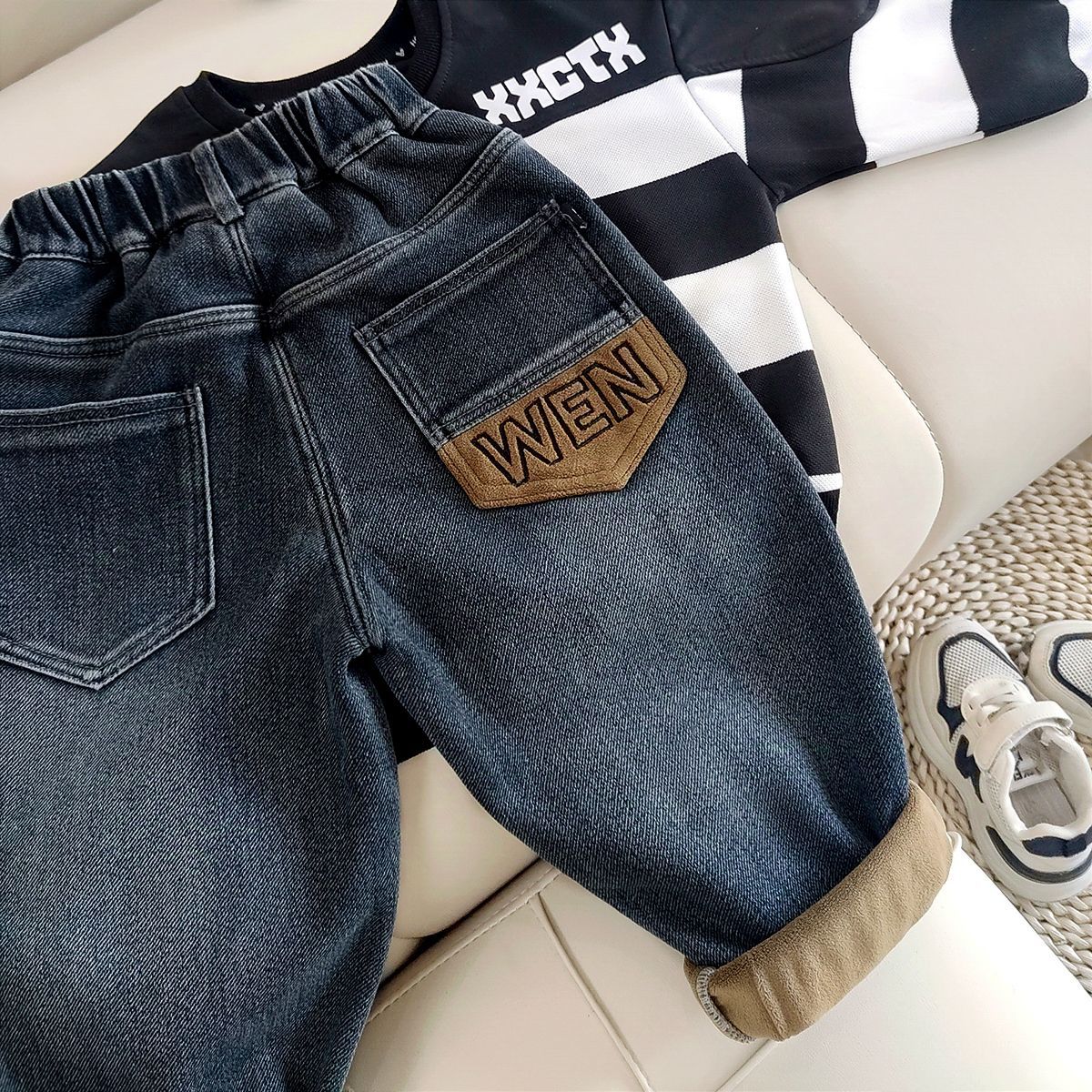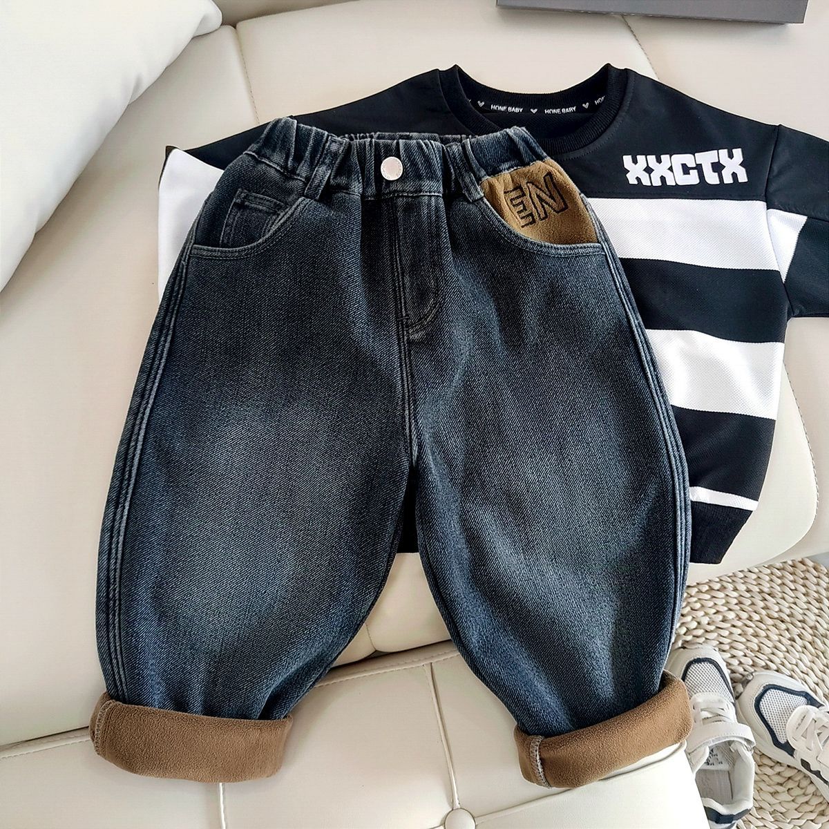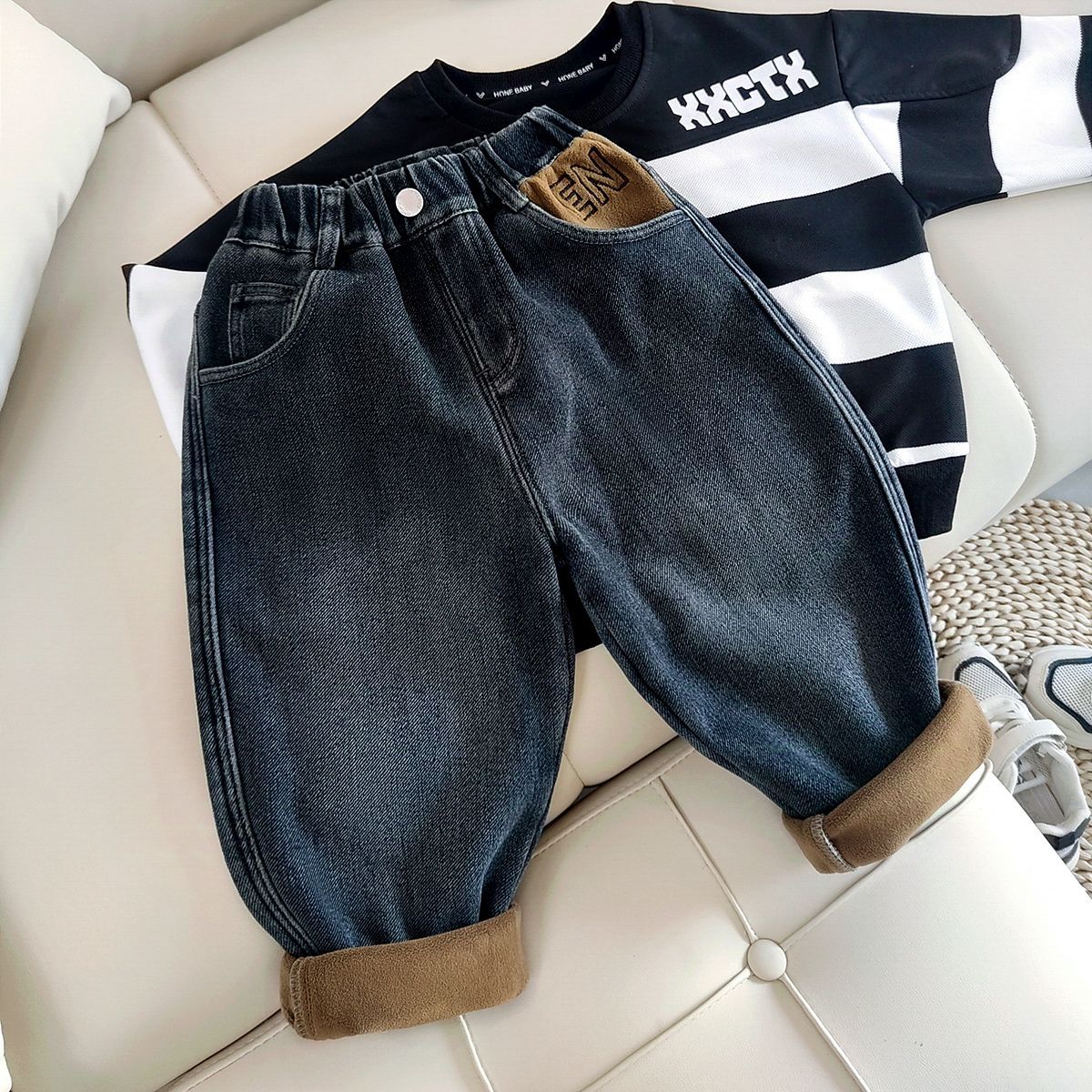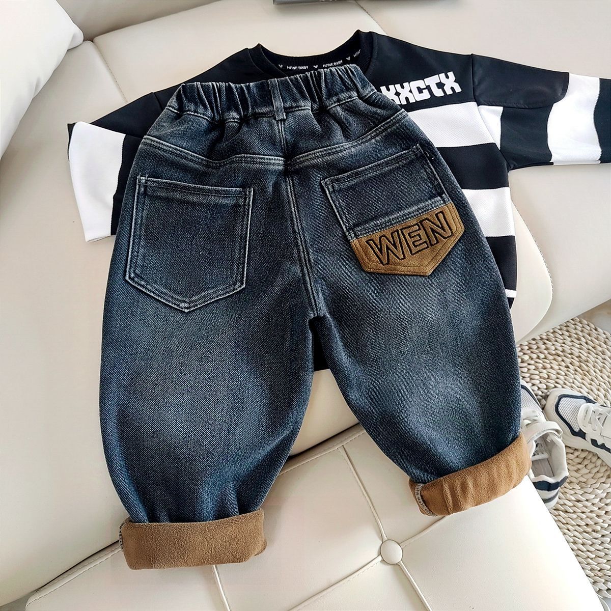 아동복 아동 바지 남아용 기모 데님 바지 어린이 겨울용 일체형 기모 바지 유아용 가을 겨울용 두꺼운 보온 바지스토어 가기