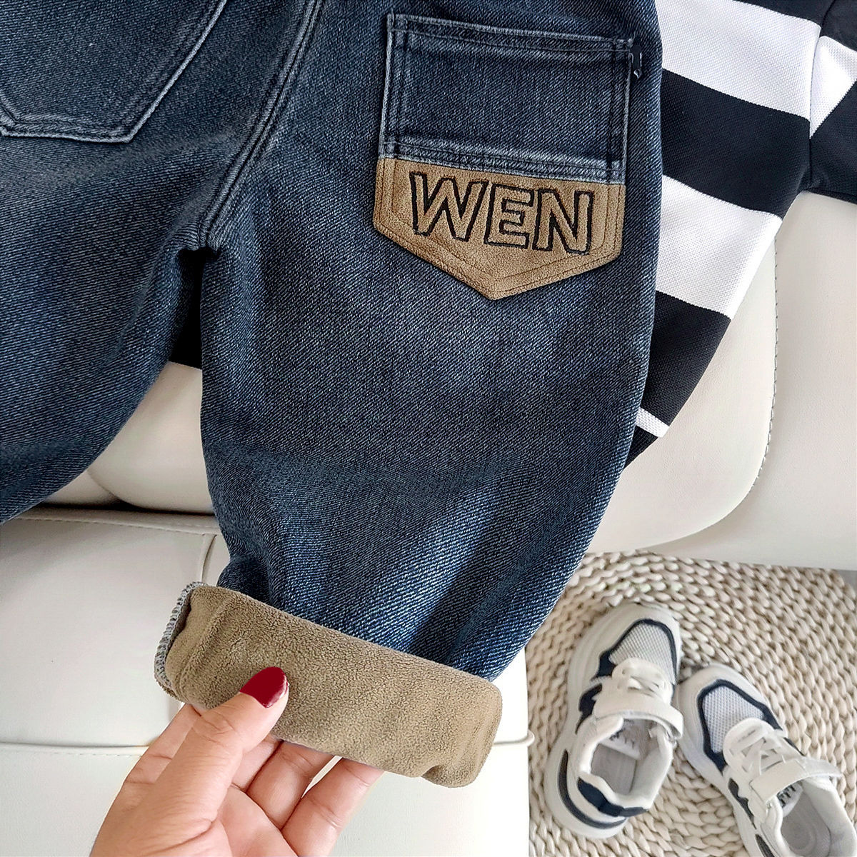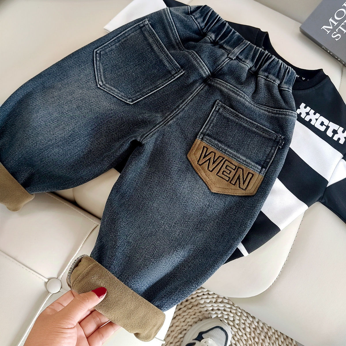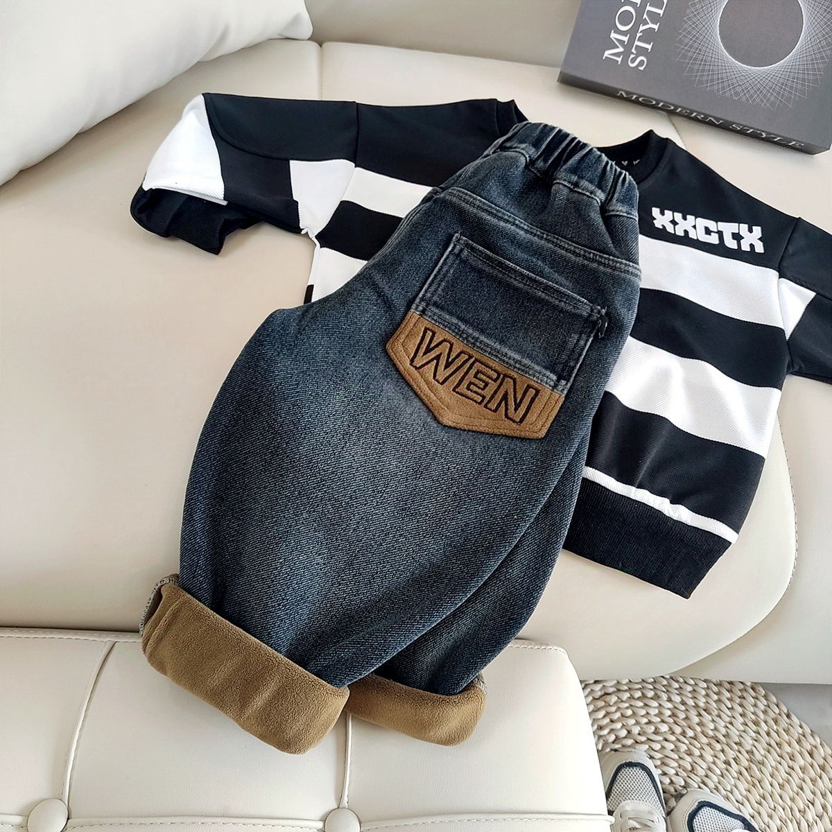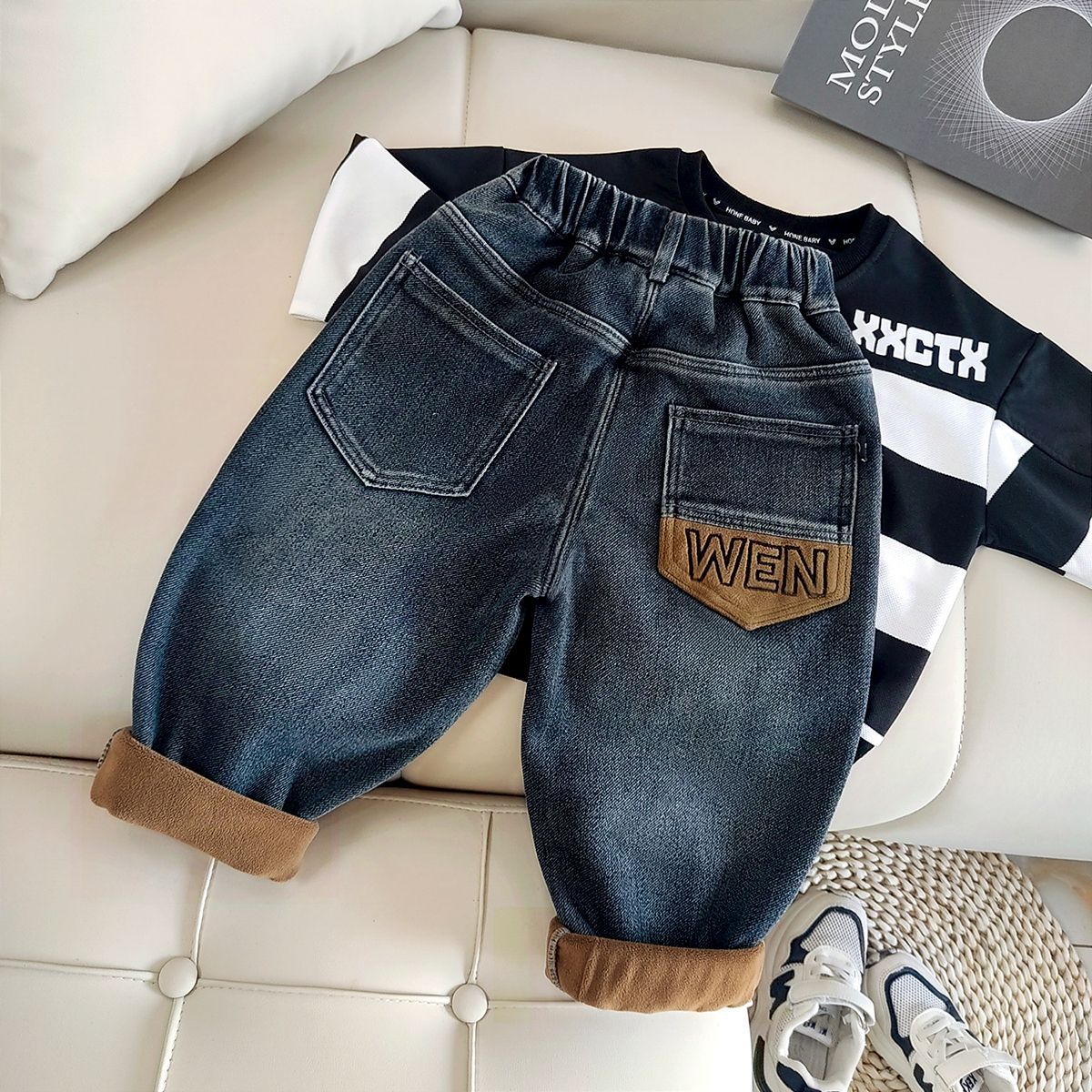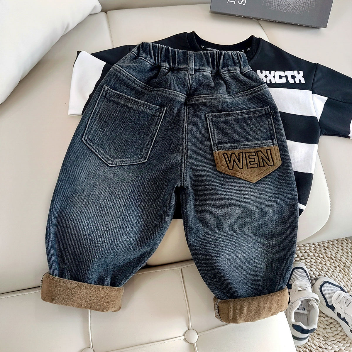 아동복 아동 바지 남아용 기모 데님 바지 어린이 겨울용 일체형 기모 바지 유아용 가을 겨울용 두꺼운 보온 바지스토어 가기