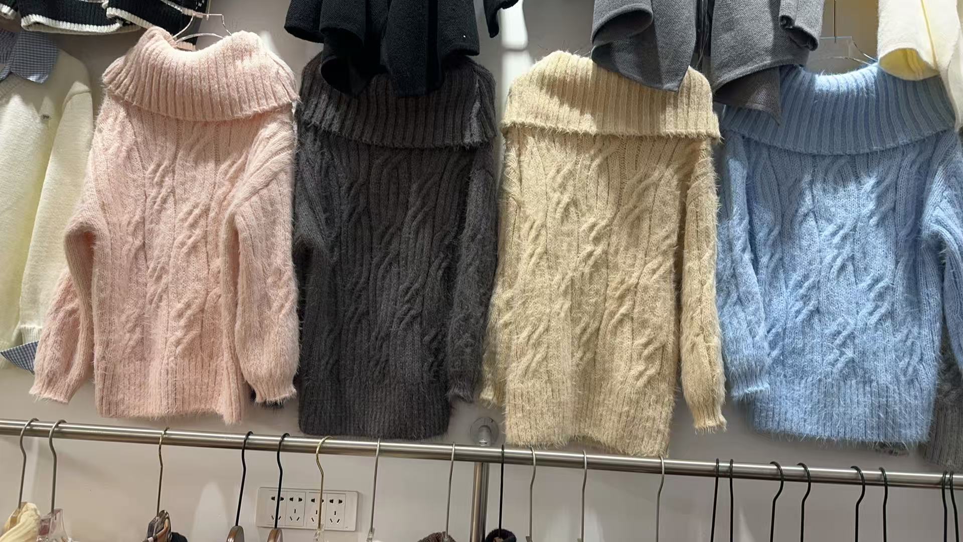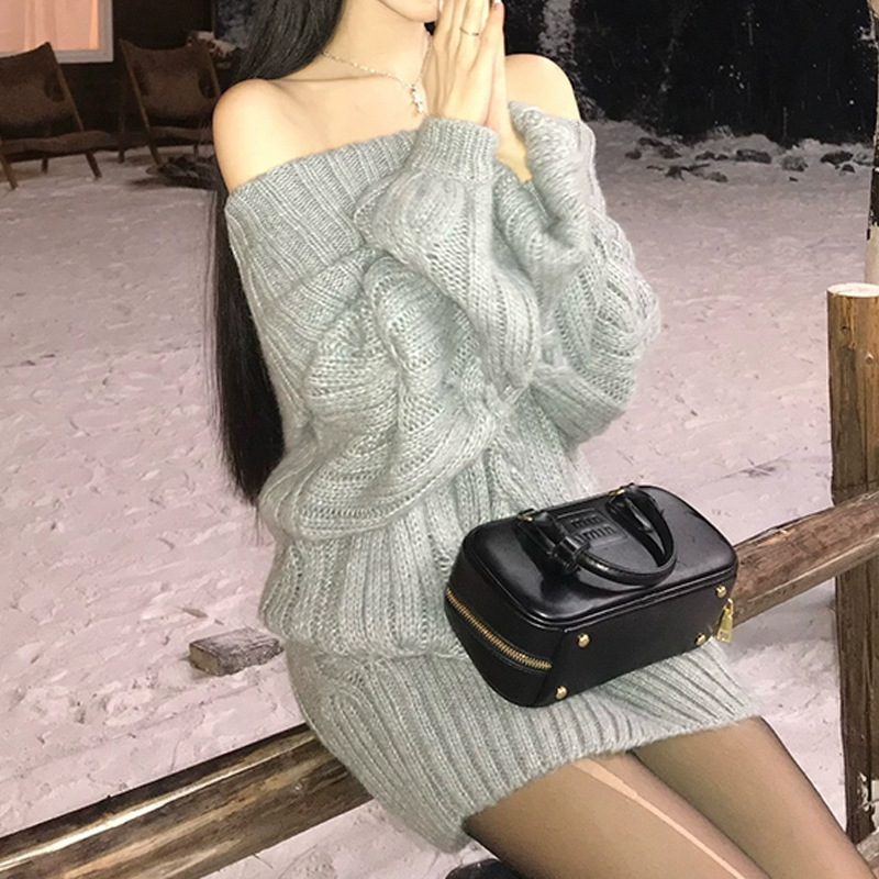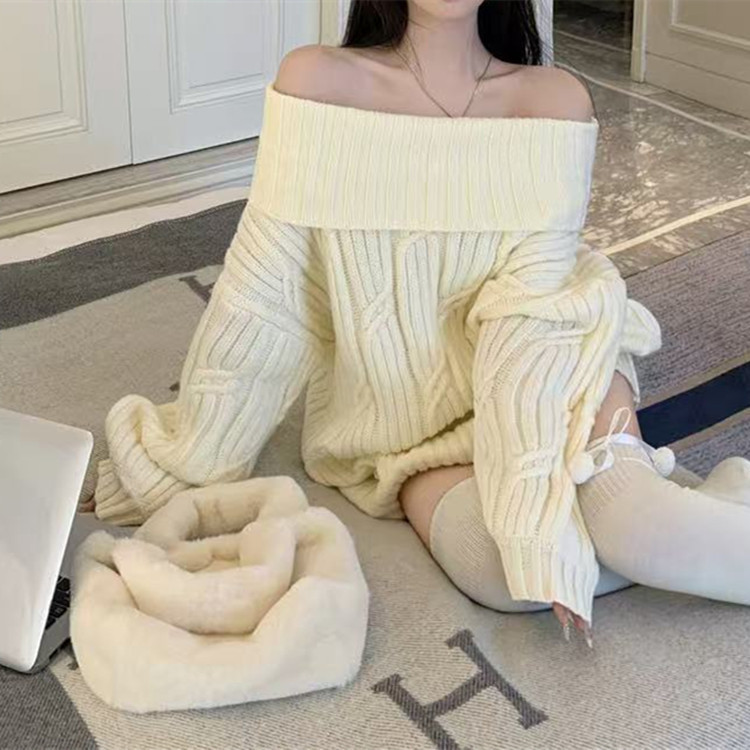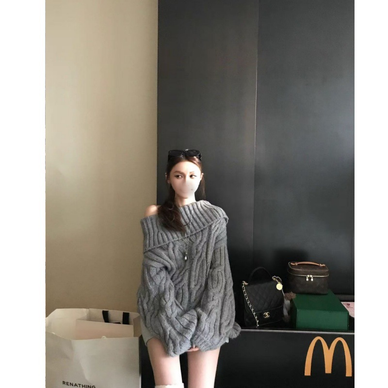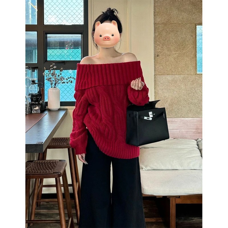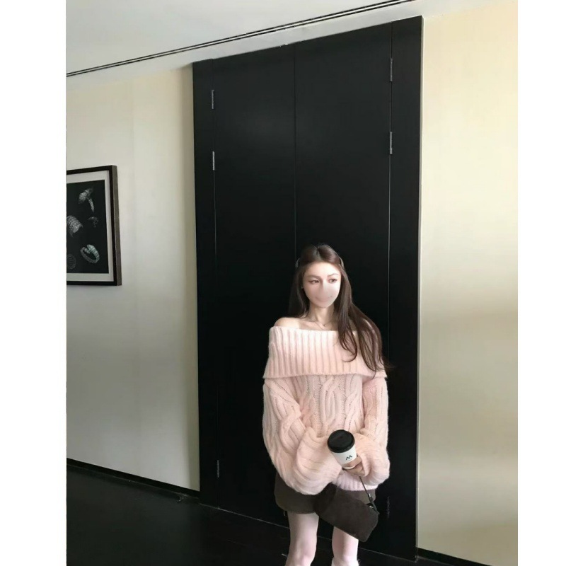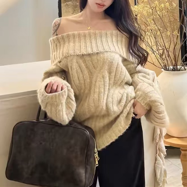 2025년 유행하는 루즈핏 원숄더 대형 꽃무늬 스웨터 여성용 겨울 신상 카키색 단색 오프숄더 니트 탑스토어 가기