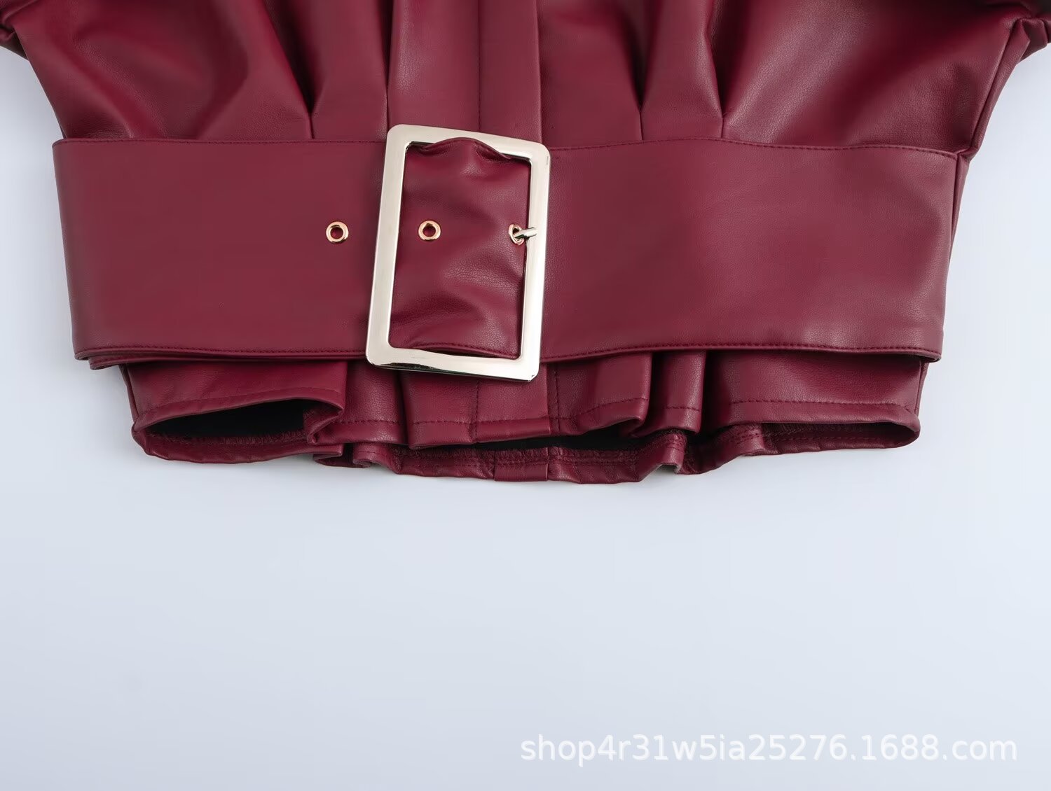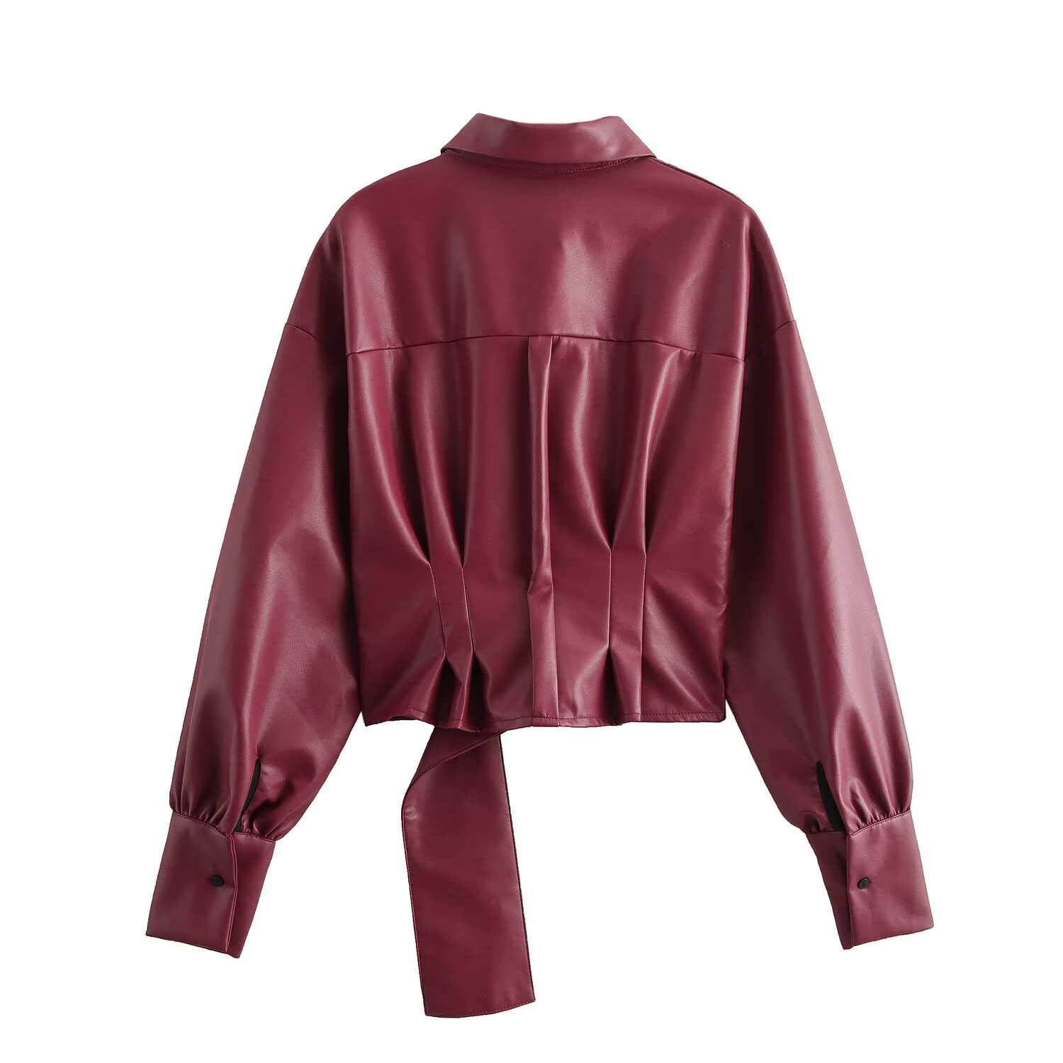 유럽과 미국 스타일 2024 겨울 새로운 여성 빈티지 캐주얼 옷깃 긴 소매 허리 셔츠 모조 가죽 재킷 코트