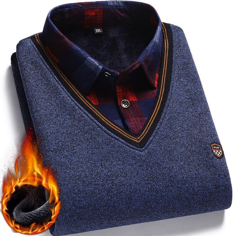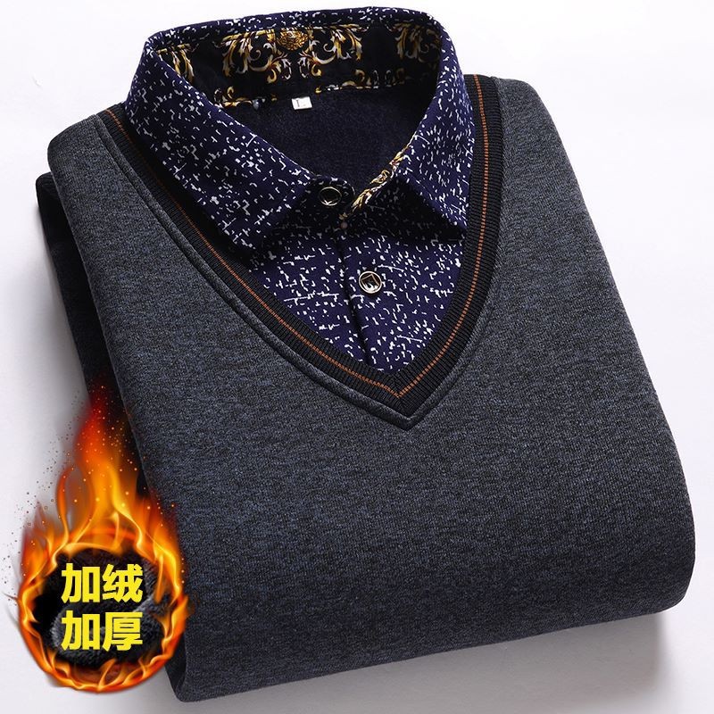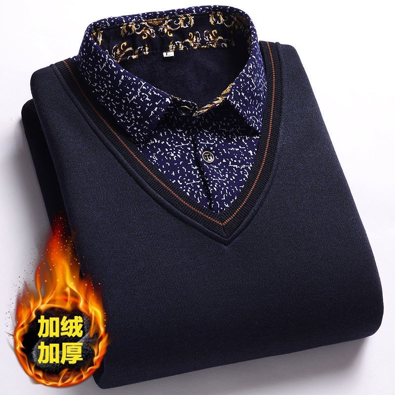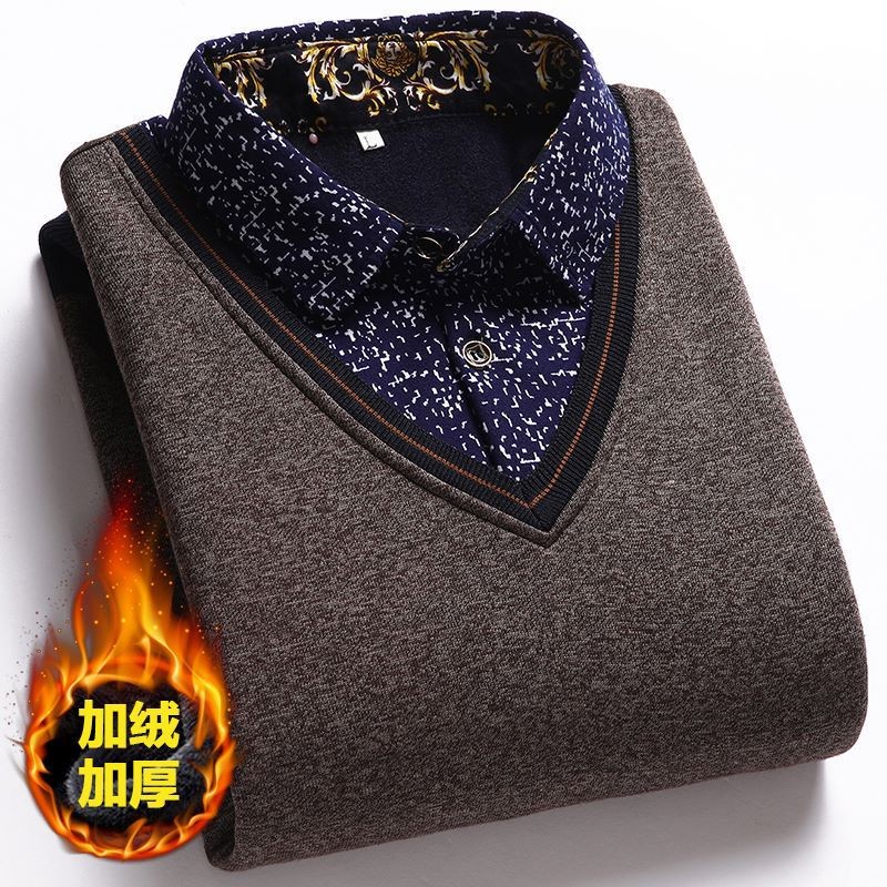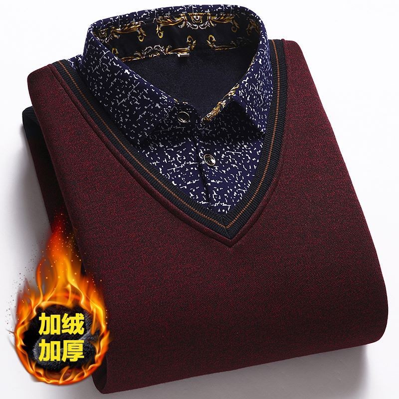 가을과 겨울 새로운 가짜 투피스 기모 두꺼운 스웨터 남성 중년 및 노인 스웨터 니트 베이스 셔츠 따뜻한 탑