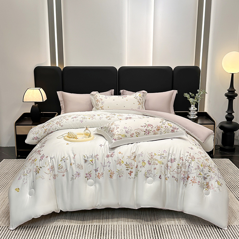 被芯印花面为贡缎纯棉,反面纯色为斜纹纯棉,填充为整张羽丝(聚酯纤维)