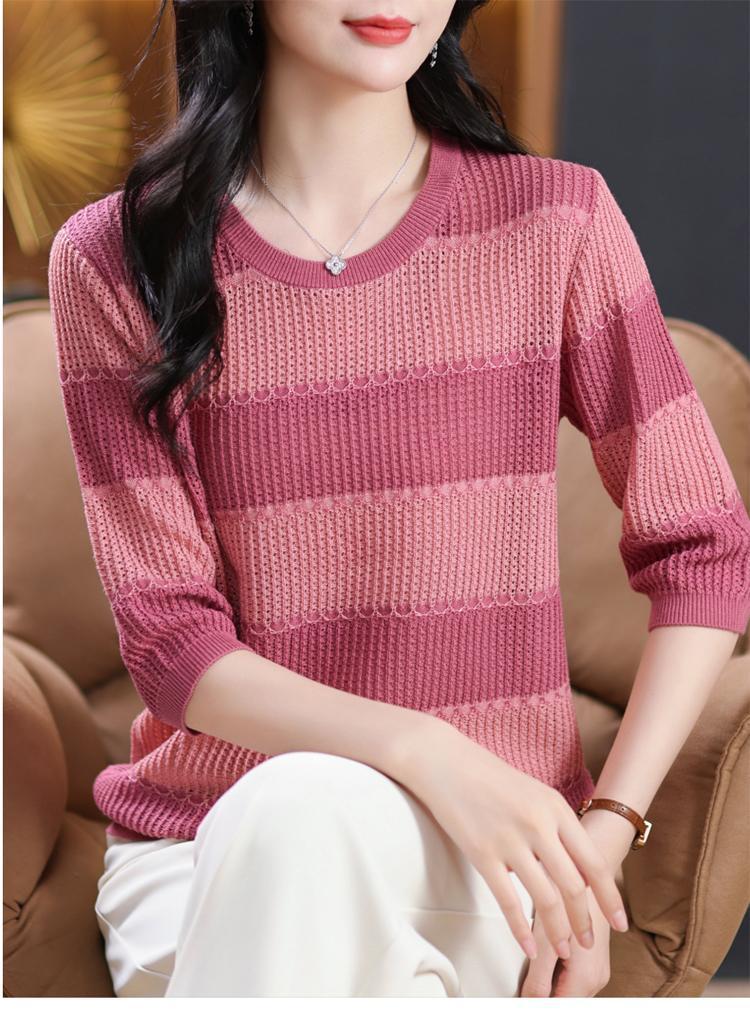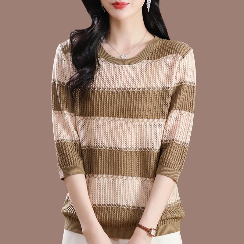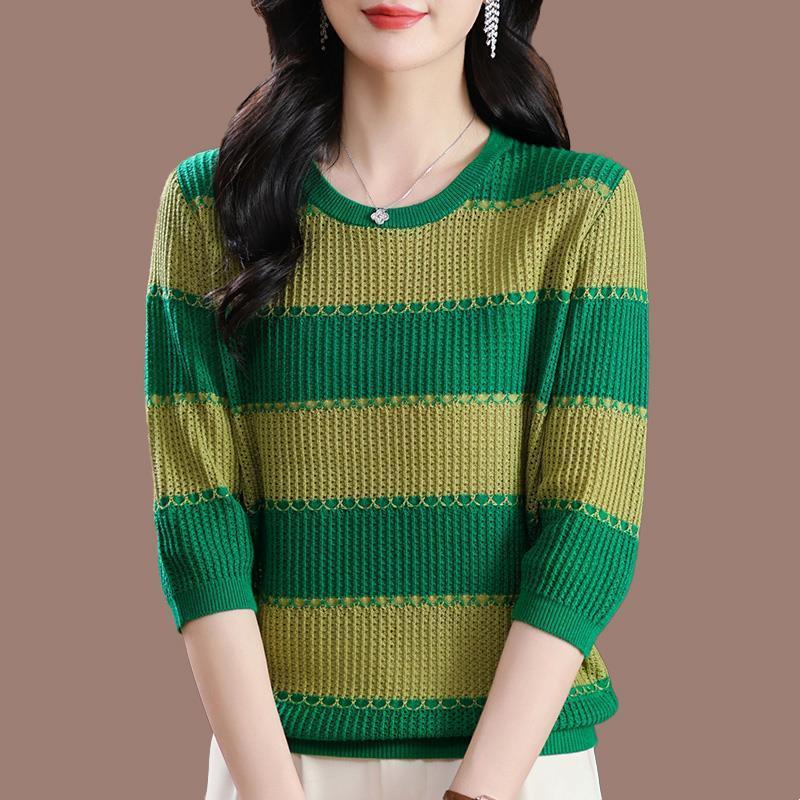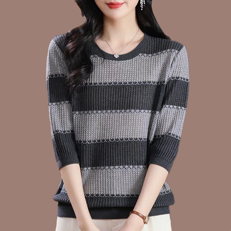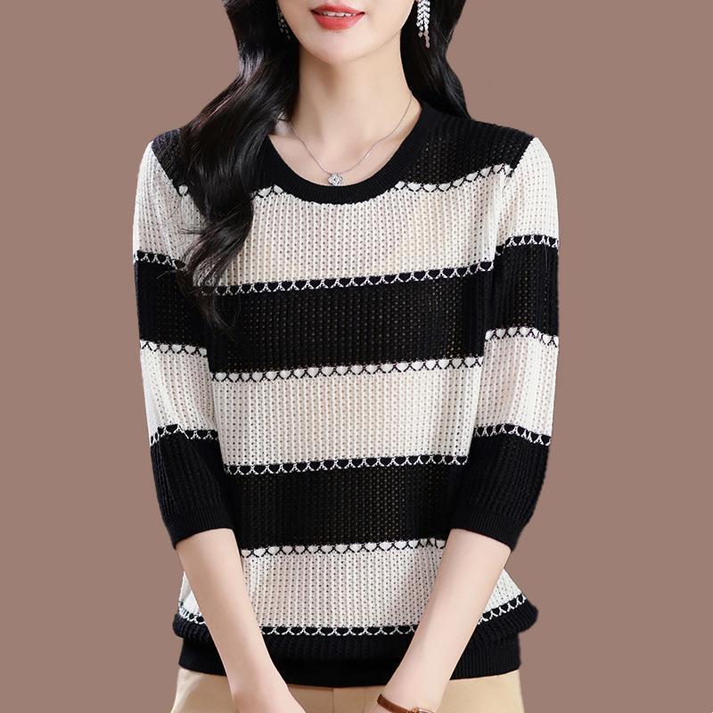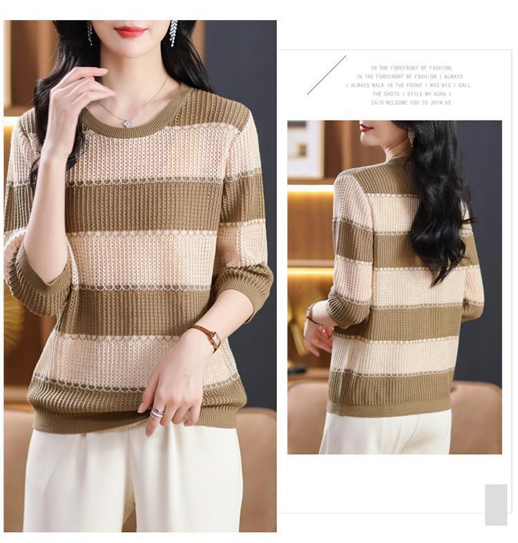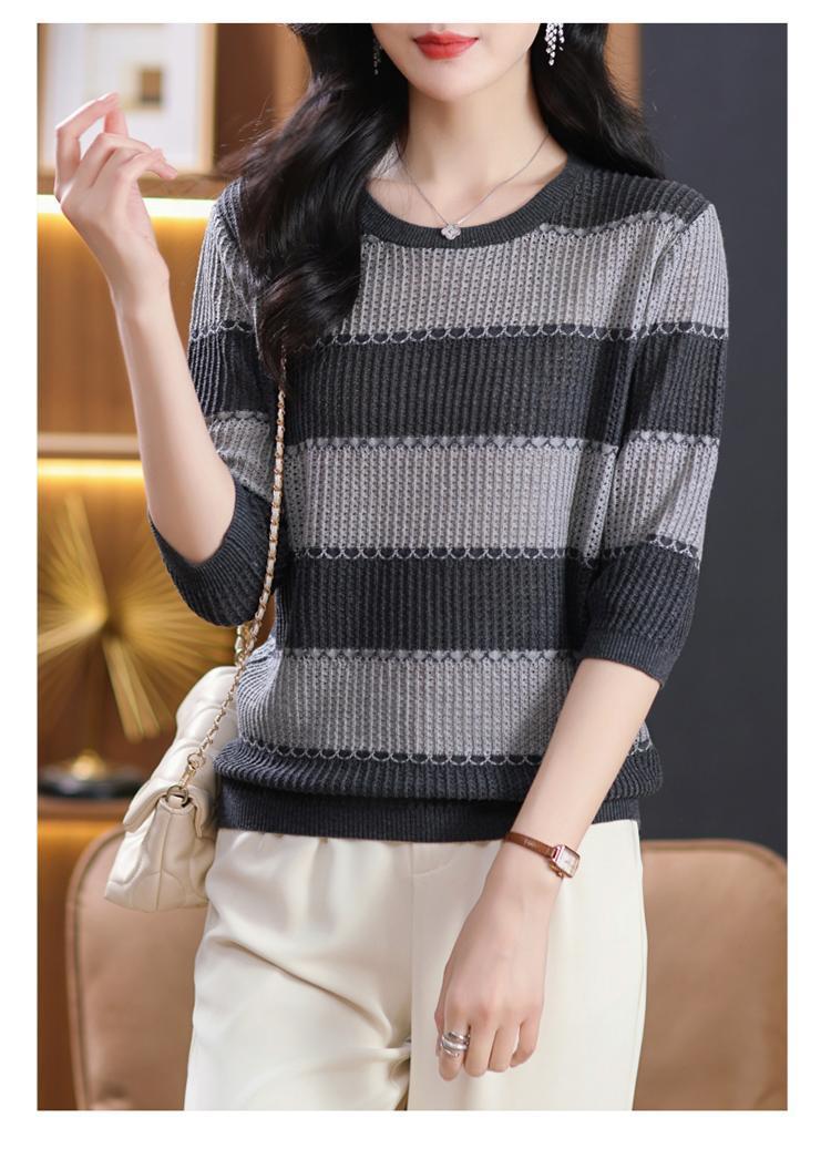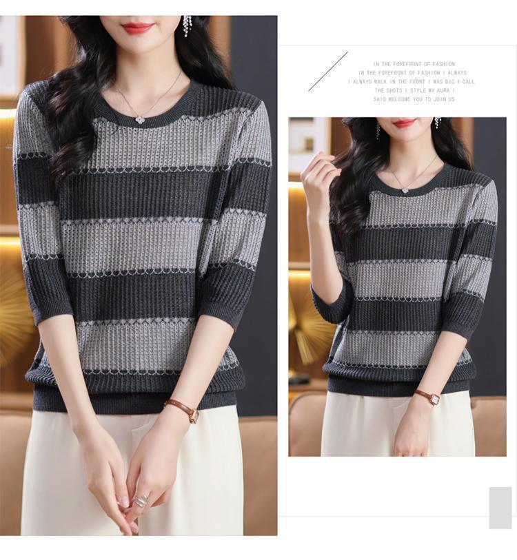 2024 새로운 미드 슬리브 티셔츠 여성용 세븐 슬리브 탑 어머니의 봄 원피스 스트라이프 웨스턴 스타일 니트 히트
