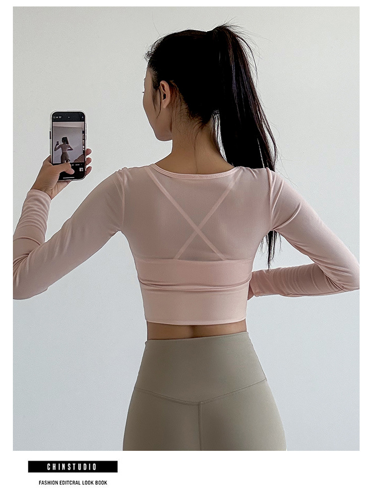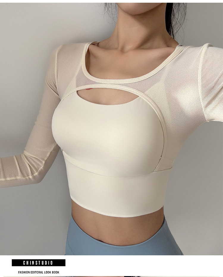 브래지어 패드 요가 할로우 아웃 메쉬 탑 슬림 핏 슬리밍 러닝 스포츠 테니스 피트니스 세트 여성용 긴팔 티셔츠