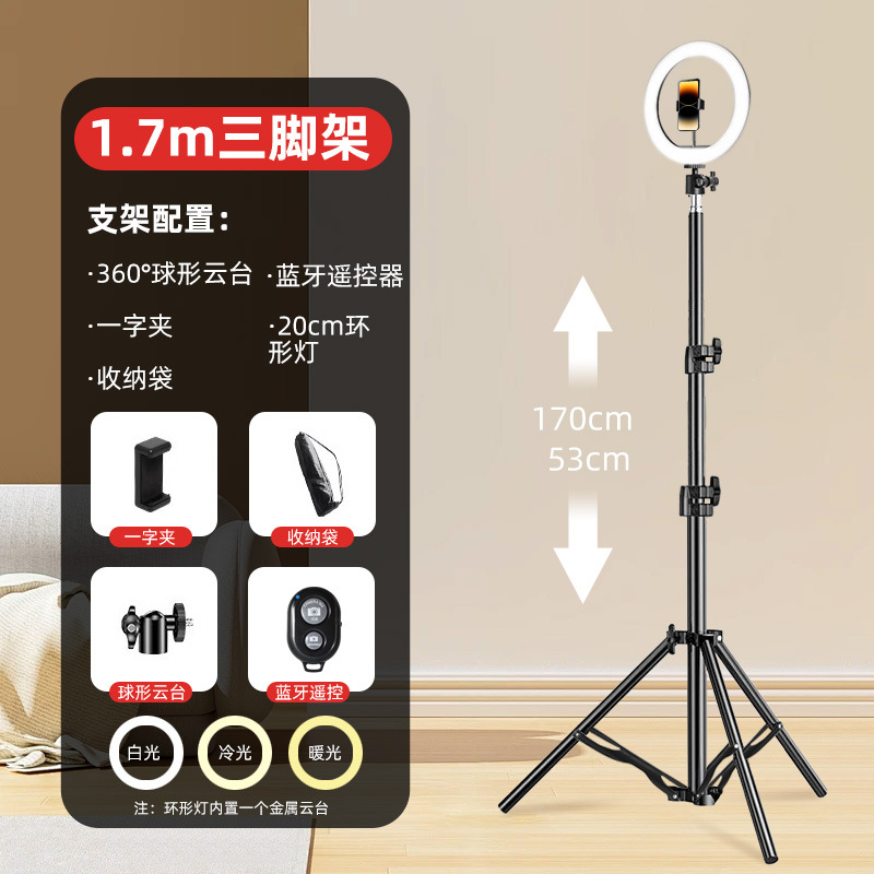 • [두꺼운 삼각대 1.7m개] 일체형 클립 + 볼 헤드 + 수납가방 + 블루투스 셀카 + 링라이트 8inch개