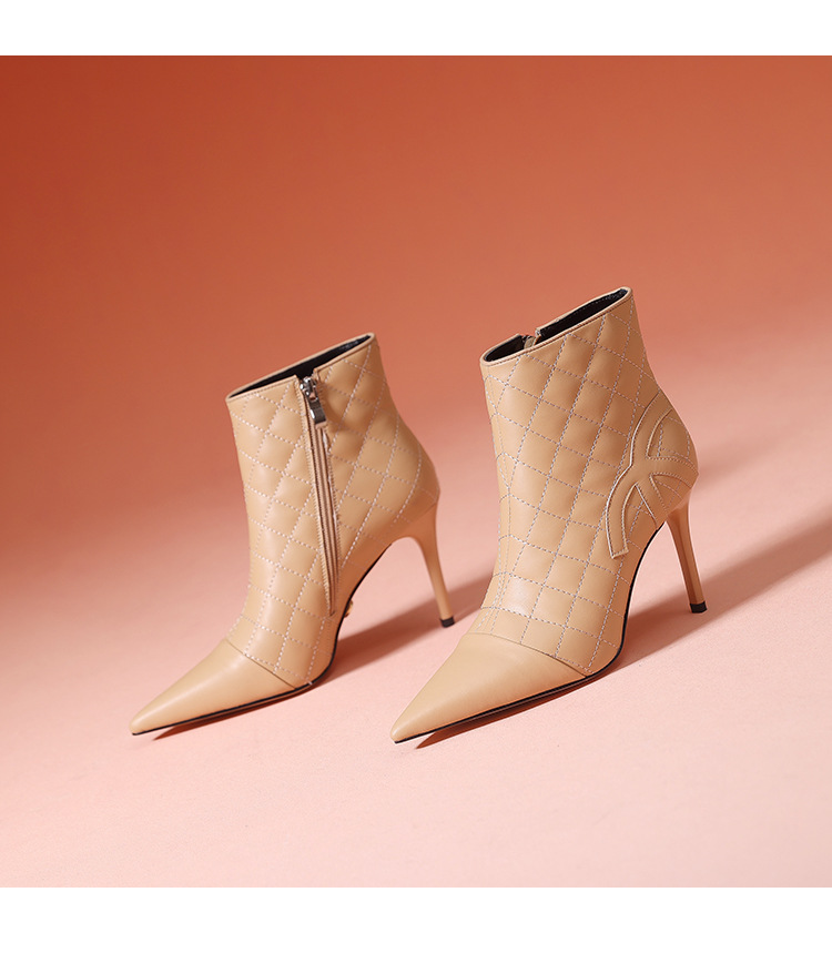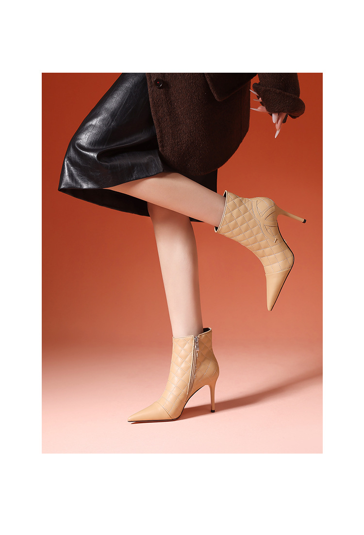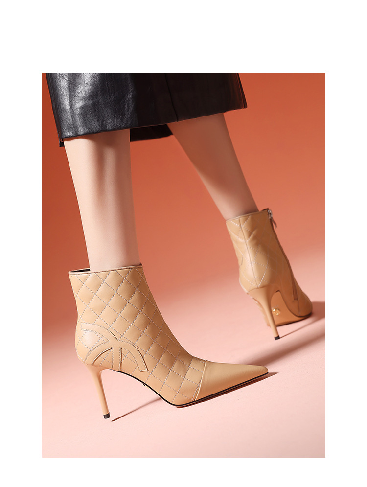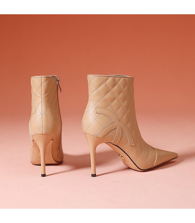 새로운 샤넬 스타일 양가죽 패션 부츠 여성 뾰족한 우아한 여성 마름모꼴 짧은 부츠 살구색 얇은 부츠