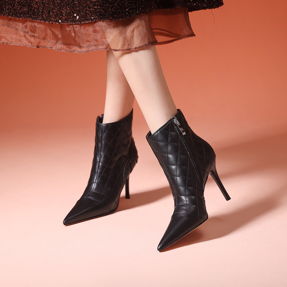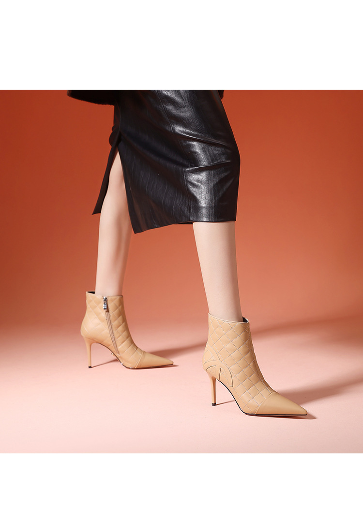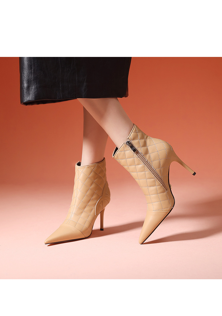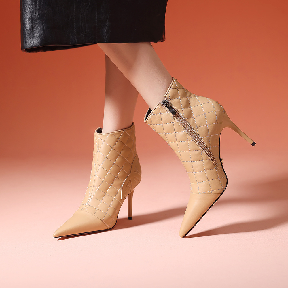 새로운 샤넬 스타일 양가죽 패션 부츠 여성 뾰족한 우아한 여성 마름모꼴 짧은 부츠 살구색 얇은 부츠