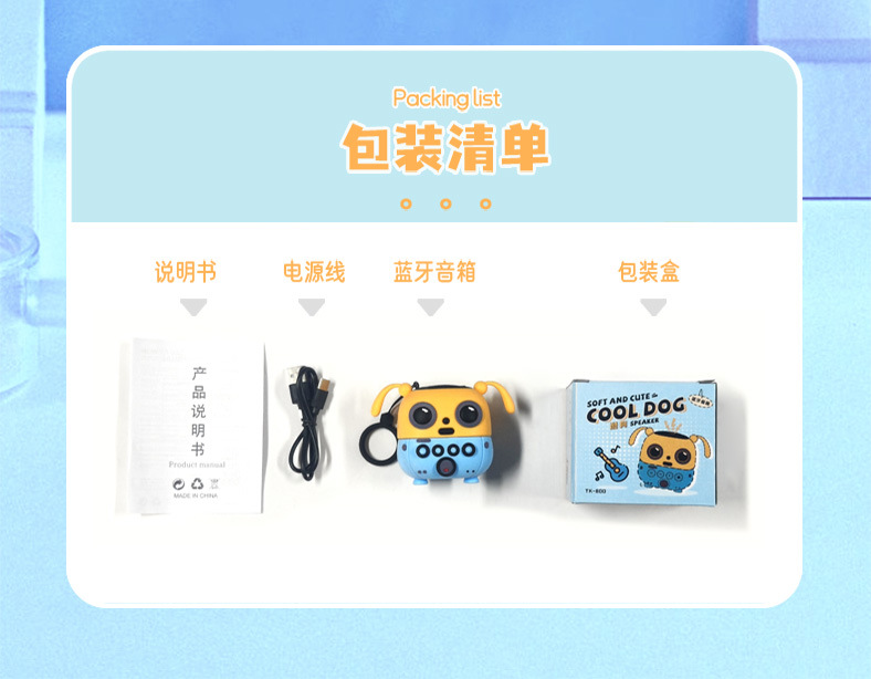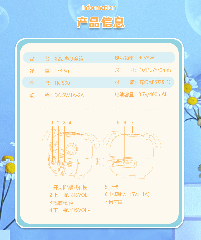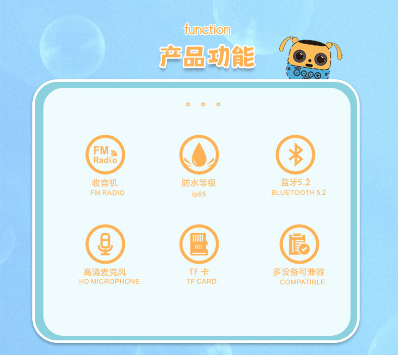 产品特点:内附尼龙挂绳,更适合户外运动携带,大尺寸重低音喇叭单元,一听就上瘾的小钢炮音质,表现强悍,低音强劲有力不沉闷,高音不刺耳,音色细节丰富,5.2低功耗蓝牙,连接稳定,支持蓝牙通话,400mAh可充电电池,续航持久,播放时长更持久。