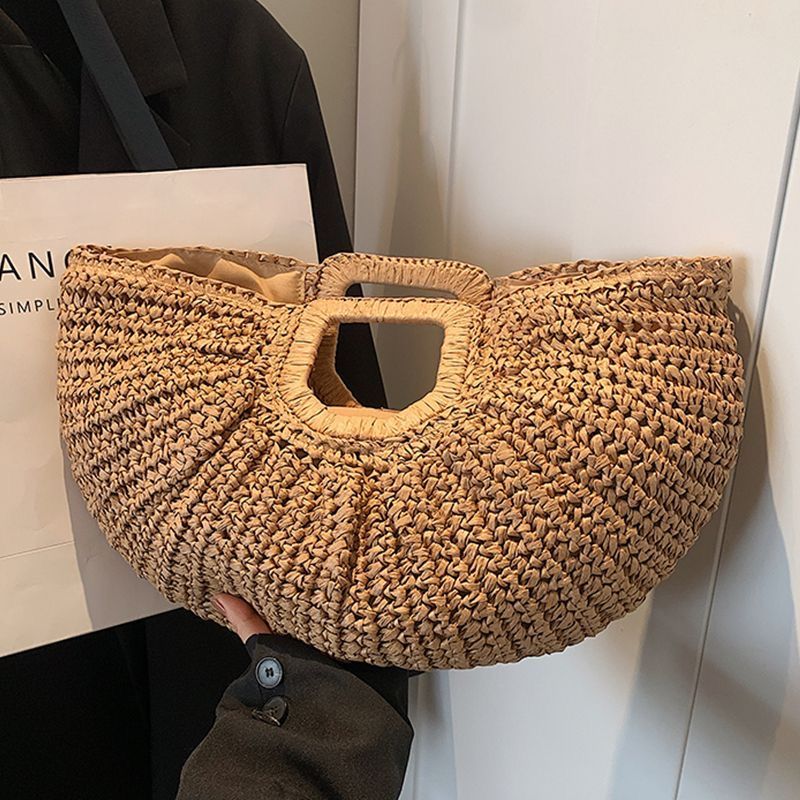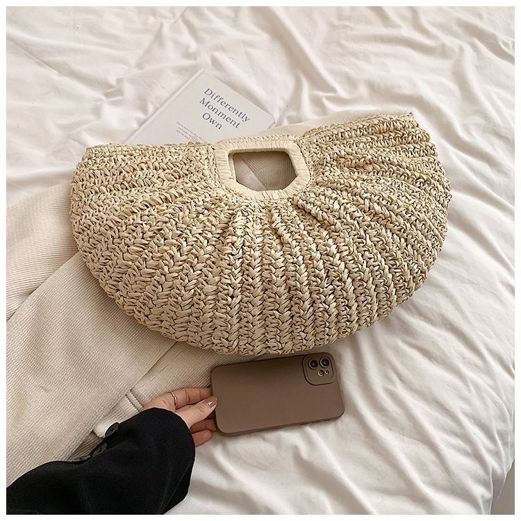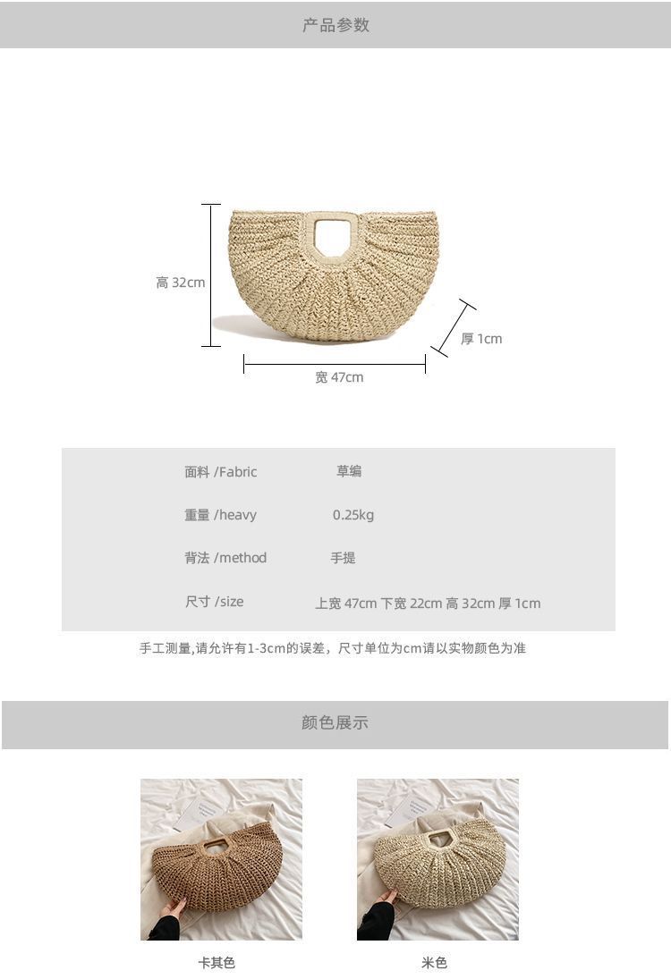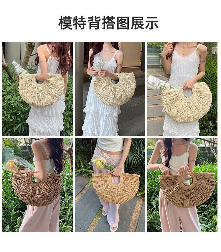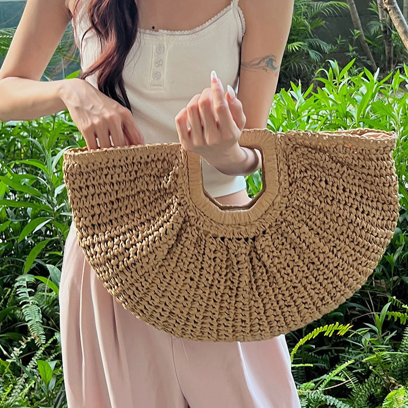 반원형 휴대용 밀짚가방, 부채꼴 손잡이 밀짚가방, 손으로 짠 가방, 다용도 달 모양 비치백, 토트백