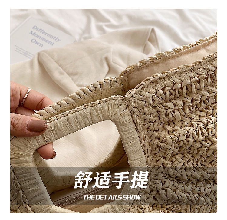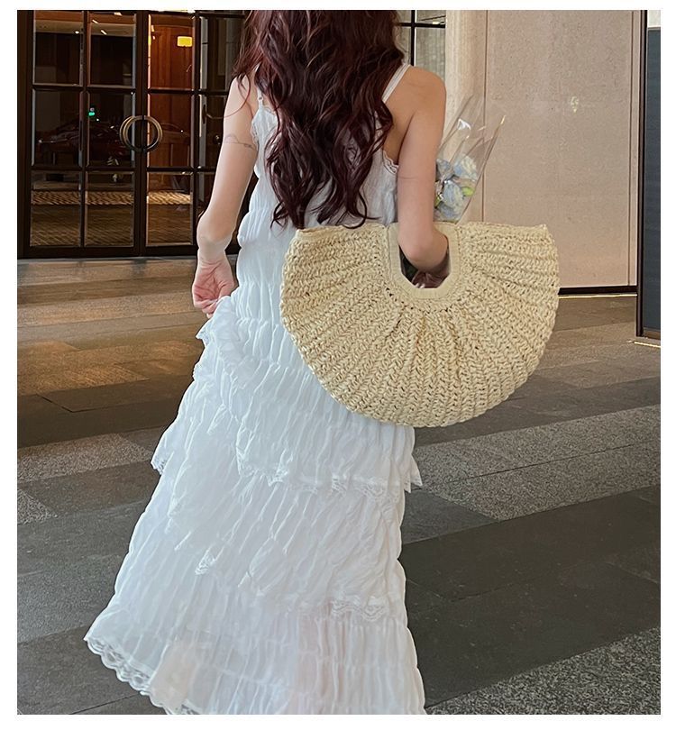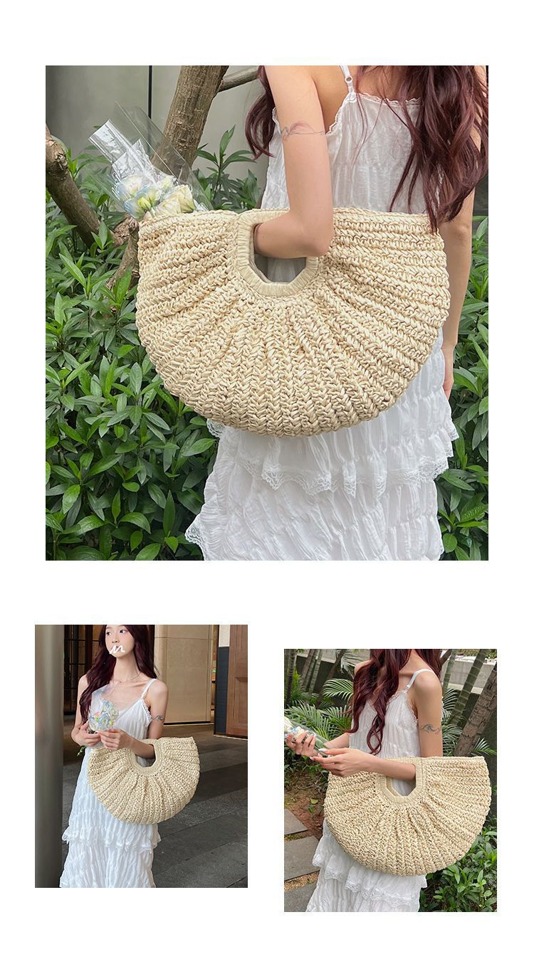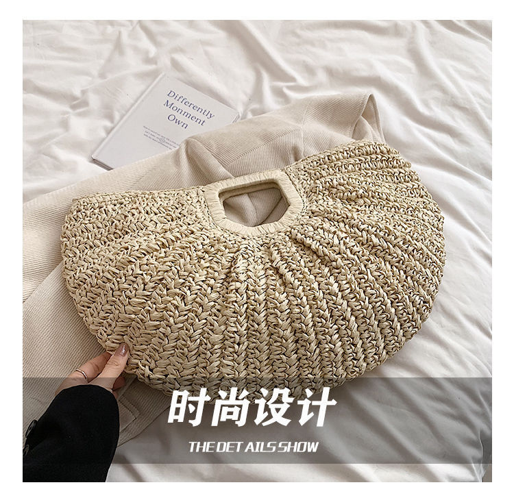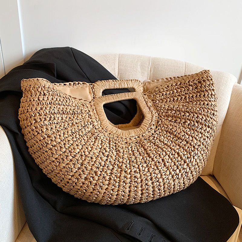 반원형 휴대용 밀짚가방, 부채꼴 손잡이 밀짚가방, 손으로 짠 가방, 다용도 달 모양 비치백, 토트백