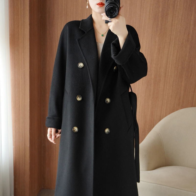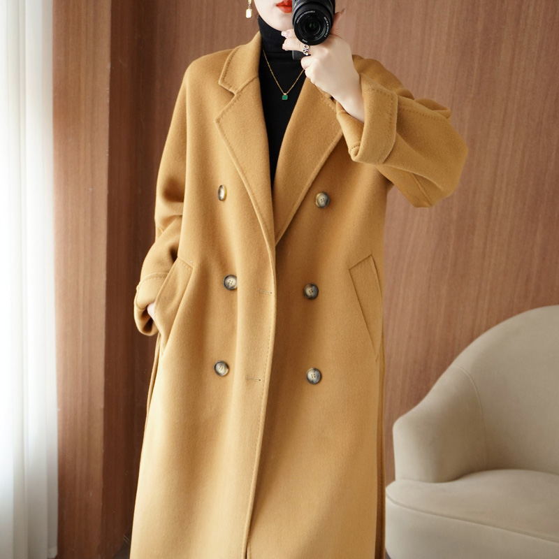 100 순수 양모 양면 캐시미어 코트 여자 겨울 고급 카멜 더블 브레스트 중장 양모 코트