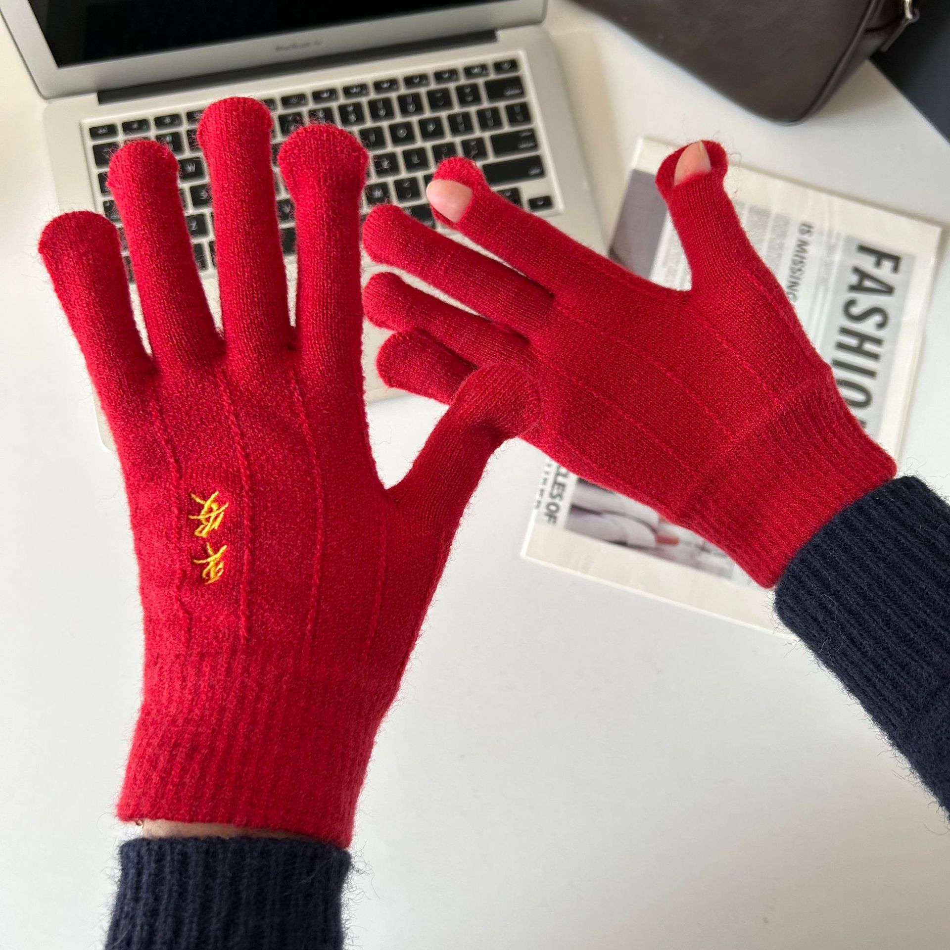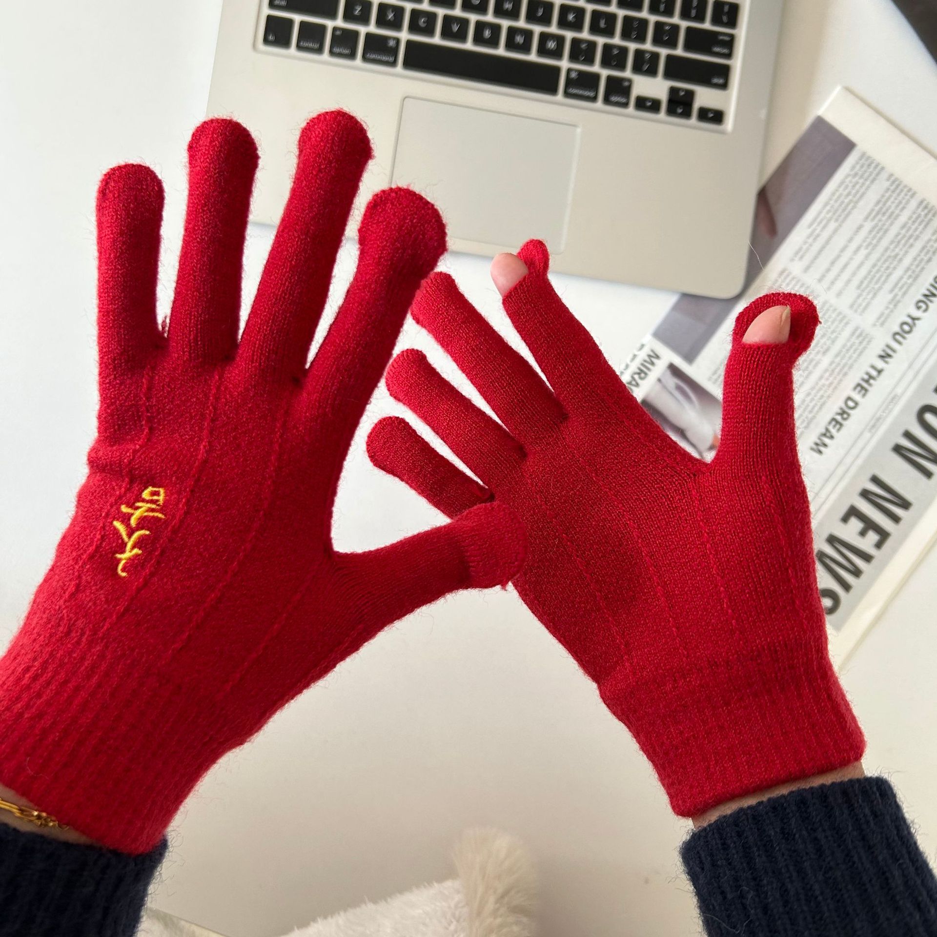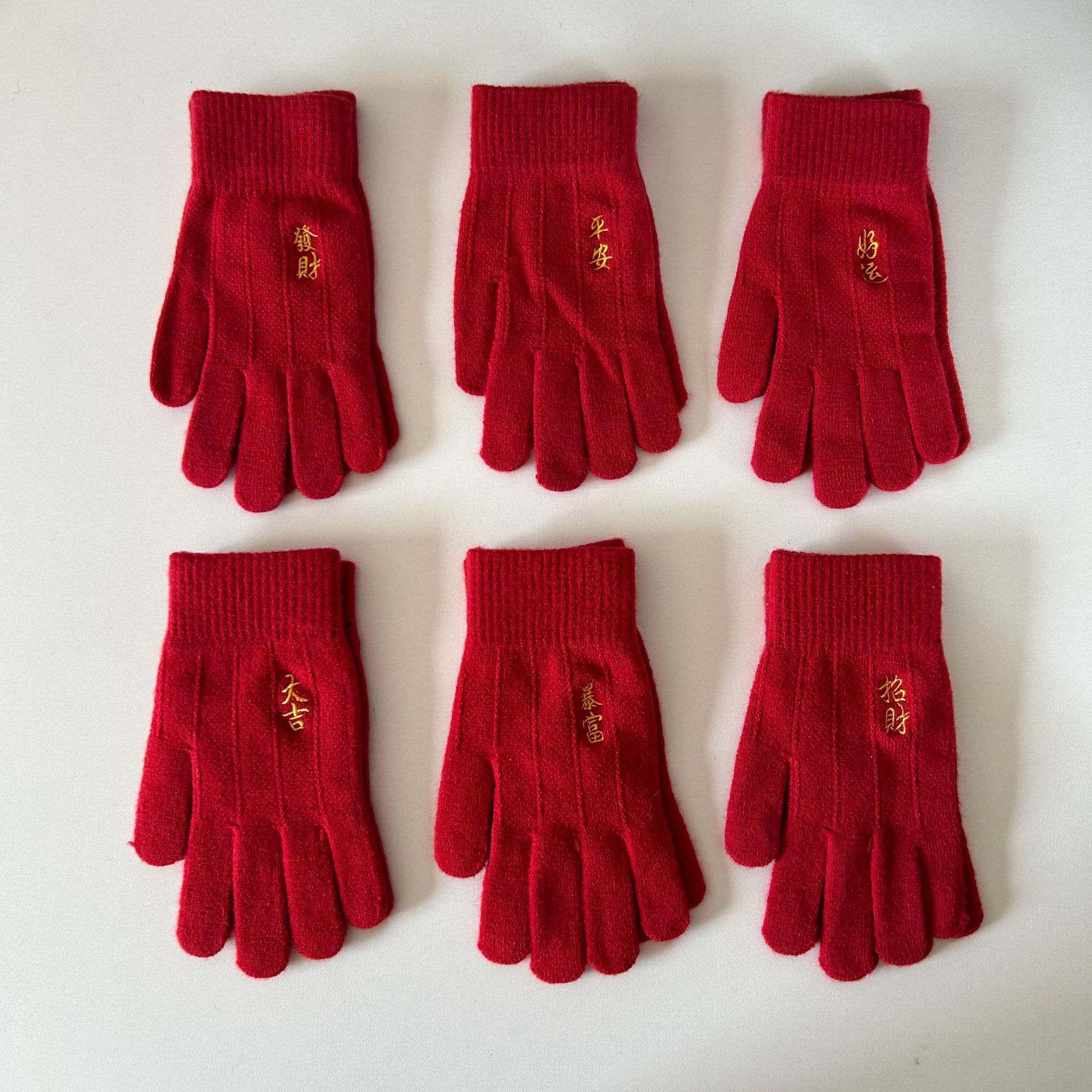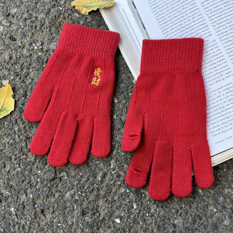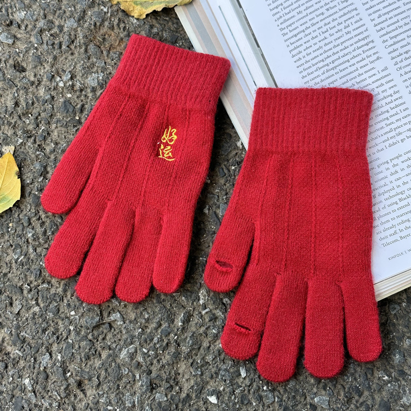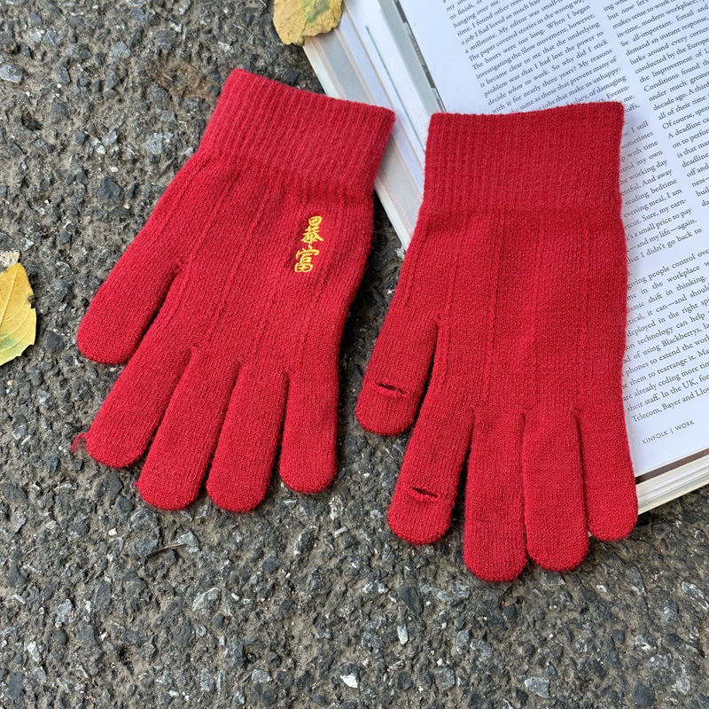 해피 레드 장갑 여성의 겨울 자수 중국 레드 5 손가락 따뜻한 사이클링 방풍 방화 터치 스크린