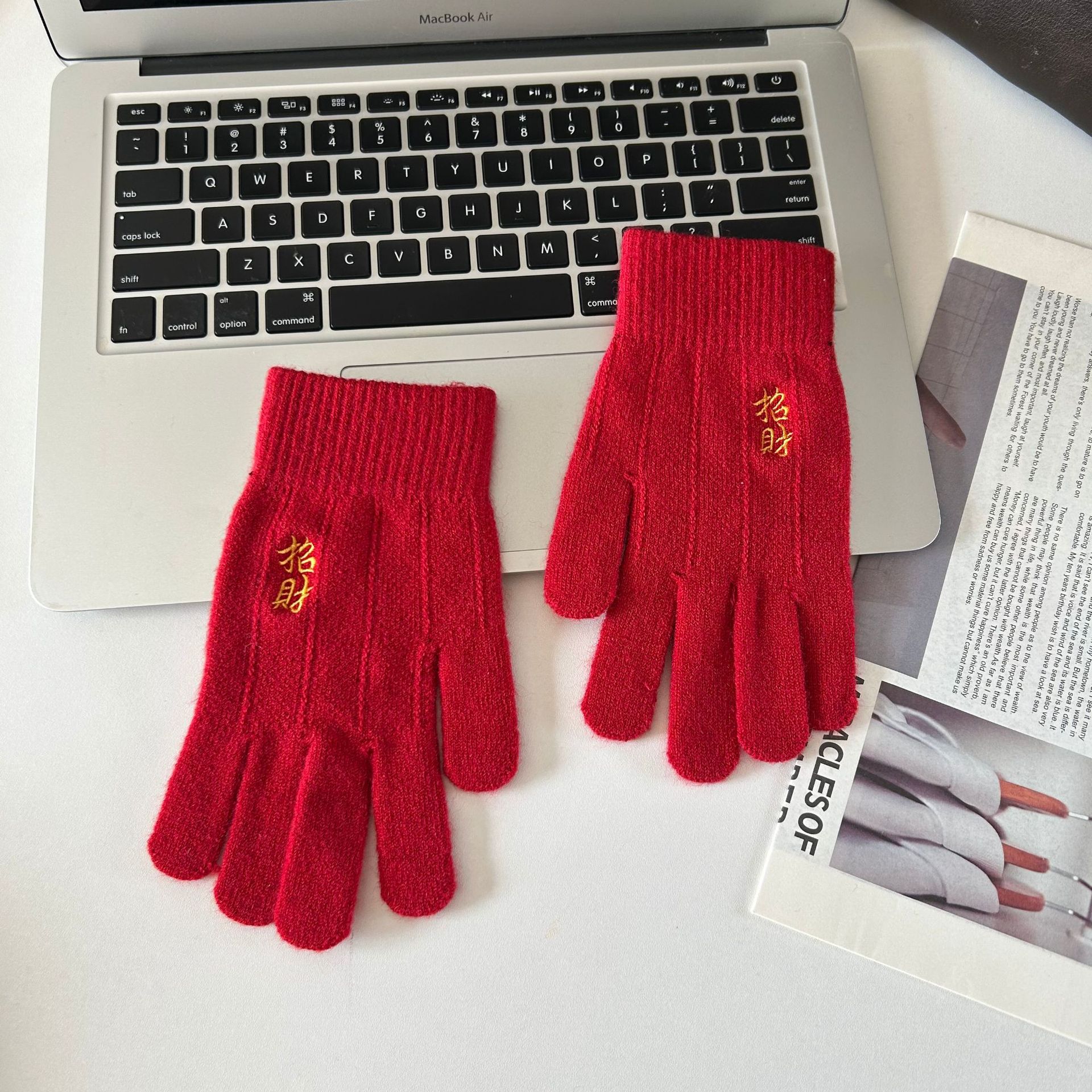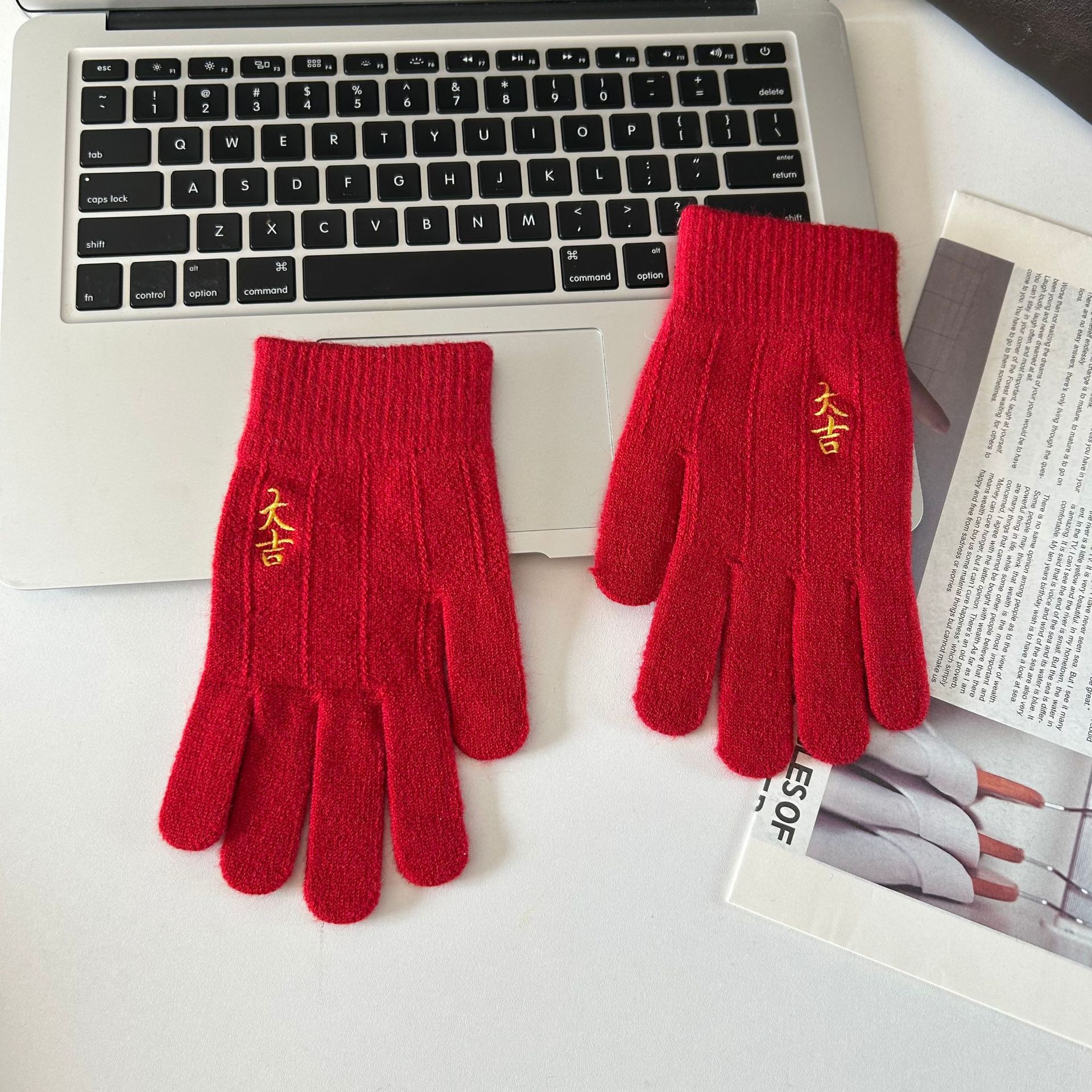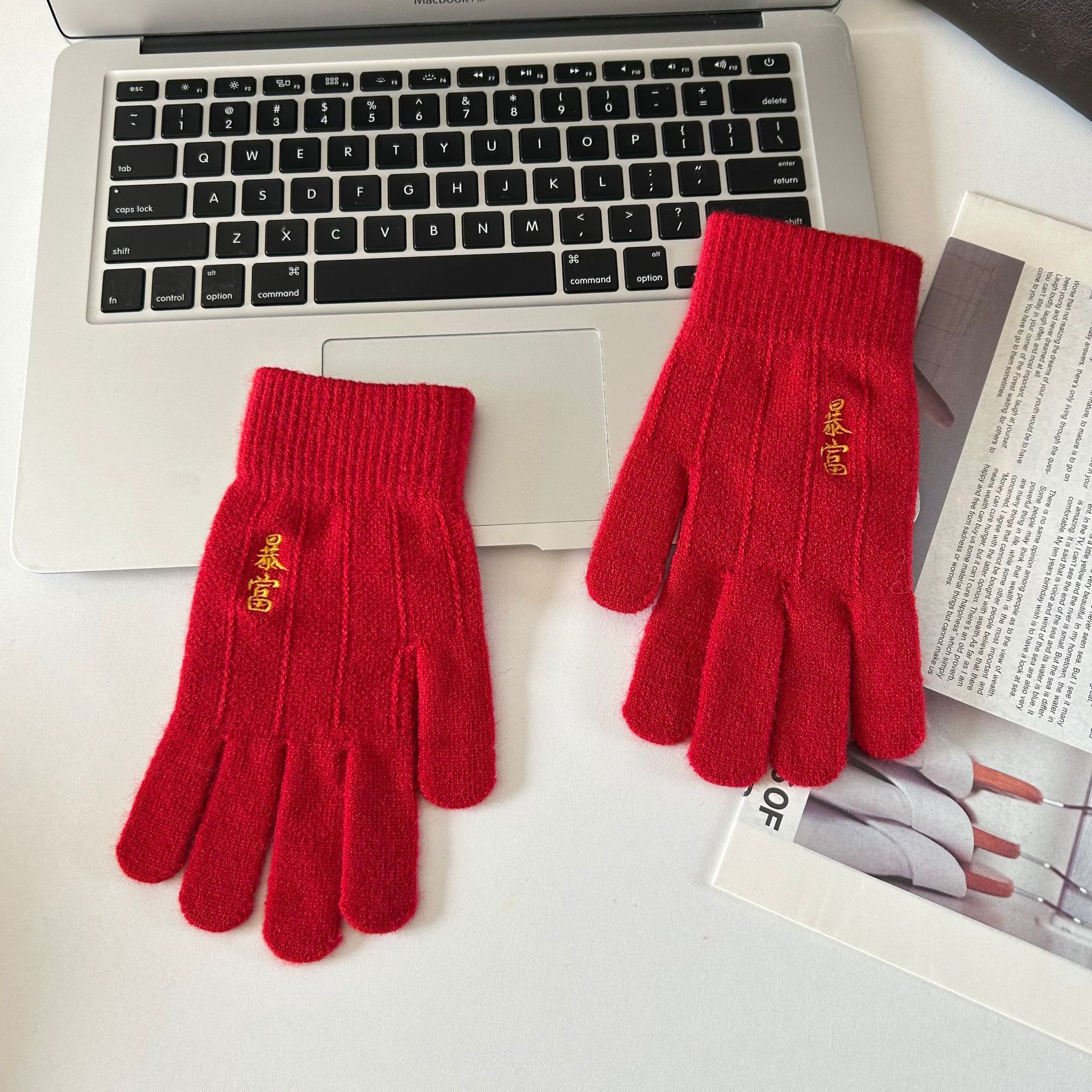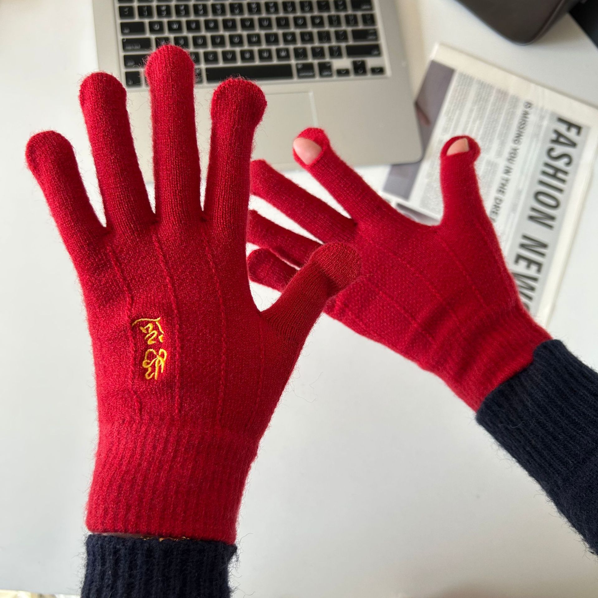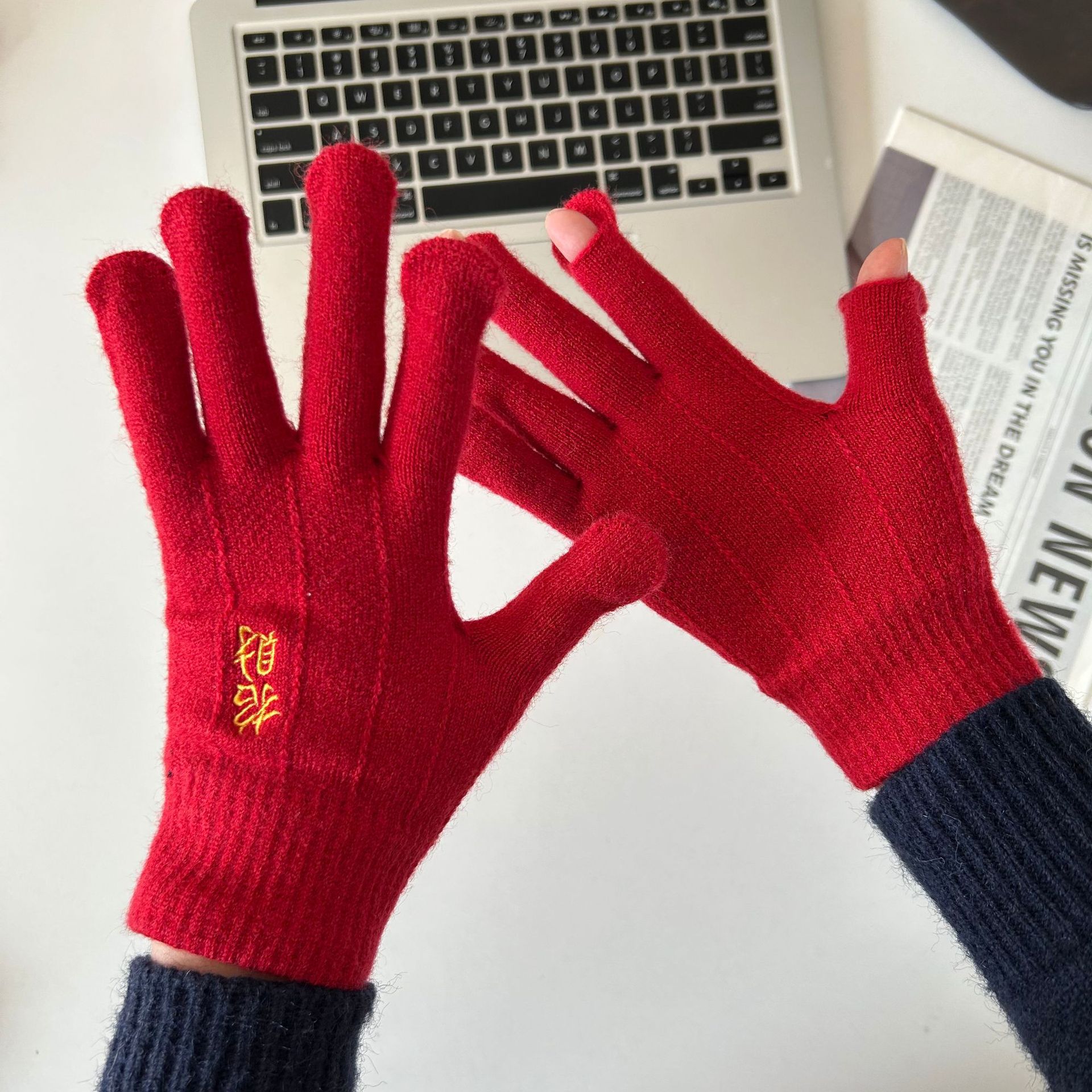 해피 레드 장갑 여성의 겨울 자수 중국 레드 5 손가락 따뜻한 사이클링 방풍 방화 터치 스크린