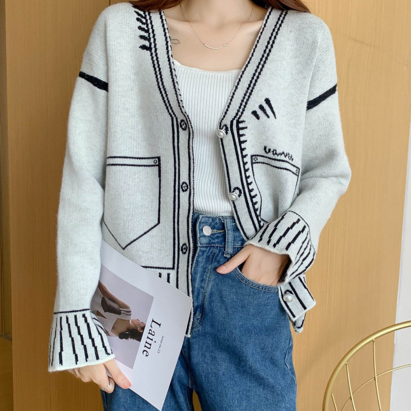 흑백 스웨터 디자인 센스 여성 틈새 코트 가을과 겨울 새로운 복장 느슨한 중간 길이의 니트 카디건 탑