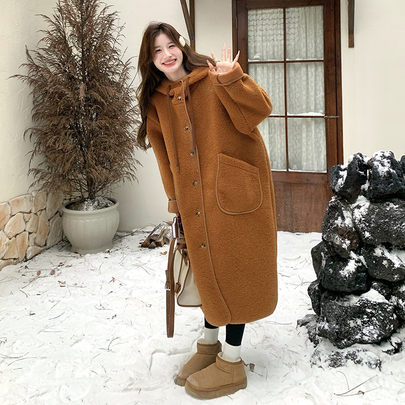 노란색 양털 일체형 코트 여성용 중간 길이 2024 겨울 신상 한국 스타일 루즈핏 따뜻하고 두꺼운스토어 가기