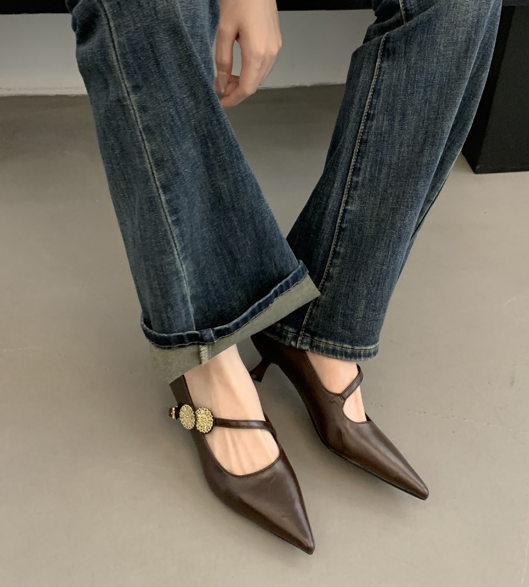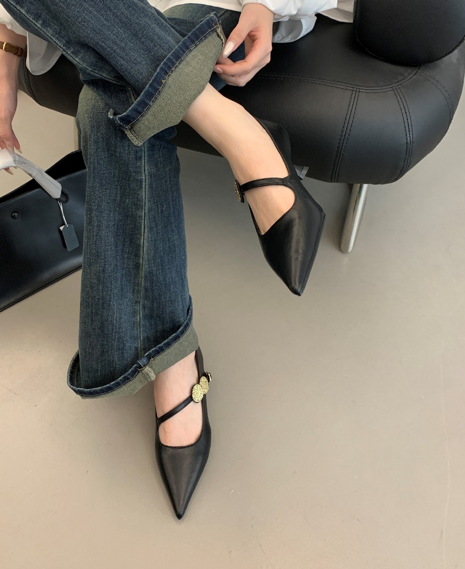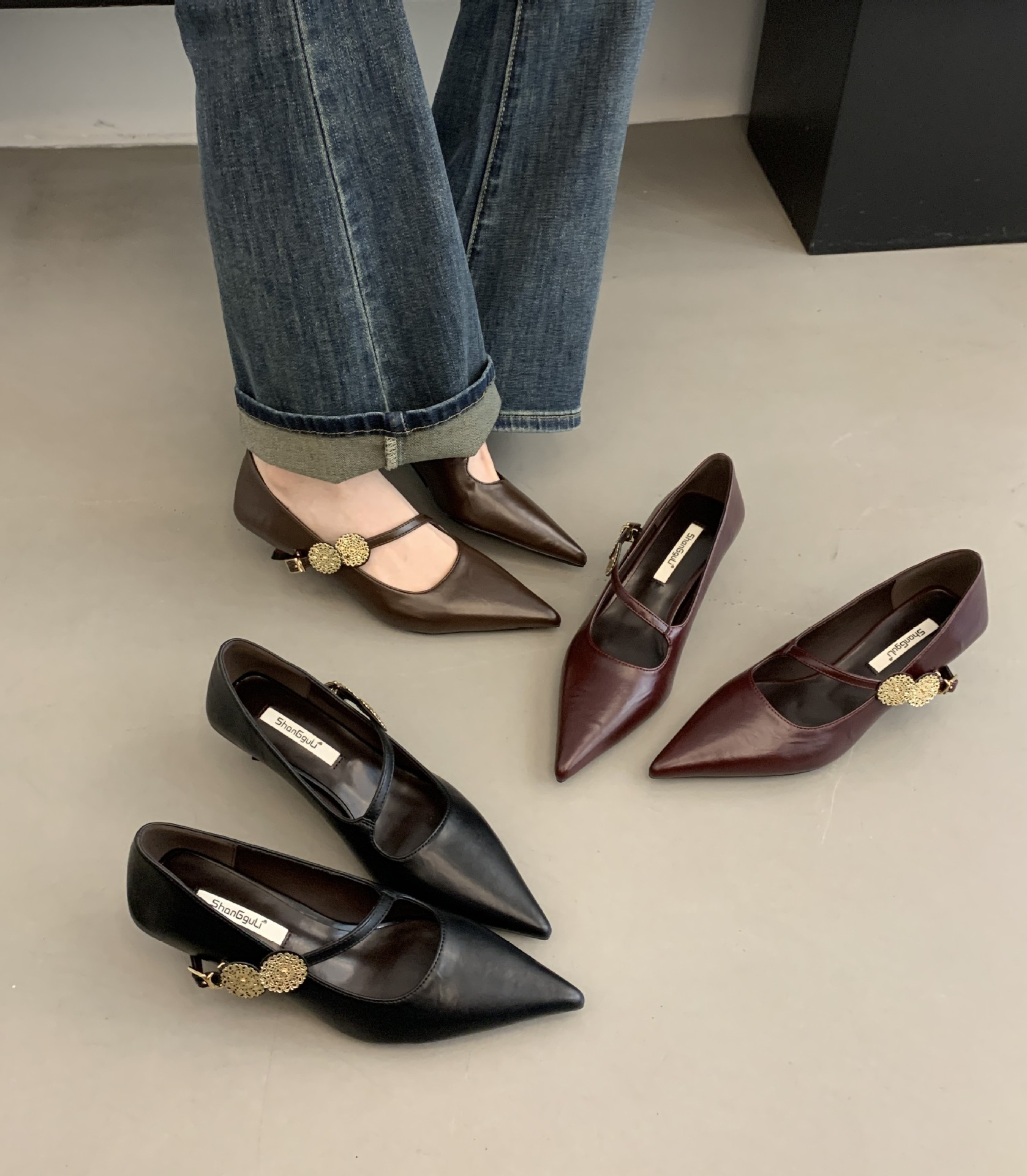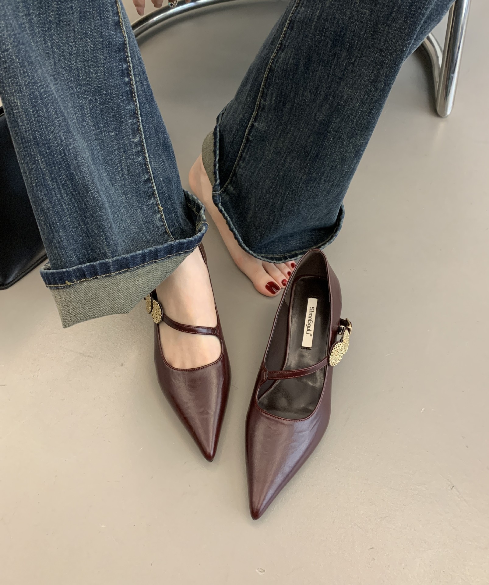 작은 향기로운 스타일 메리 제인 얕은 입 싱글 레이어 신발 여성의 2025 가을 새로운 포인팅 늦은 저녁 스타일 플랫 하단 작은 가죽 신발