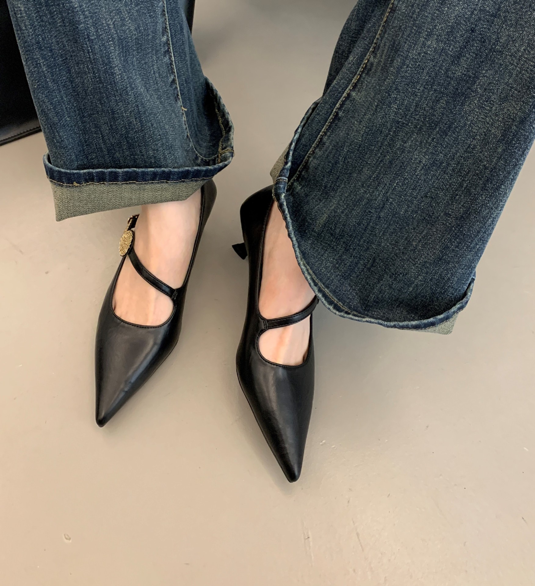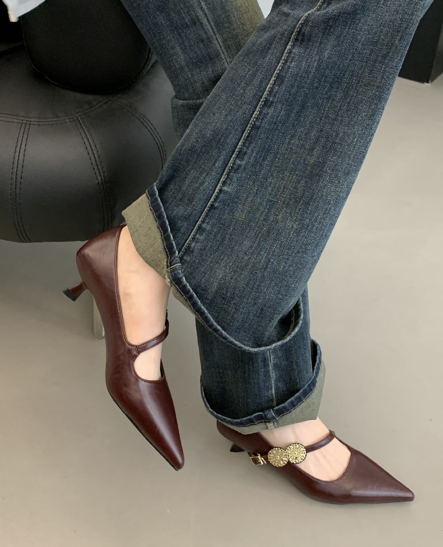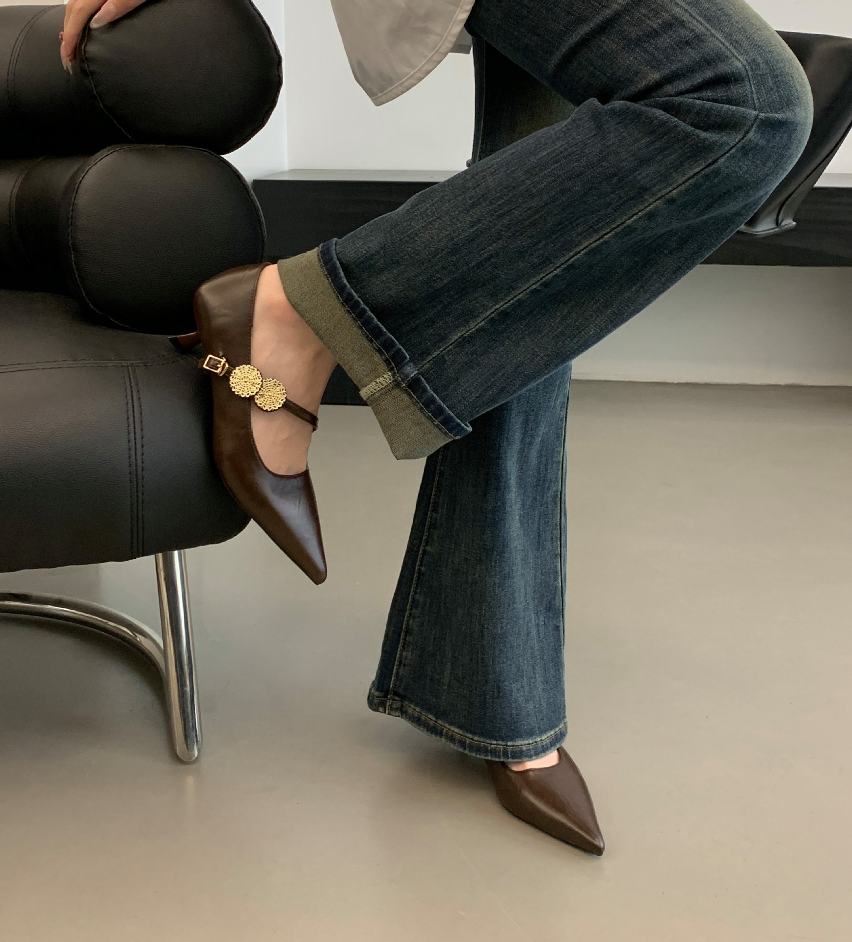 작은 향기로운 스타일 메리 제인 얕은 입 싱글 레이어 신발 여성의 2025 가을 새로운 포인팅 늦은 저녁 스타일 플랫 하단 작은 가죽 신발