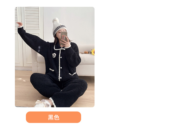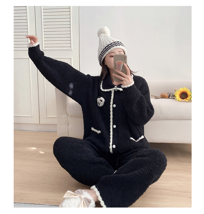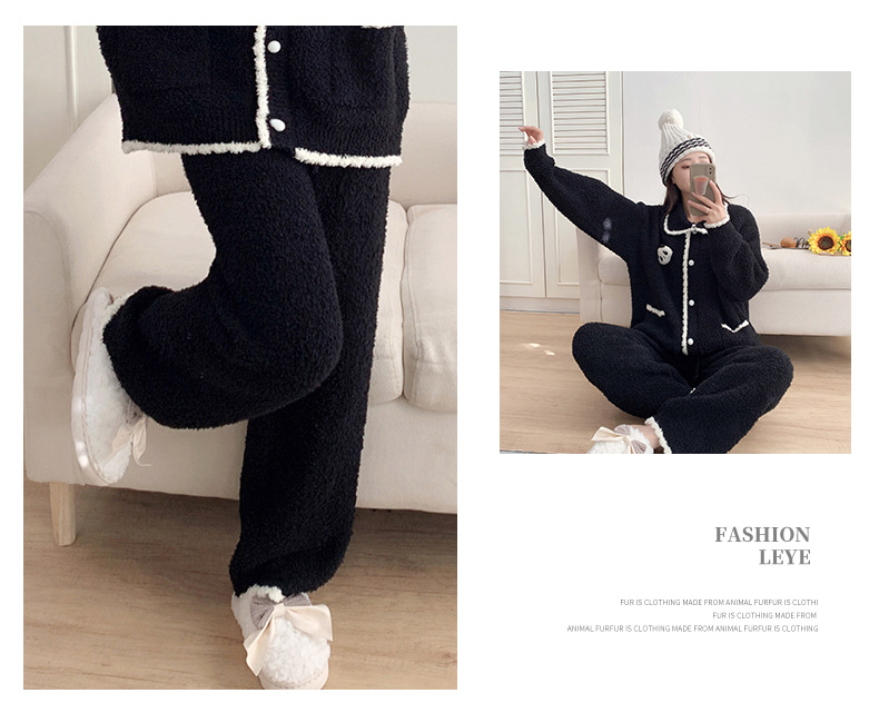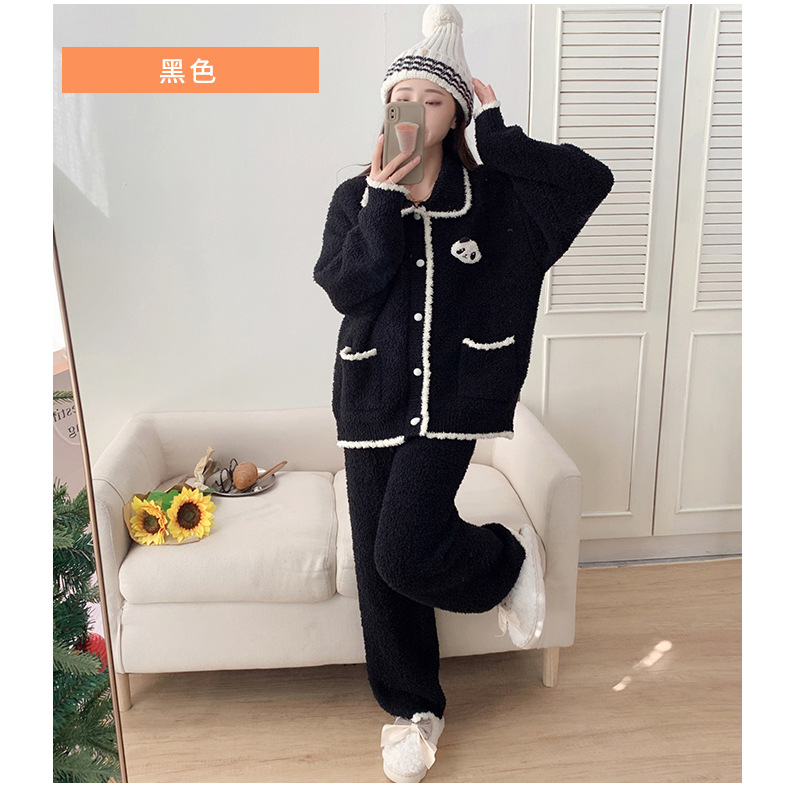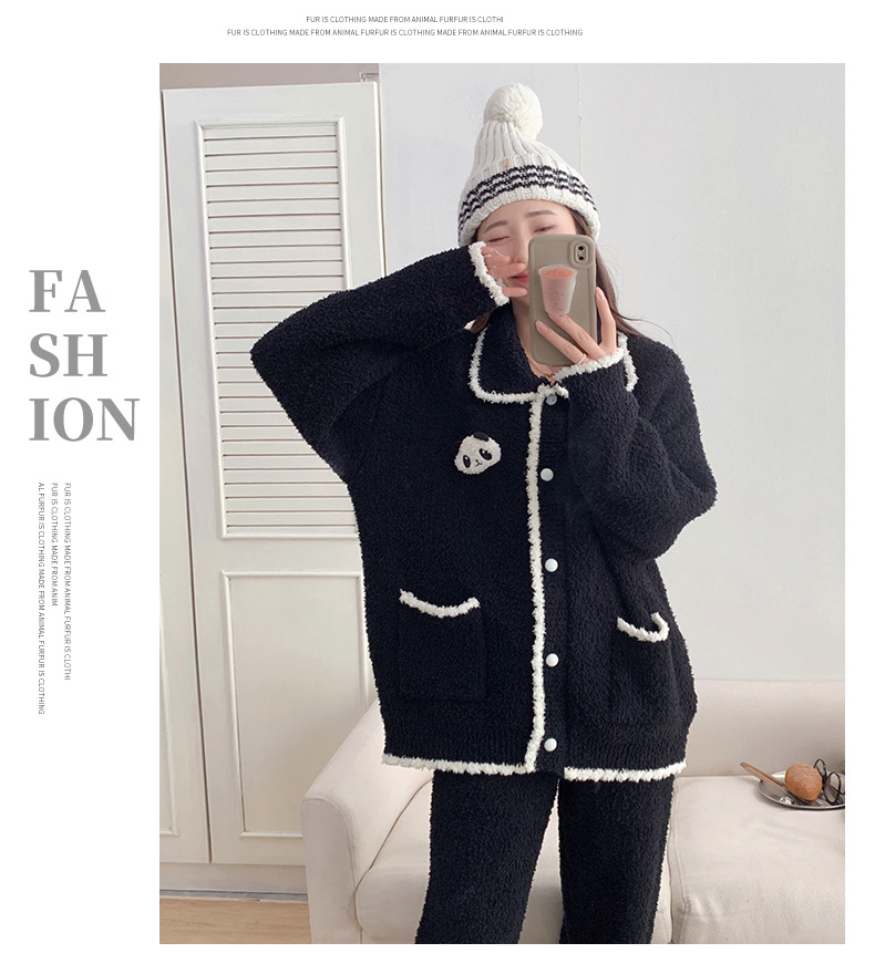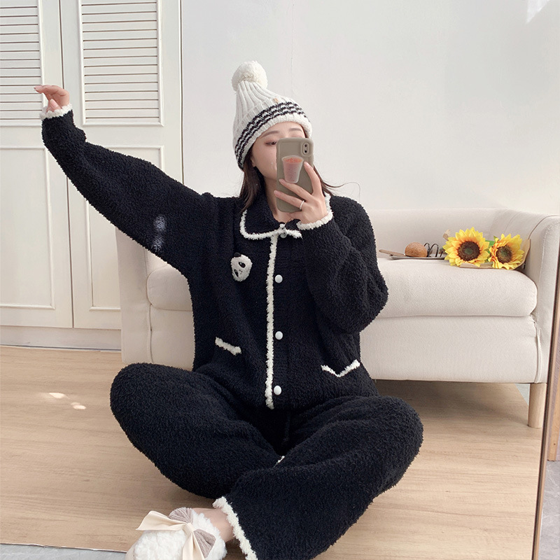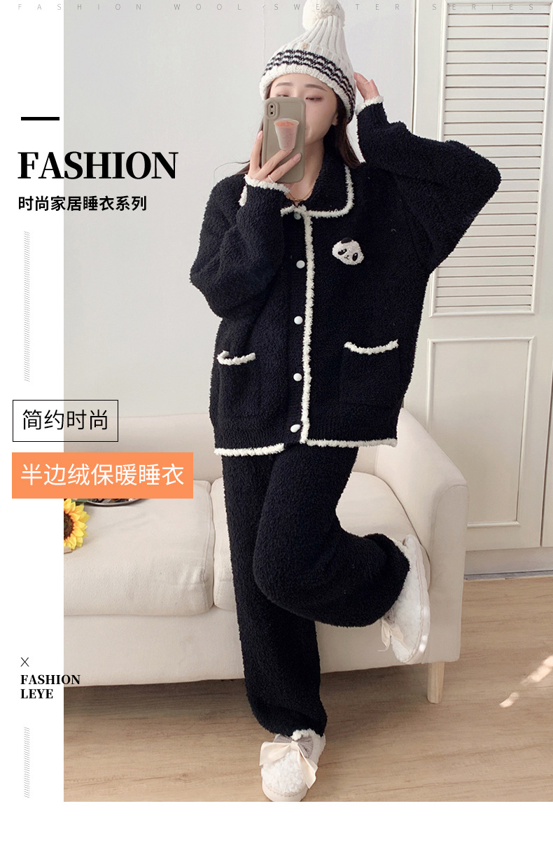 겨울 귀여운 만화 부드러운 반쪽 벨벳 파자마 여성 기모 두꺼운 외부 옷깃 홈 옷 세트
