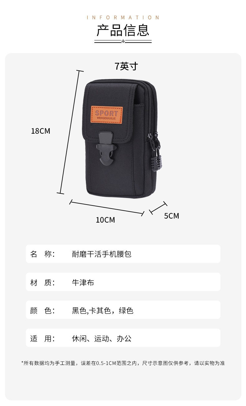 남성 가방 수직 버클 옥스포드 천 휴대 전화 허리 가방 캐주얼 착용 벨트 휴대 전화 가방 전술 허리 가방