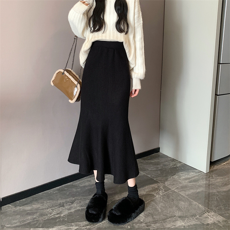가을과 겨울 올매치 두꺼운 니트 스커트 슬리밍 중간 길이 A 라인 스커트 달콤하고 뜨거운 스타일 슬림 핏 하이 허리 피쉬 테일 스커트 여성용