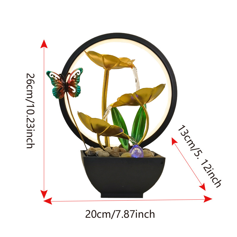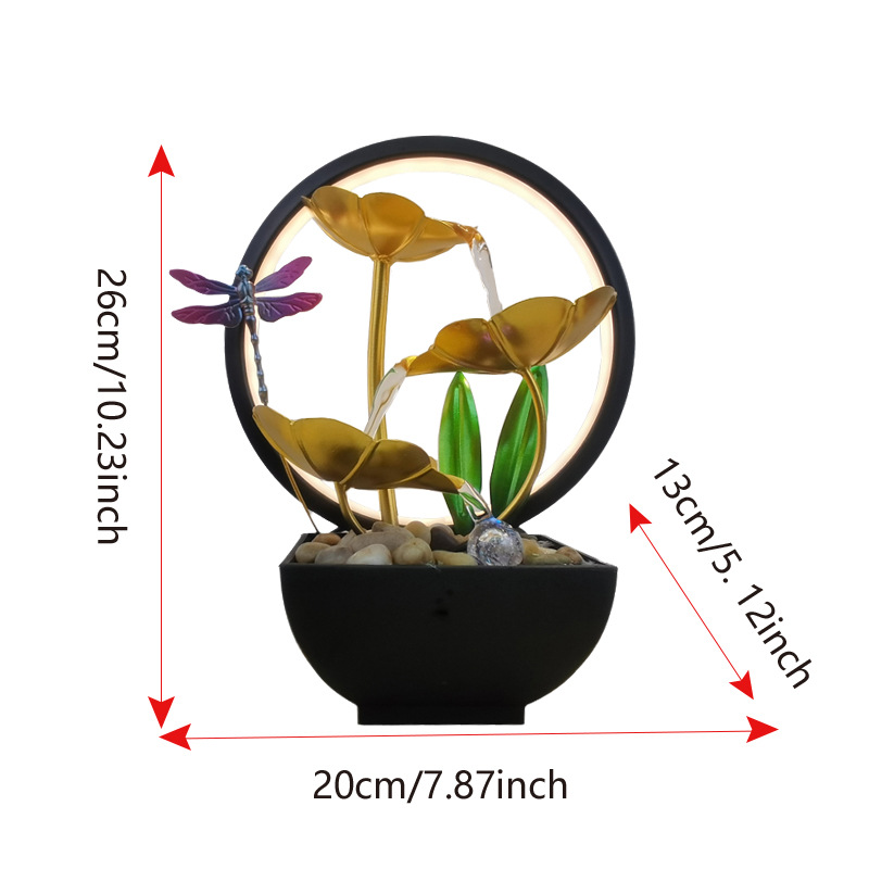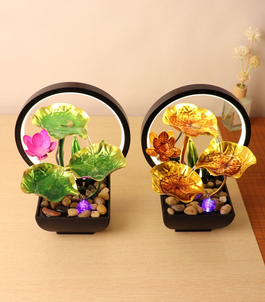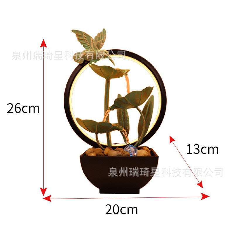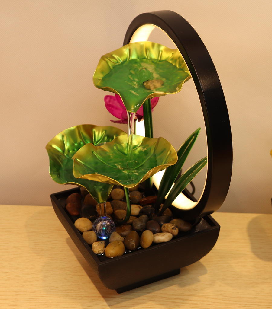 행운의 풍수 장식품, 순환하는 물, 탁상용 철제 장식품, 흐르는 물 장식품, 라이트 링이 있는 황금색 녹색 연잎스토어 가기