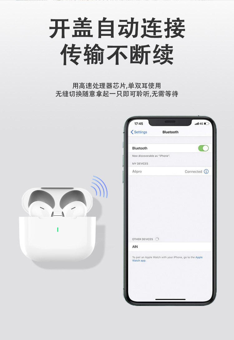 새로운 A6pro 무선 블루투스 헤드셋 456 세대 소음 감소 긴 배터리 수명은 사과 귀 머리 공장에 적합합니다.스토어 가기